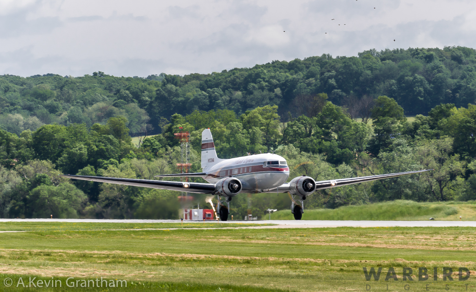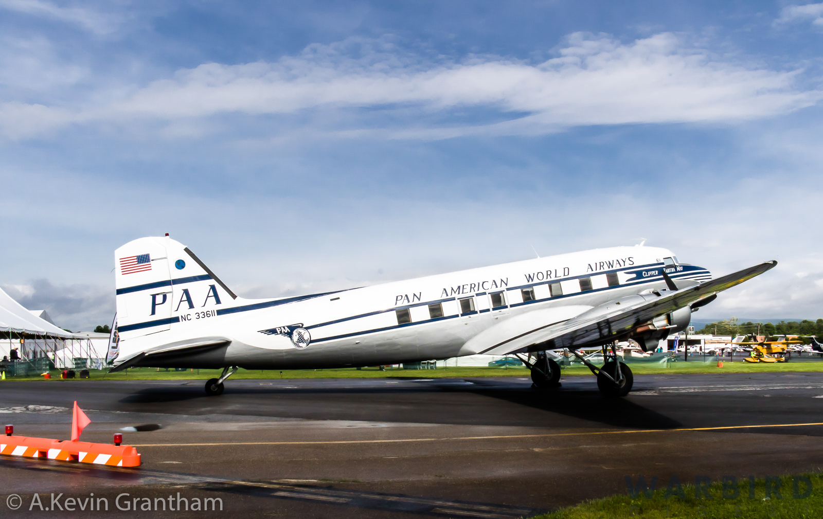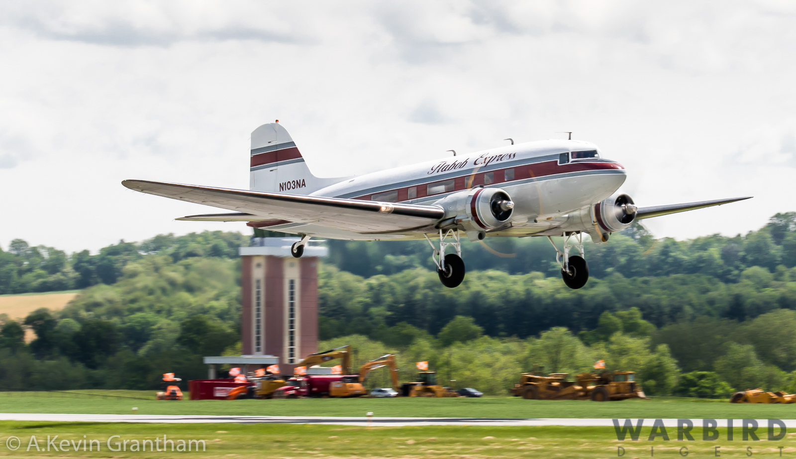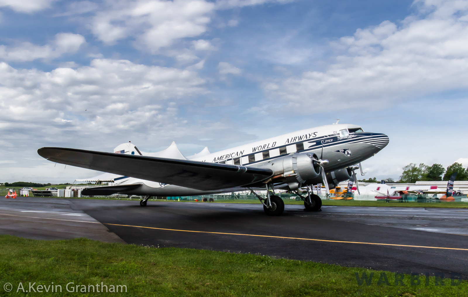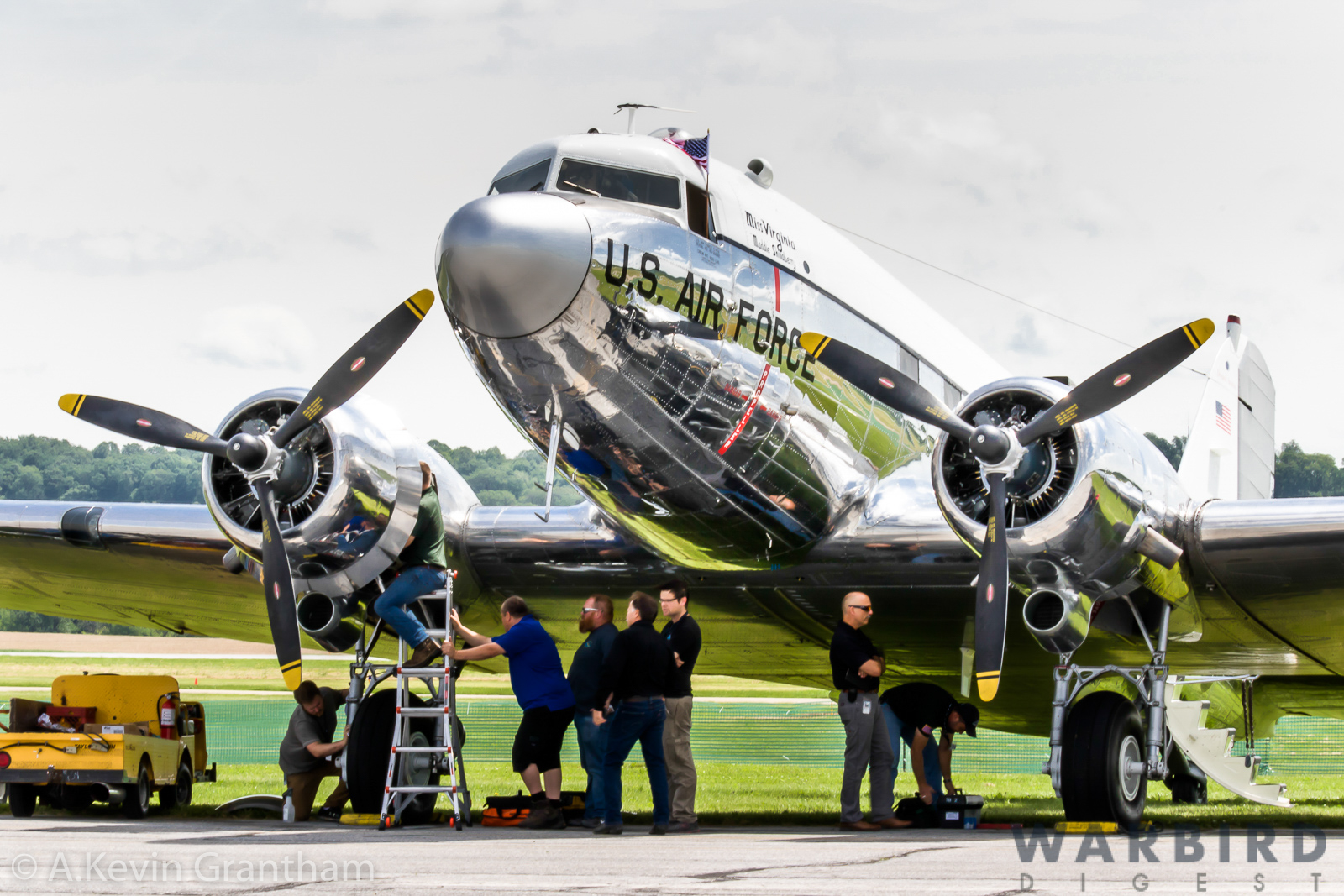 While the other five Douglas transports were preparing for their massed takeoff, Miss Virginia had to stand down due to a fuel pump issue on her starboard engine. You can see the maintenance personnel working on her innards in this shot. (photo by A.Kevin Grantham)