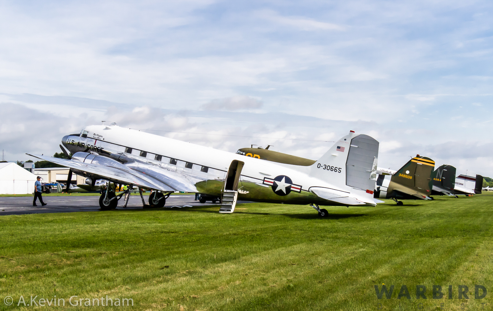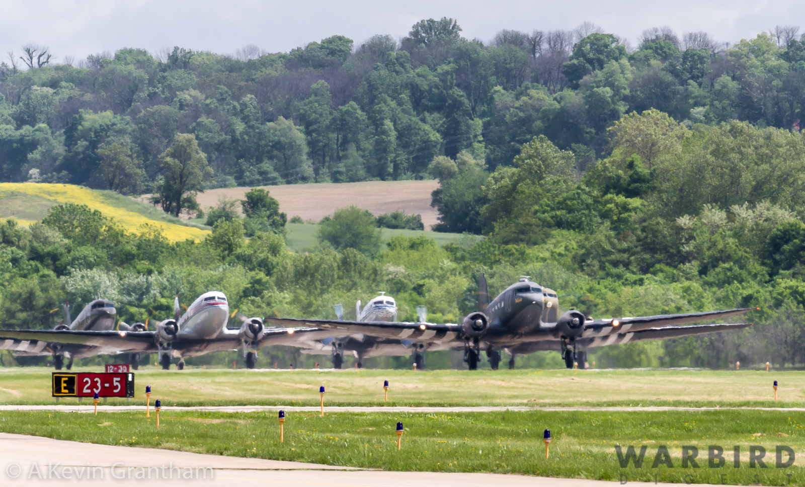 The C-47 lineup at Frederick last Friday. These aircraft are all in Oxford, Connecticut now, preparing for their journey to Europe in celebration of the 75th anniversary of the D-Day invasion. (photo by A.Kevin Grantham)