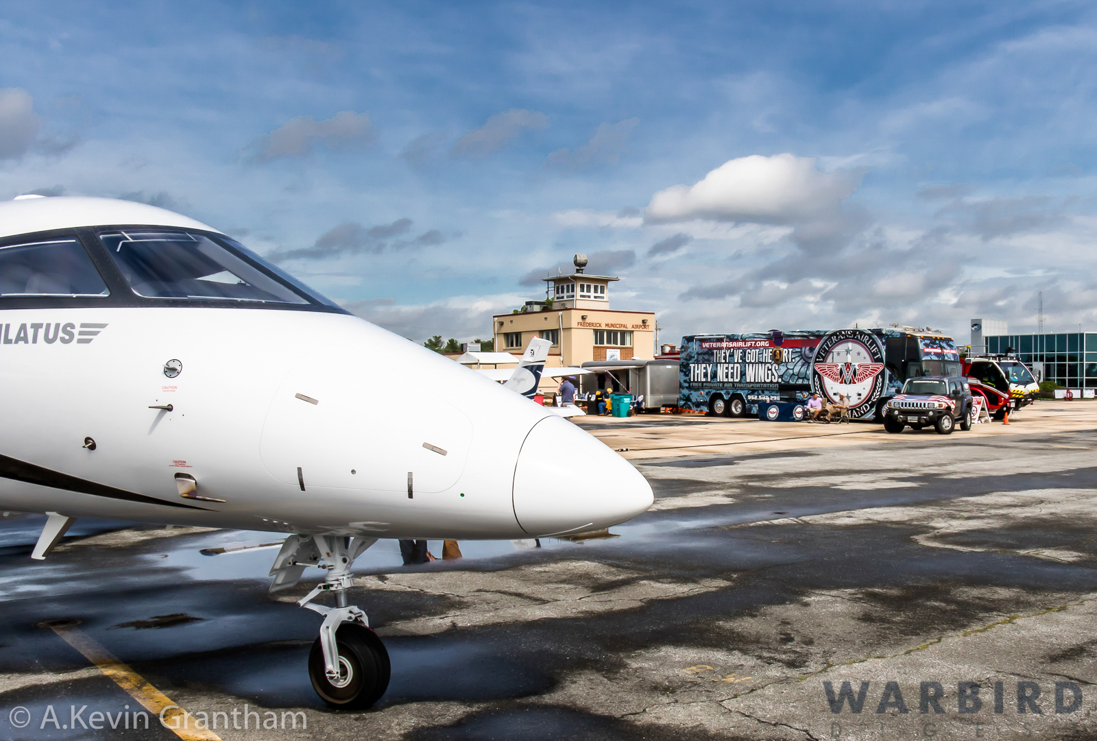The nose of a brand new Pilatus PC-24 executive jet is seen hear, with Frederick Municipal Airport’s control tower in the background. (photo by A.Kevin Grantham)