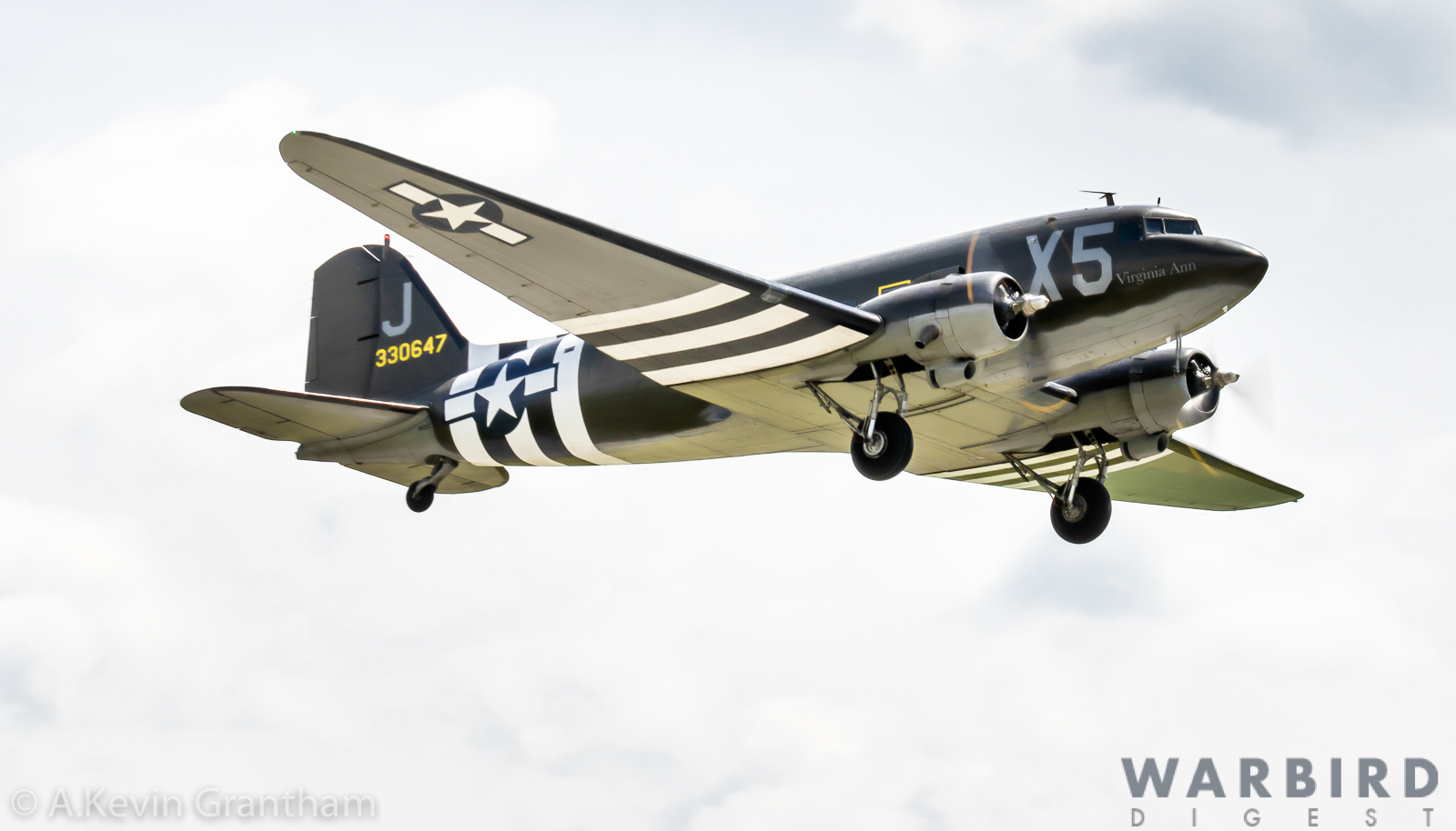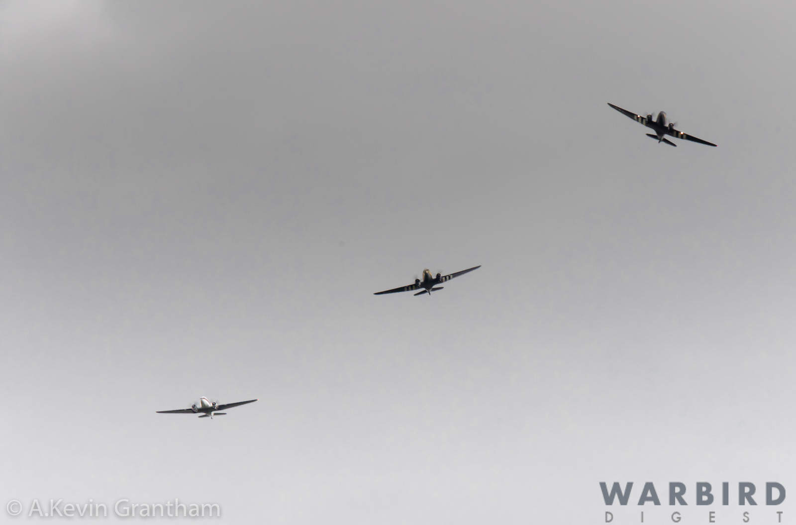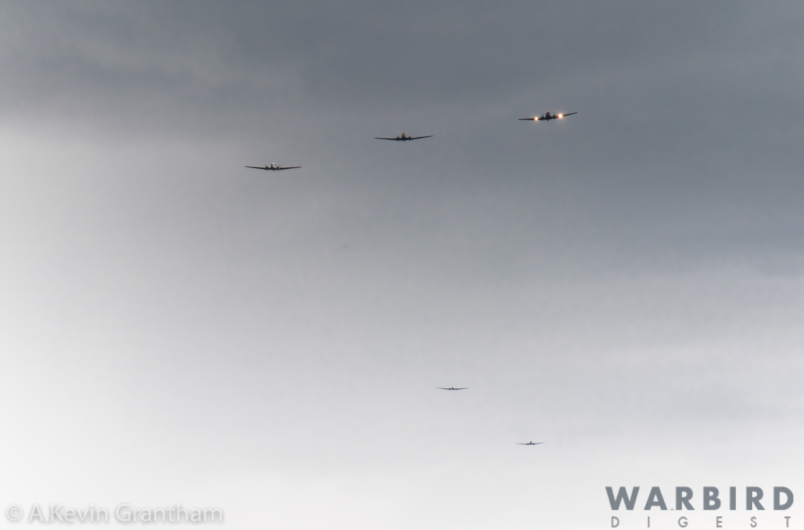 The weather conditions were less than ideal, with rain storms moving through the region on an almost hourly basis at times. Despite the inclement weather, and the hobbling of one aircraft (Miss Virginia) due to a fuel pump issue, five of the six C-47s on hand were able to successfully carry out the formation flight over the nation’s capitol.