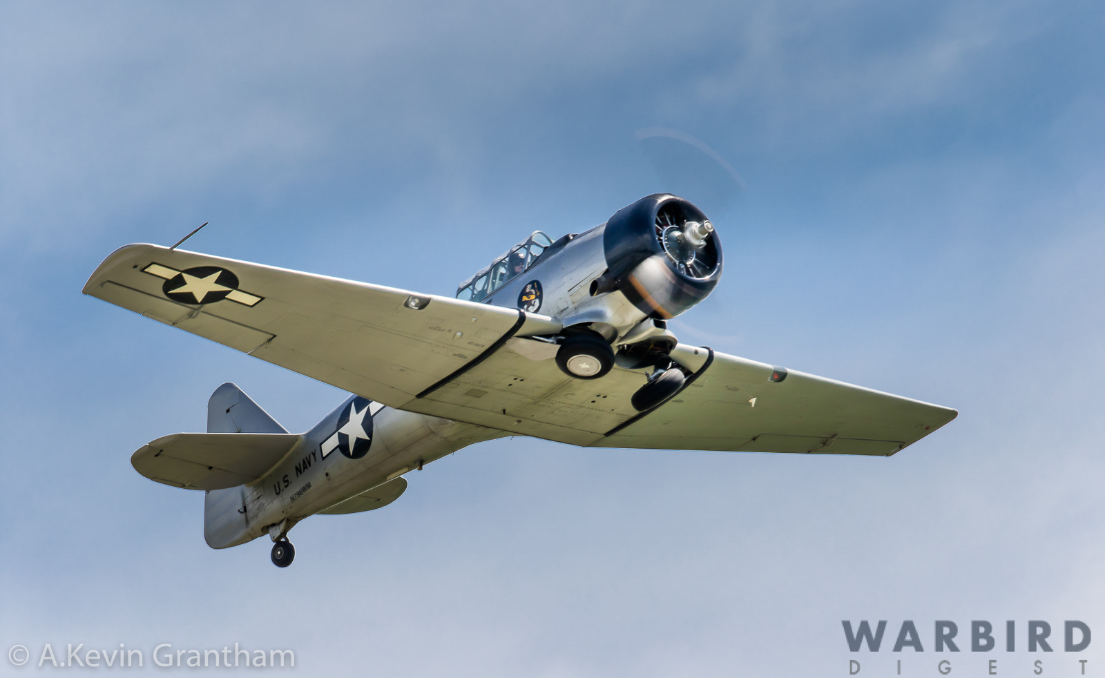 The Harvard Mk.III camera ship rolling up her gear before heading in search of the C-47 formation. (photo by A.Kevin Grantham)