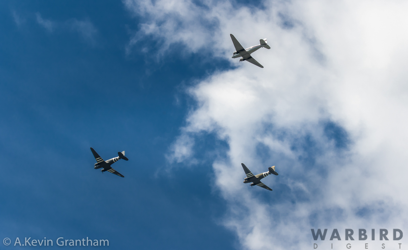 Placid Lassie leads two of the five C-47s in formation as they pass over Frederick on their way to Washington, DC. (photo by A.Kevin Grantham)