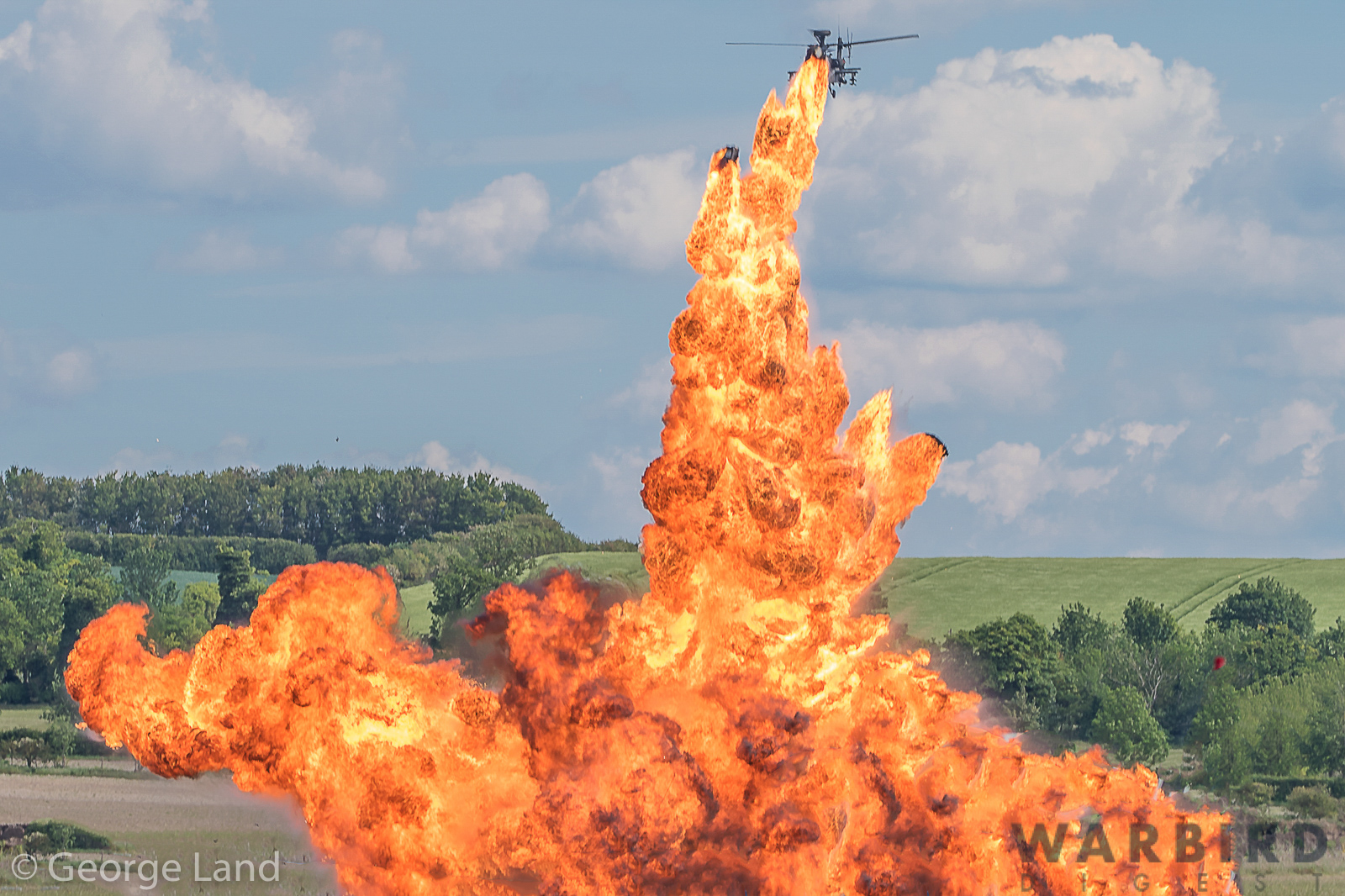 Pyrotechnics exploding behind the departing Augusta Westland WAH-64 Apache AH1 ZJ231, No3 Regiment, Army Air Corp, Wattisham. (photo by George Land)