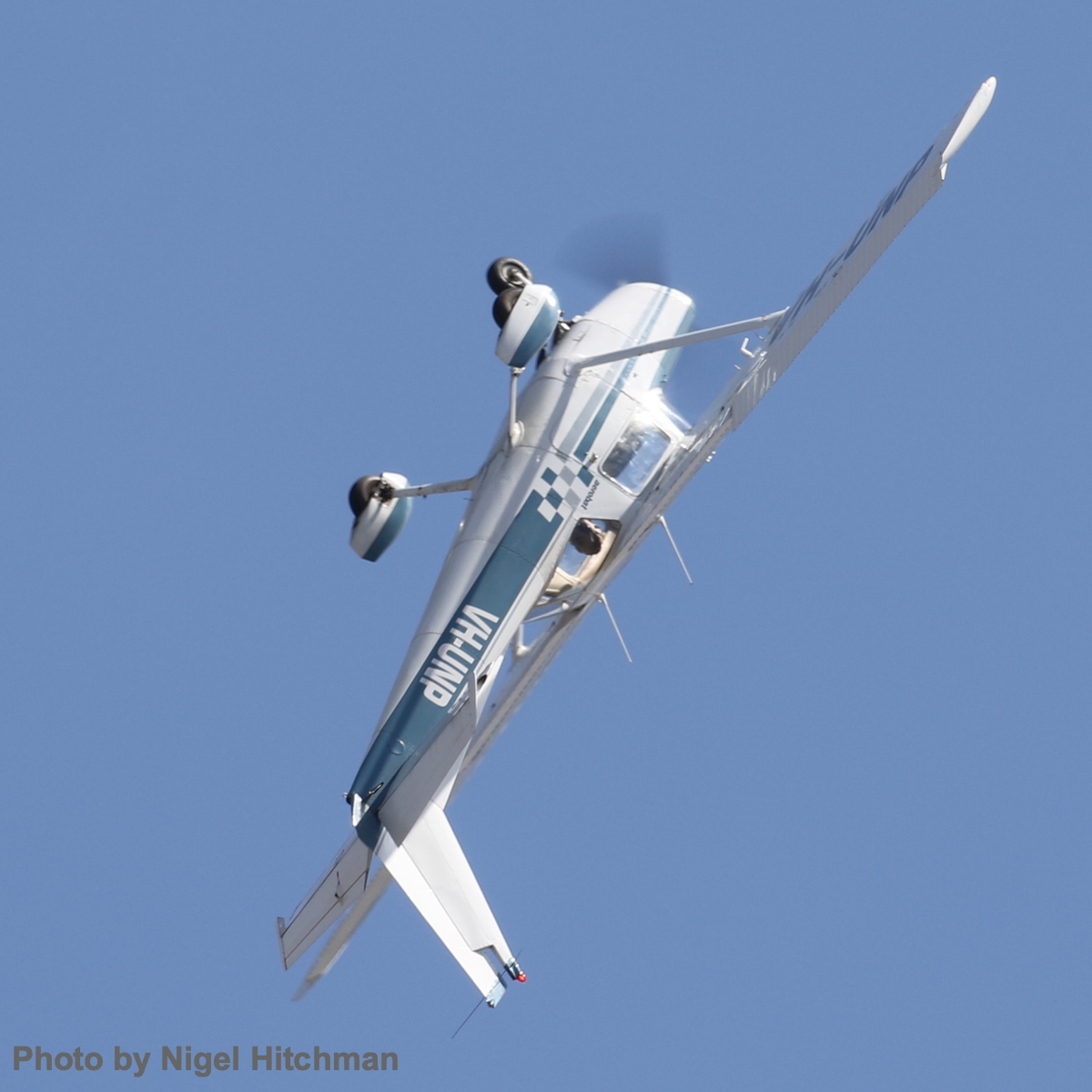 The exciting modern aerobatics were mostly from the Paul Bennet Airshows stable, with the Wolf Pitts Pro, Extra A300, Edge 540, and included a car versus aircraft race and pyros. Seeming like throwing a saloon car around the sky, in contrast, was Gerard Lappin’s full aerobatic display in the venerable club Cessna 152 Aerobat, VH-UNP, including the classic ‘taking the aircraft behind the trees’ beyond the field and then reappearing.