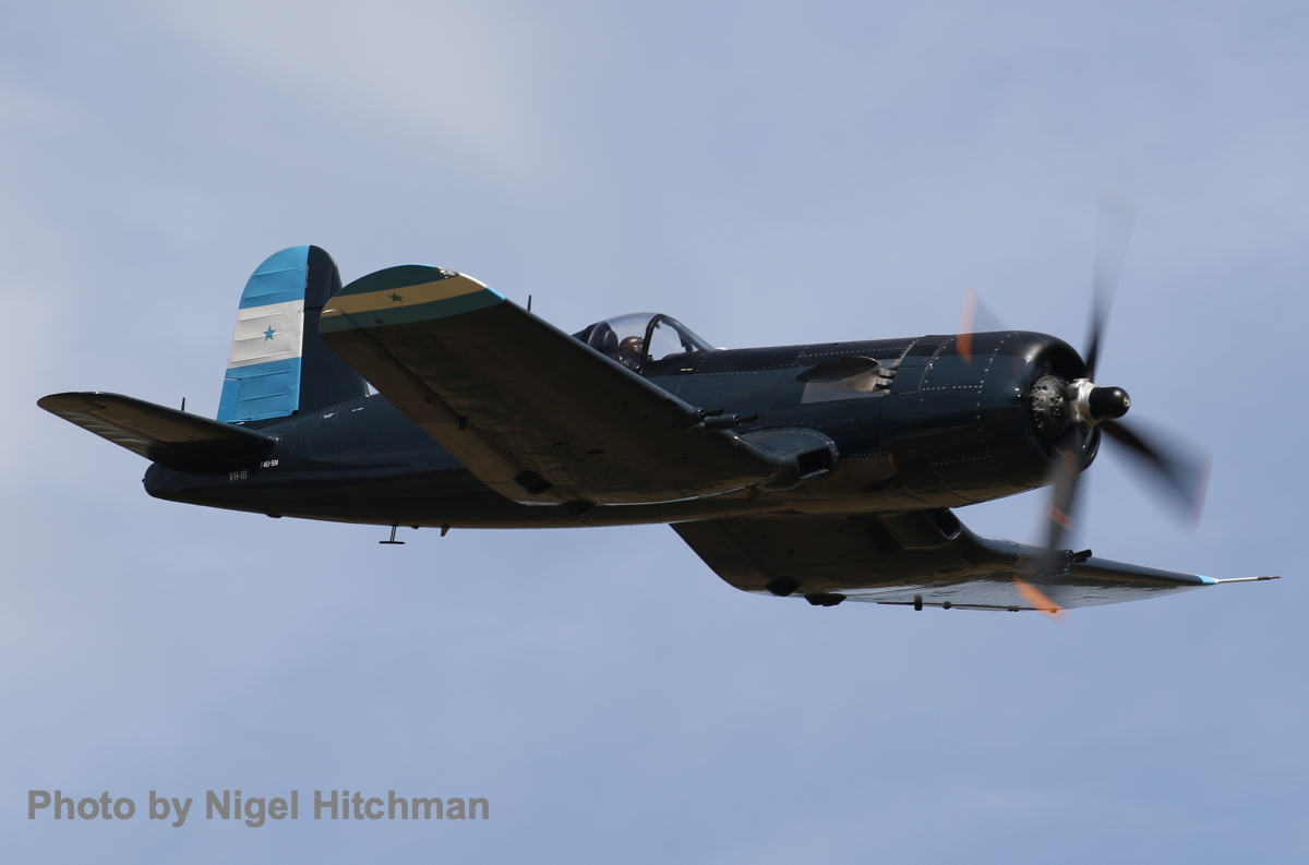 The American heavy metal, core of the show and lead of the finale Balbo were the Grumman Avenger from Paul Bennet’s organization, and Graham Hosking’s heavyweight Vought Corsair resplendent in its Honduran scheme. The finale ‘Balbo’ was led by the Grumman Avenger, and had the two T-28s, the Corsair and the 100 Squadron Mustang joining at the end.