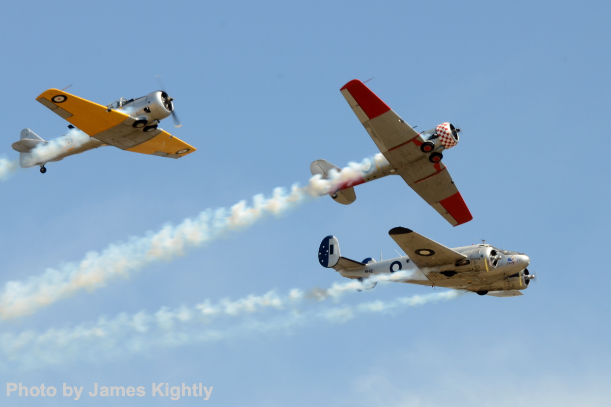 First vintage act as a three-ship Southern Knights Harvard display, retaining their usual standard with Harvards in RNZAF and SAAF colors, and a third in a SNJ scheme. Two Harvards flew again to escort Doug Hamilton and Steve Bekker in Doug’s Beech 18 in a fictitious South East Asia RAAF scheme. A two-ship NAA T-28 Trojan display was flown by Paul Bennet in Judy Pay’s VH-NAW with Steve Death in Mike Murphy’s VH-CIA.