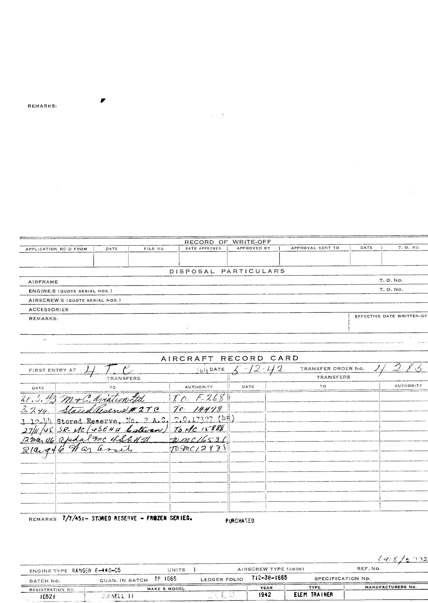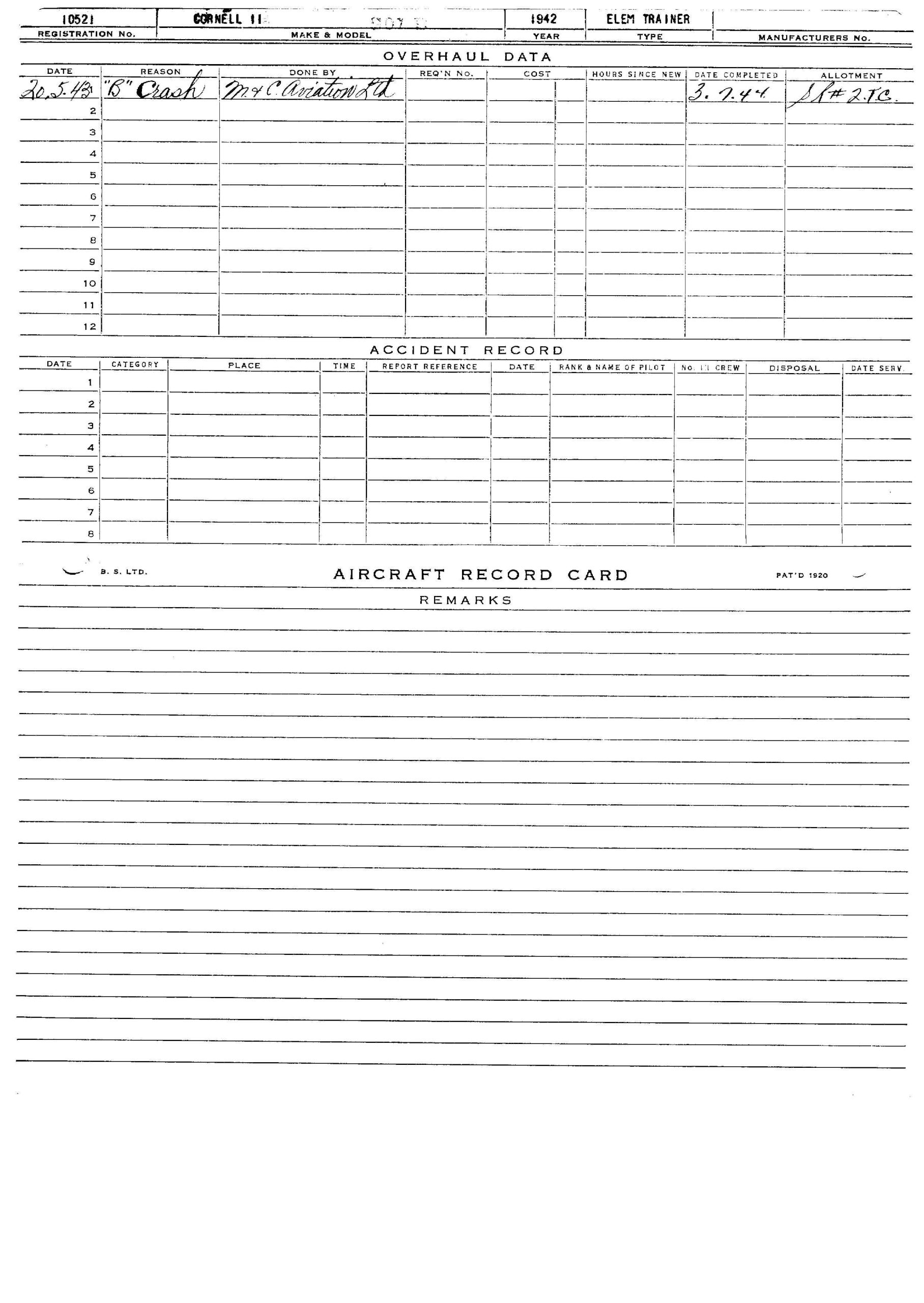 Fast-forward to 2025. The National Warplane Museum in Geneseo, New York, completed another successful Greatest Show on Turf airshow in July. In the aftermath of the show, the museum earned the opportunity to purchase a PT-26, Cornell Mk. II Serial 10521, from a loyal member who had been basing the aircraft in Geneseo since 2020. This Cornell has a unique history, beginning with its construction by Fleet Aircraft Ltd. in Canada, as FC-27. The aircraft was taken on strength with the No. 4 Training Command of the Royal Canadian Air Force on December 5th, 1942. On May 6th, 1943, the Cornell 10521 was involved in a Category B accident at 5 Elementary Flying Training School, while pilots Cockx and Leslie were at the controls. The aircraft was sent to M&C Aviation in Prince Albert, Saskatchewan, for repairs between May 20, 1943 and July 3, 1944.