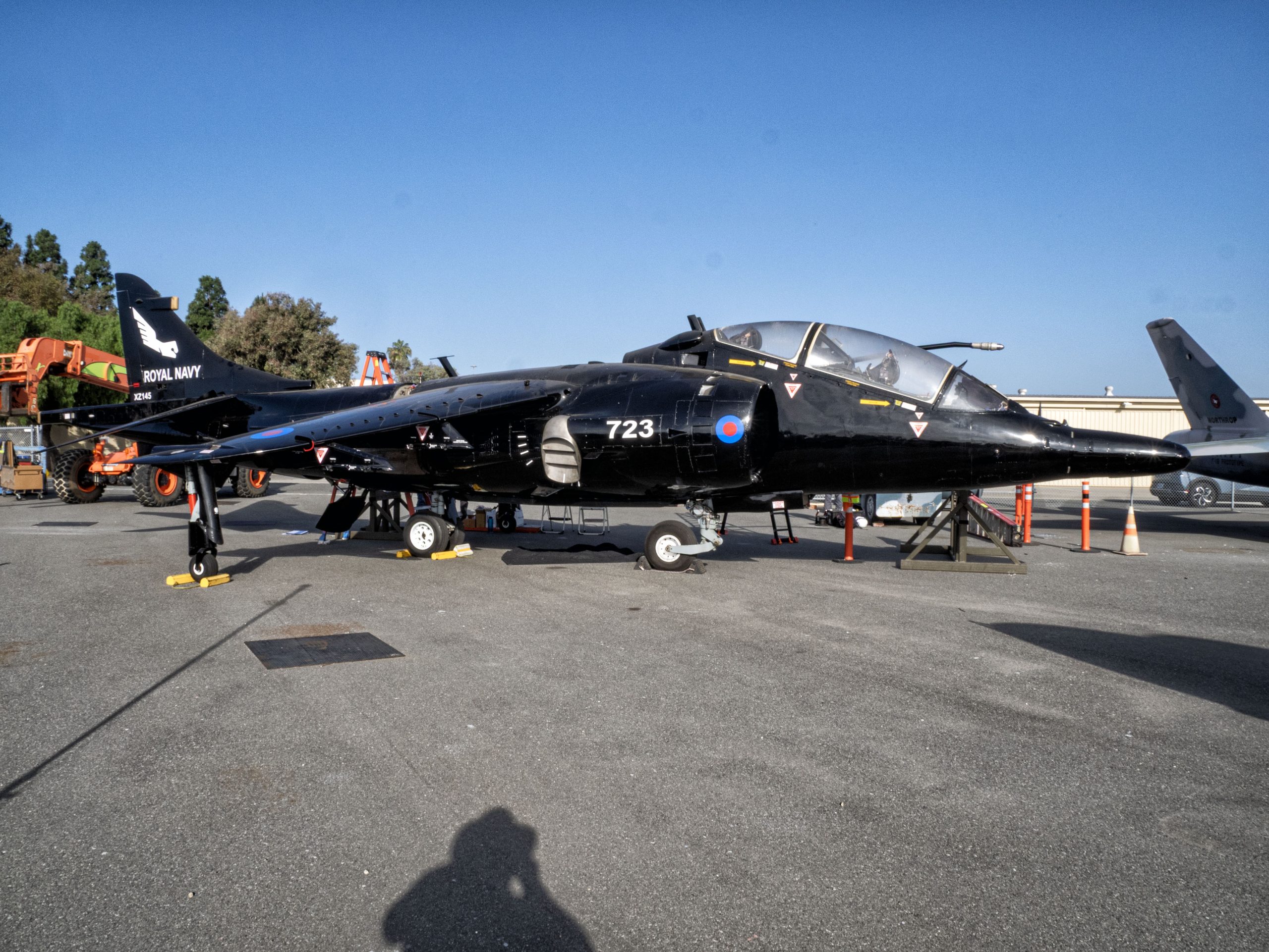 Upon the Harrier’s arrival in California, Jenkins had the original RAF serial number XZ145 painted back on the aircraft but retained the 899 Naval Air Squadron colors. Lacking suitable space at the California Science Center in downtown Los Angeles, Harrier T.4 XZ145 was placed on loan to the Western Museum of Flight at Torrance Airport (Zamperini Field), and on February 21, 2015, the aircraft was officially placed on public display at the WMOF during the museum’s monthly Celebrity Lecture Series presentation. For ten years, Harrier T.4 XZ145 was displayed to the public at the Western Museum of Flight, which also displayed another aircraft on loan from the California Science Center, Northrop T-38A Talon USAF serial number 59-1603, the first production model Talon built, which later flew with NASA as N963NA.