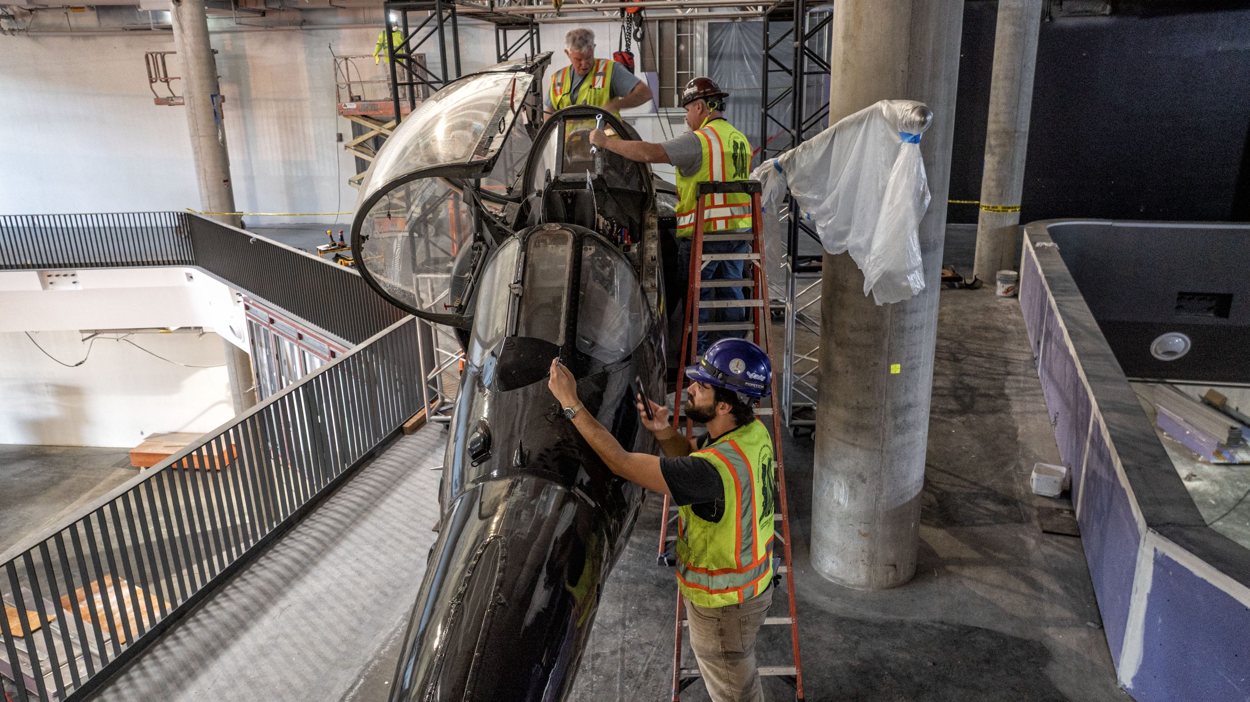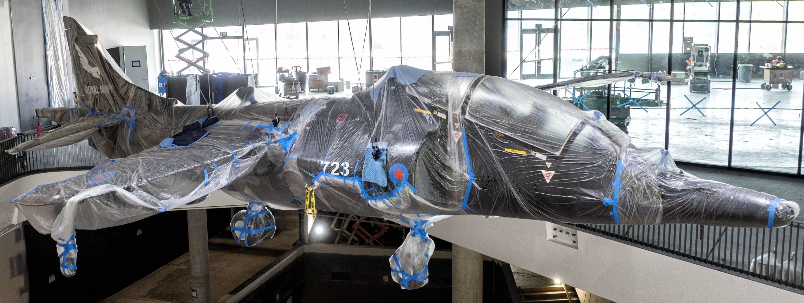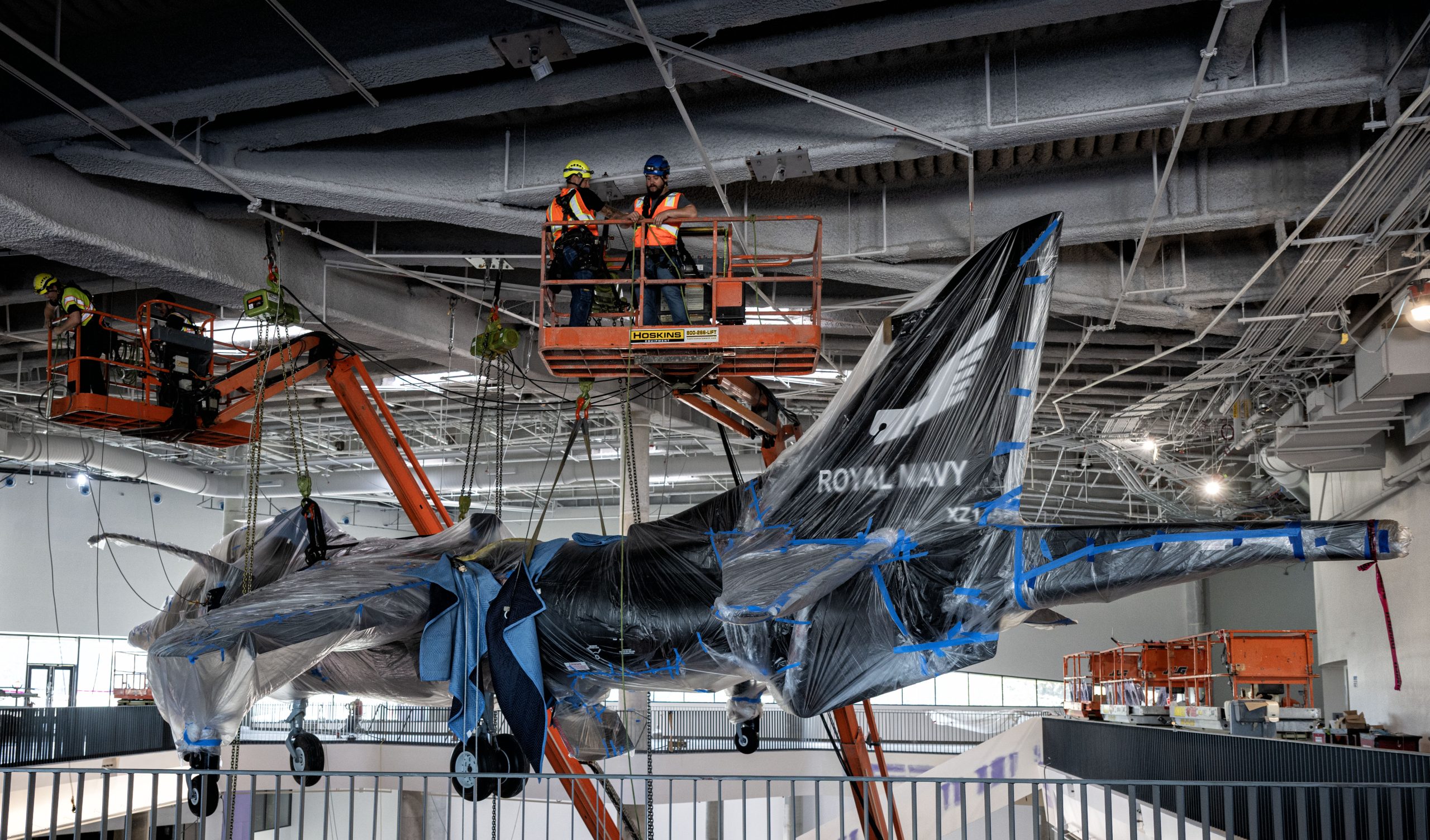 Once the Harrier was in Exposition Park, work began on lifting the disassembled fighter-trainer off the ground and hoisting it through an opening in the Air and Space Center. With that phase complete, the contractors set to work reassembling the Harrier, then rigging the aircraft to be suspended from the building’s ceiling, which is how the museum intends to display the Harrier when the Samuel Oschin Air and Space Center will be officially open to the public.