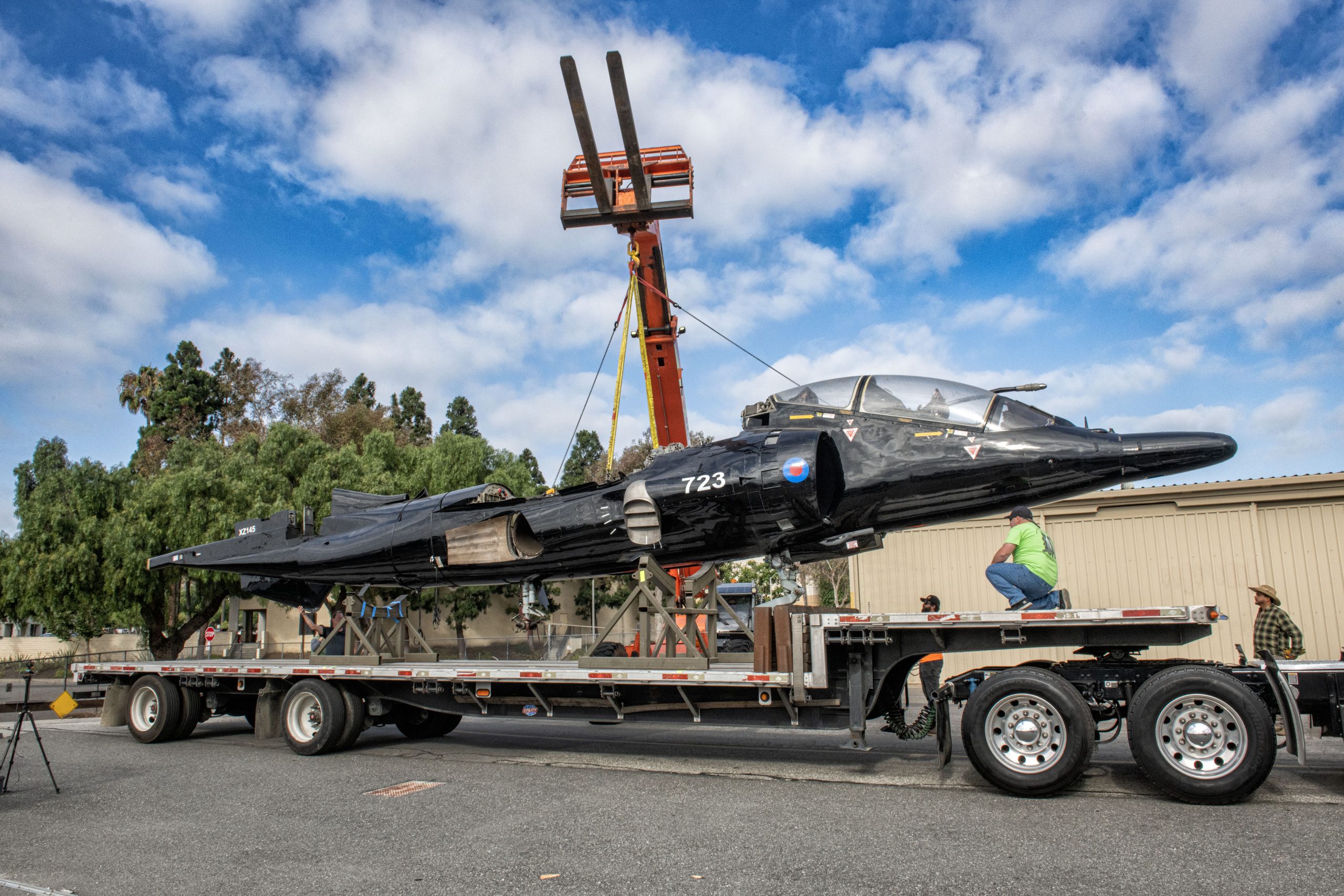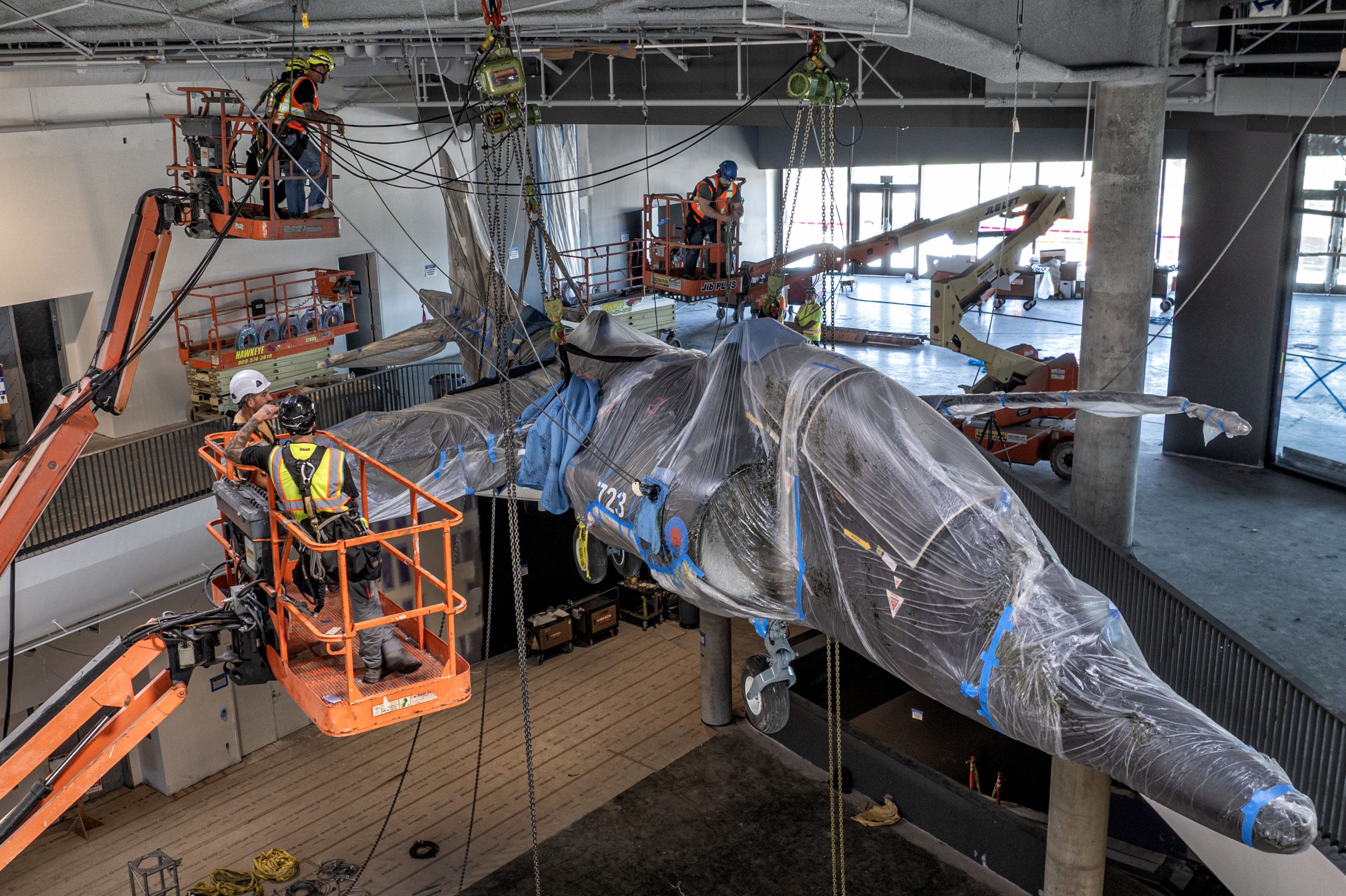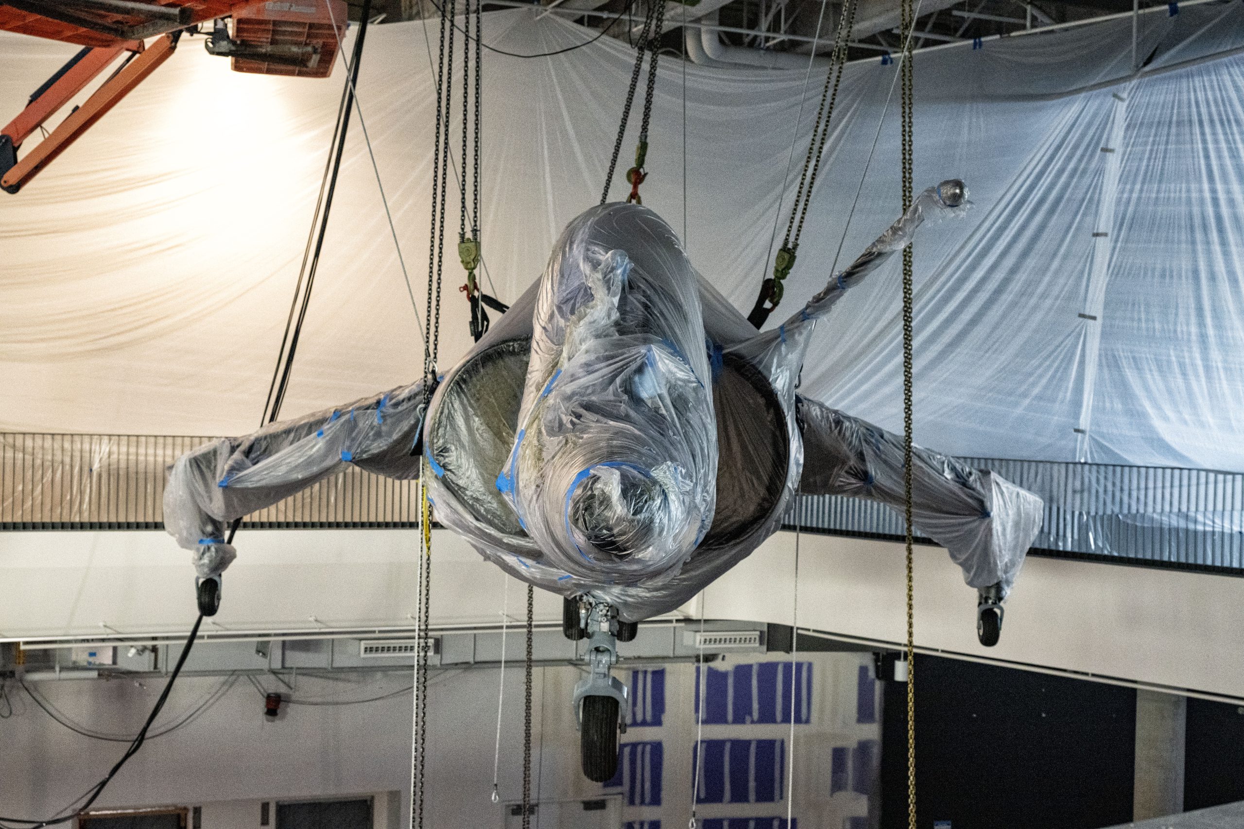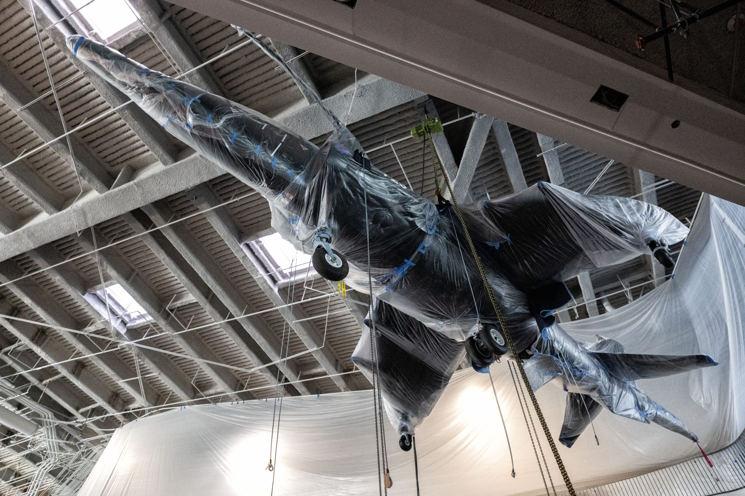 Once the Harrier was in Exposition Park, work began on lifting the disassembled fighter-trainer off the ground and hoisting it through an opening in the Air and Space Center. With that phase complete, the contractors set to work reassembling the Harrier, then rigging the aircraft to be suspended from the building’s ceiling, which is how the museum intends to display the Harrier when the Samuel Oschin Air and Space Center will be officially open to the public.