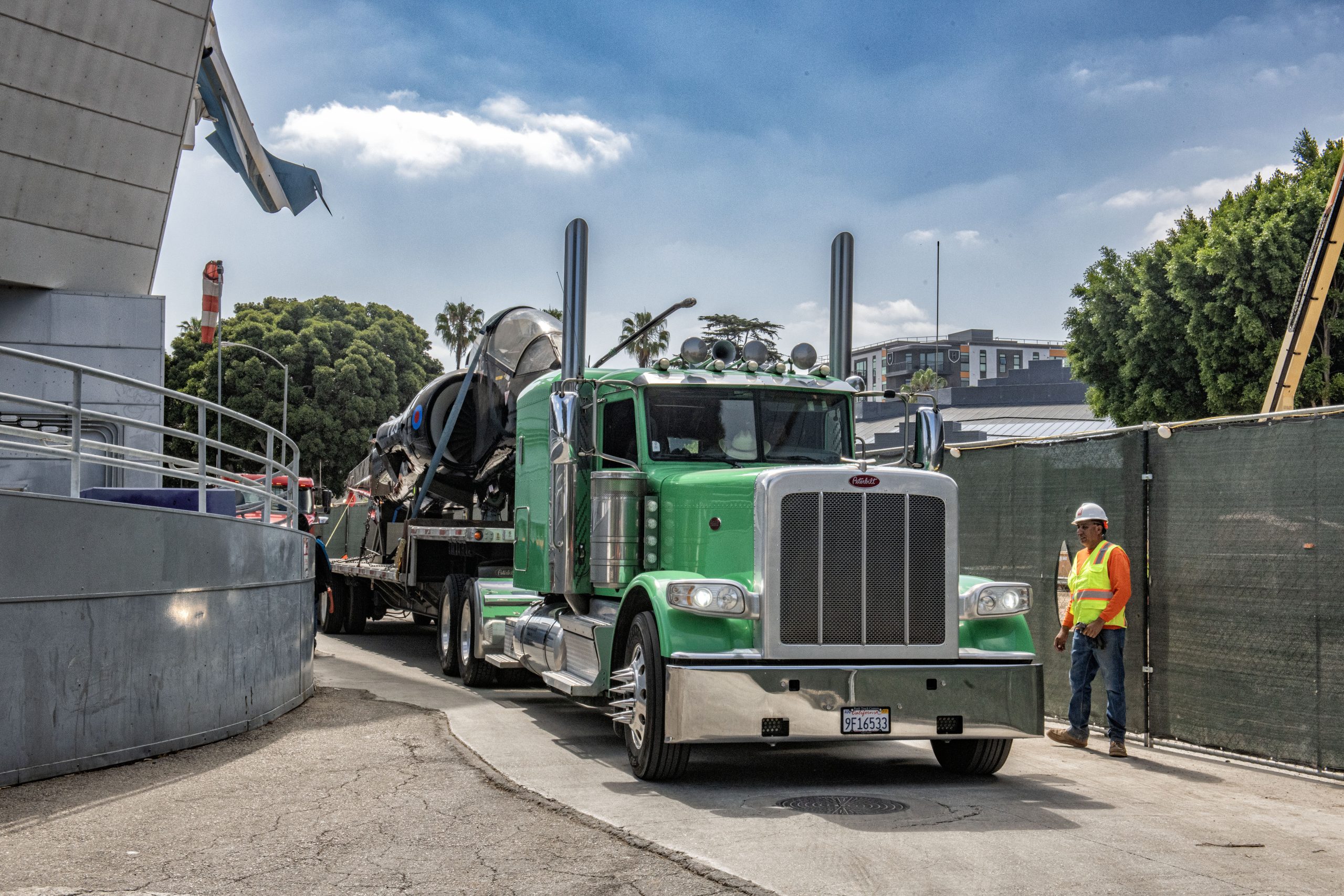 As the Samuel Oschin Air and Space Center has taken shape in recent years, the California Science Center has been preparing to install several aircraft and spacecraft alongside the shuttle Endeavour. With the transfer of T-38A N963NA from Torrance in 2024, along with the arrival of Grumman F11F Tiger Bureau Number 138608 from Florida (covered HERE) and the transfer of Douglas DC-3 N760 from the Flight Path Museum and Learning Center at Los Angeles International Airport (covered HERE), it was now Harrier T.4 XZ145’s turn to be brought to Exposition Park. The Harrier was towed from its hangar at the Western Museum of Flight to the southern end of the airport, where the WMOF displays its Northrop YF-17 Cobra and Northrop YF-23 prototypes. Then, a team of contractors carefully disassembled the Harrier’s wings and tail stabilizers and loaded the aircraft onto truck trailers to be driven 15 miles north to the California Science Center at Exposition Park, just across the street from the University of Southern California (USC).