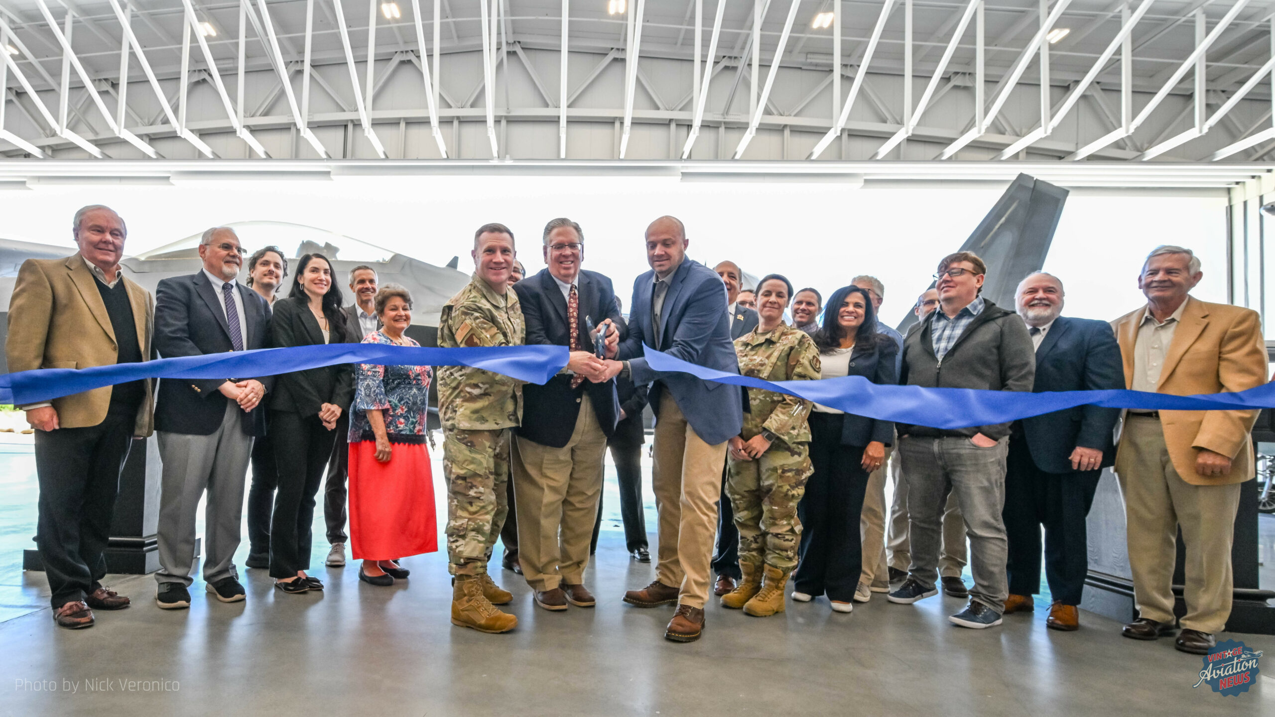 (Center) Col. Jeffrey Holland, 75th Air Base Wing commander, Robb Alexander, executive director of the Aerospace Heritage Foundation of Utah, and Aaron Clark, Hill Aerospace Museum director, cut the ribbon during a ceremony commemorating the opening of the new L.S. Skaggs Gallery at the Hill Aerospace Museum at Hill Air Force Base, Utah, April 29, 2024. The new gallery is a 91,000 square foot hangar and provides a 70% increase to the indoor exhibition space. (U.S. Air Force photo by Cynthia Griggs)