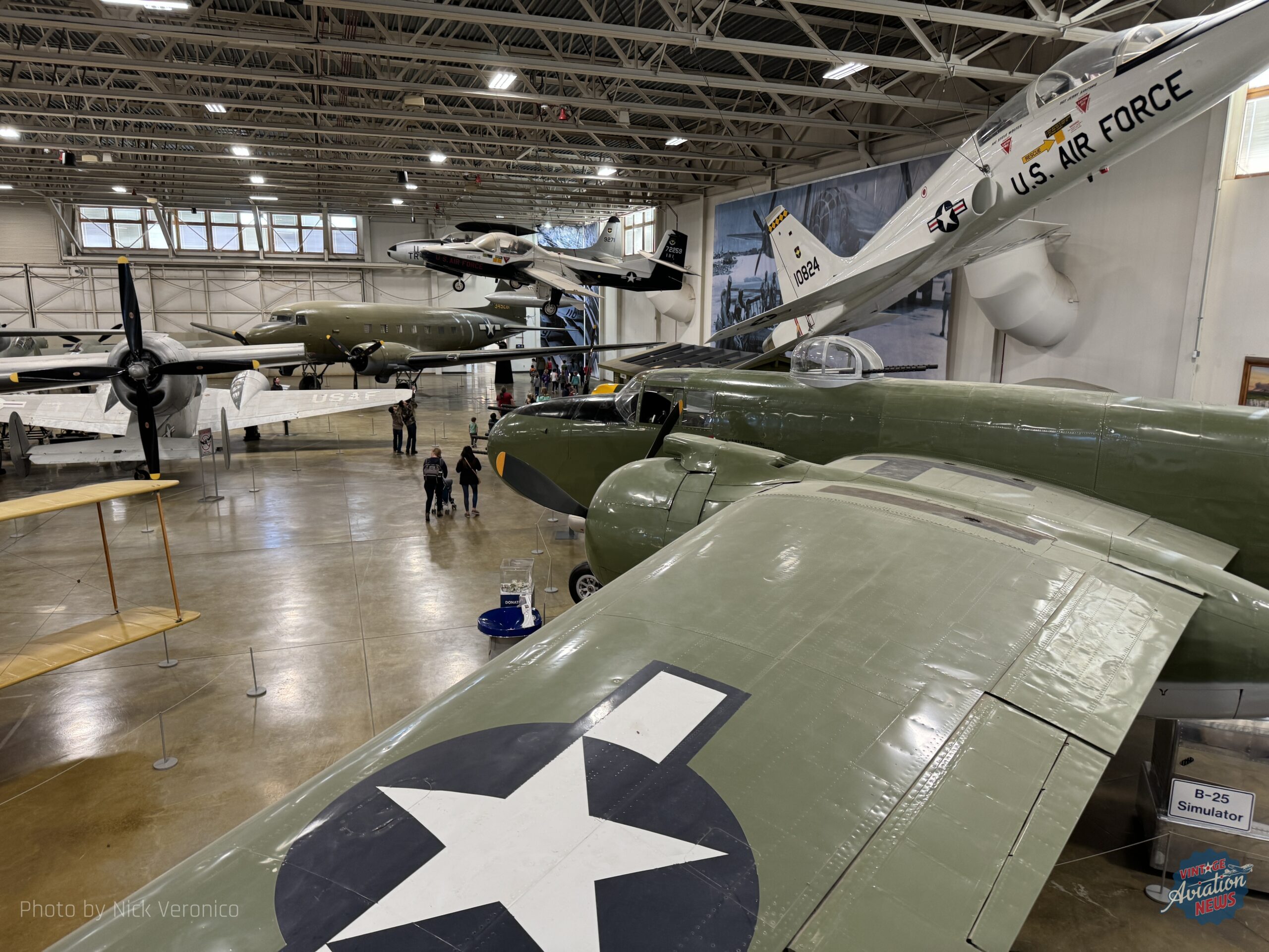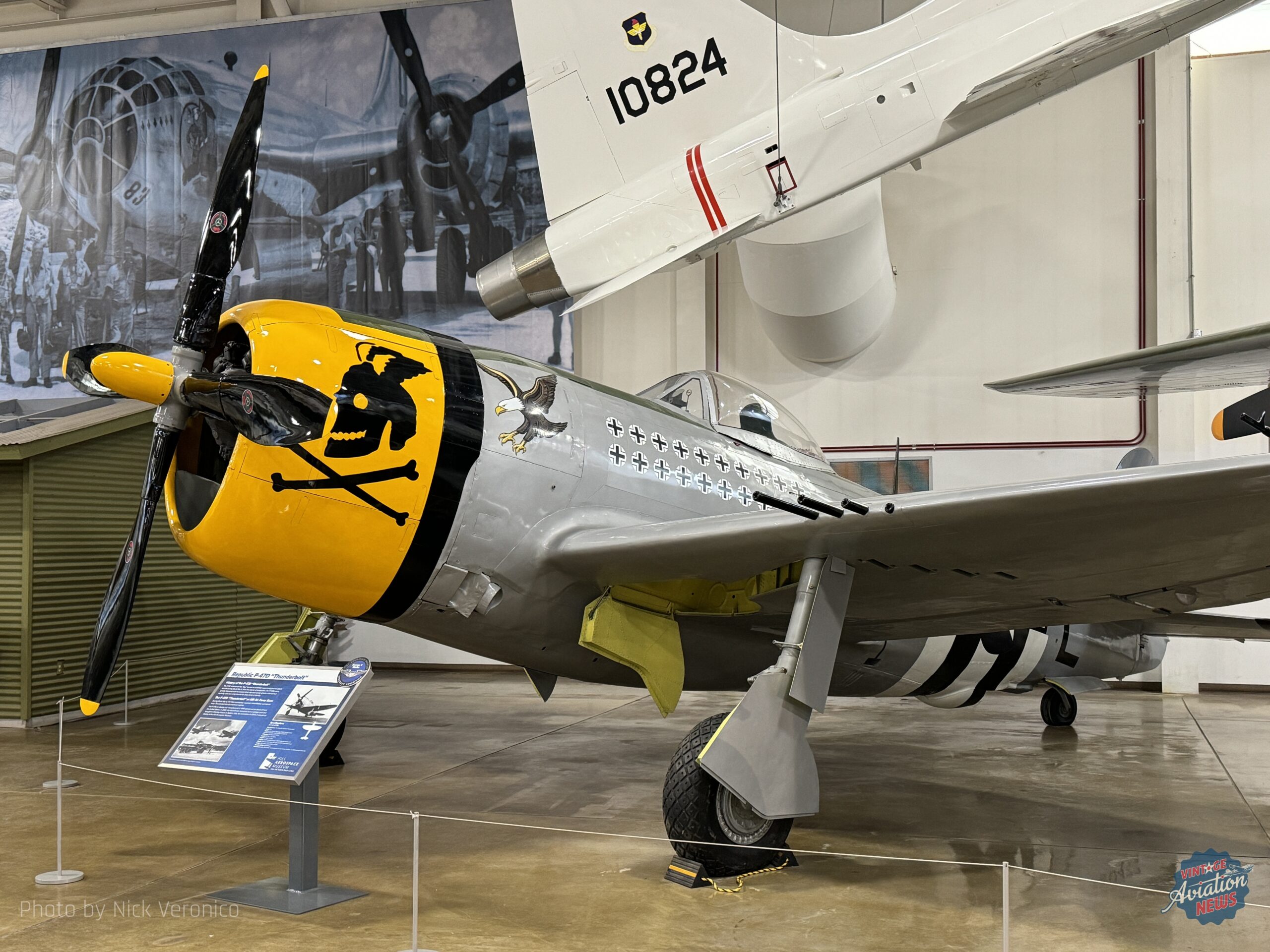The original sections of the museum house an impressive collection of World War II aircraft, including a P-38J, P-40E, P-47D, P-51D, A-26 Invader, C-45H, C-47B, and C-54G transports, and bombers from a B-17G, B-24D, B-25N, and B-29. The P-38J, serial number 42-67638, and the B-24D, serial number 41-23908, were both recovered from crash sites in Alaska and rebuilt to display standards in the late 1990s and early 2000s. The P-51D on display was assembled from a number of different Mustang components and is painted as serial number 44-13371, the aircraft flown by Col. Chesley Peterson with the 8th Air Force’s 4th Fighter Group. Peterson named the original aircraft after his wife Audrey Boyes Peterson.