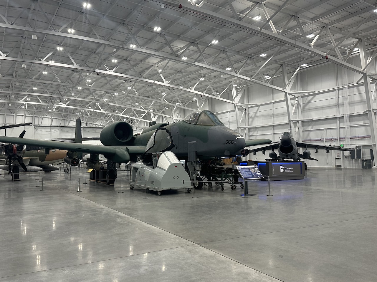 Attack aircraft are well represented in the new L.S. Skaggs Gallery with A-10A 73-1666, and YA-7F 70-1039 to the right. One of the first six Warthogs built, the A-10A spent the majority of its career at Edwards AFB in test and evaluation programs. The YA-7F was originally built as an A-7D and was modified in July 1987, as one of two F model prototypes. (Elizabeth A. Najim/Hill Aerospace Museum)