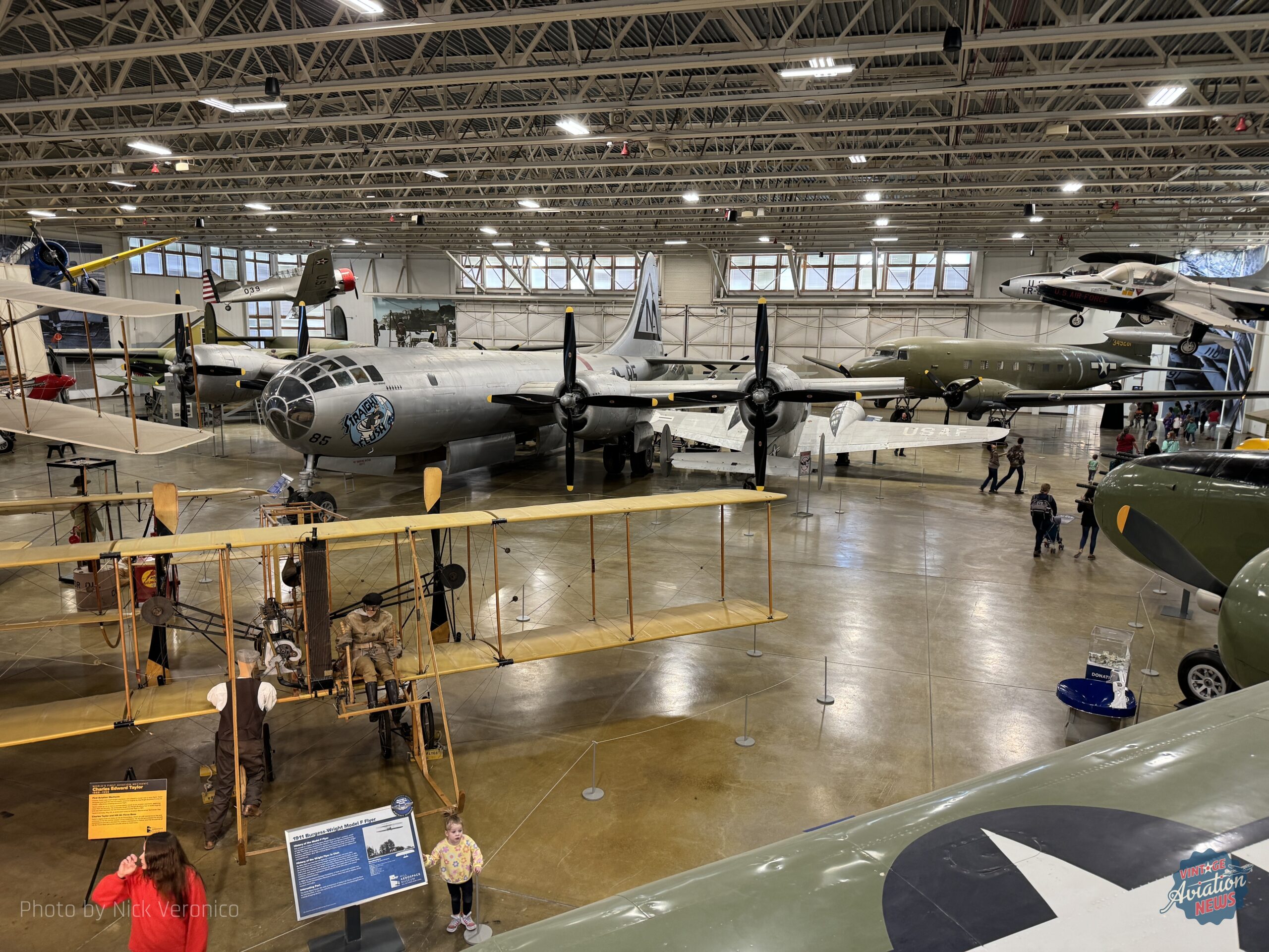 Overview of the Hadley Gallery showing the Burgess-Wright Model F Flyer in the lower foreground with the B-29 44-86408 and C-47B 43-49821in the center. A number of training aircraft, ranging from an AT-6 to a T-37 are suspended from the ceiling. (Nicholas A. Veronico)