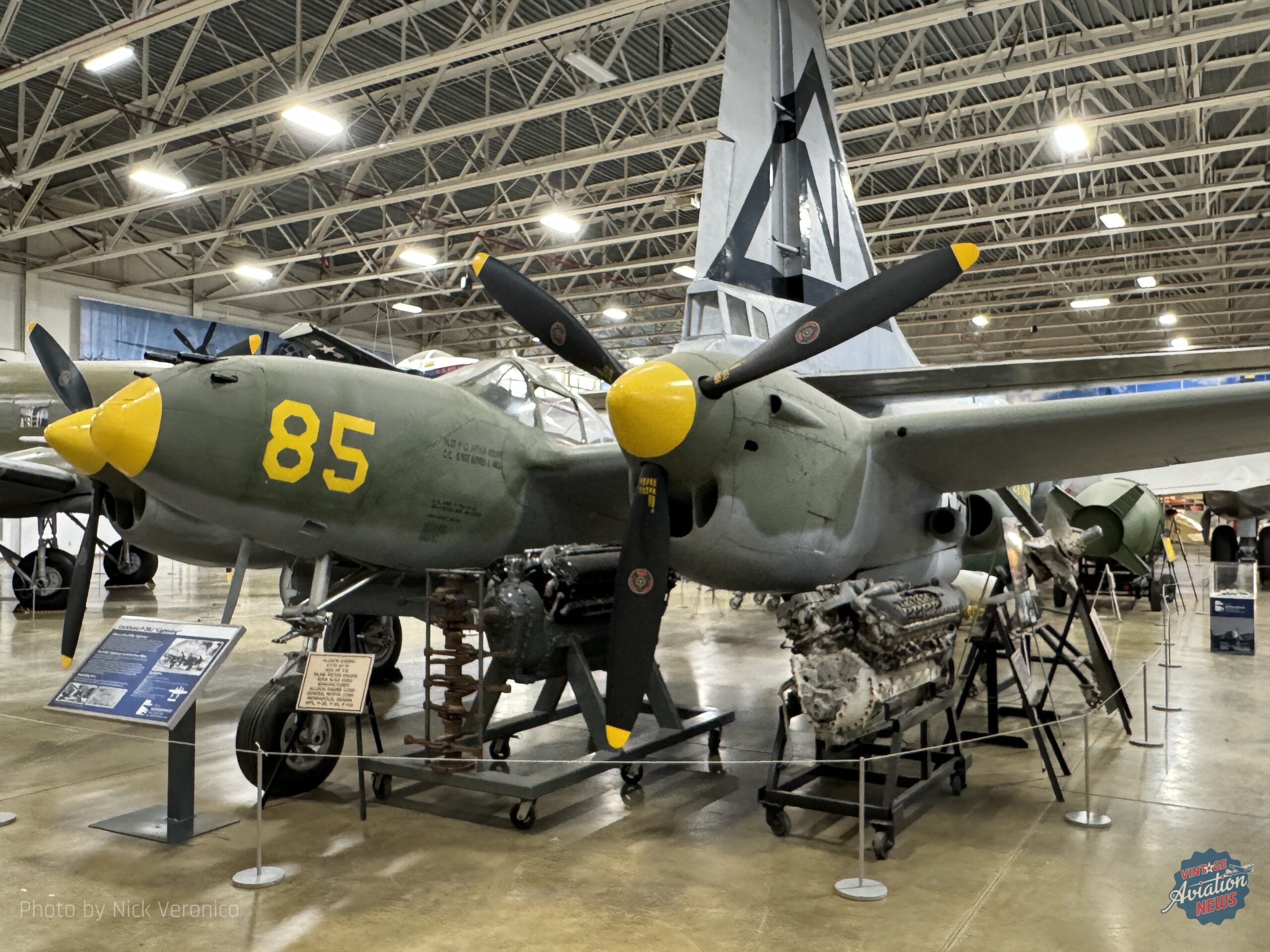 This P-38 was serving with the 54th Fighter Squadron, 343rd Fighter Group in the Aleutian Islands in during World War II. It crash-landed on the Baldir Island on Feb. 2, 1945. The museum recovered the Lightning in 1994 and it was placed on display in 1996. Unrestored parts of the aircraft, including an engine and propeller assembly are shown to the left side of the aircraft. (Nicholas A. Veronico)