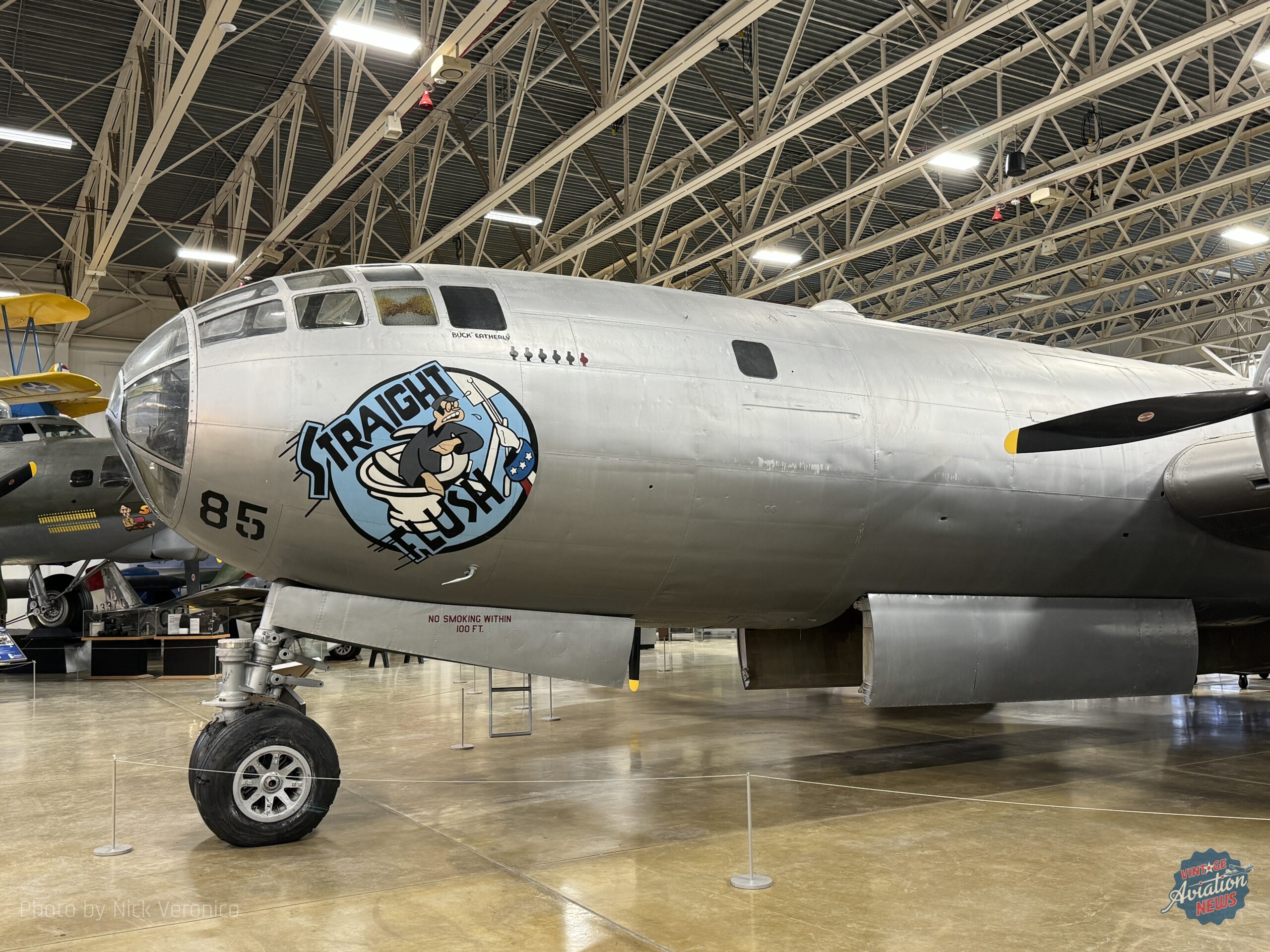 Painted as the B-29 Straight Flush that served as the weather reconnaissance aircraft for the atomic bombing of Hiroshima on Aug. 6, 1945, this is actually Martin-Omaha built B-29 44-86408, that served in the Strategic Air Command after World War II. She was later assigned to the Dugway Proving Grounds in Utah in June 1953, and was recovered by the museum in 1983. (Nicholas A. Veronico)
