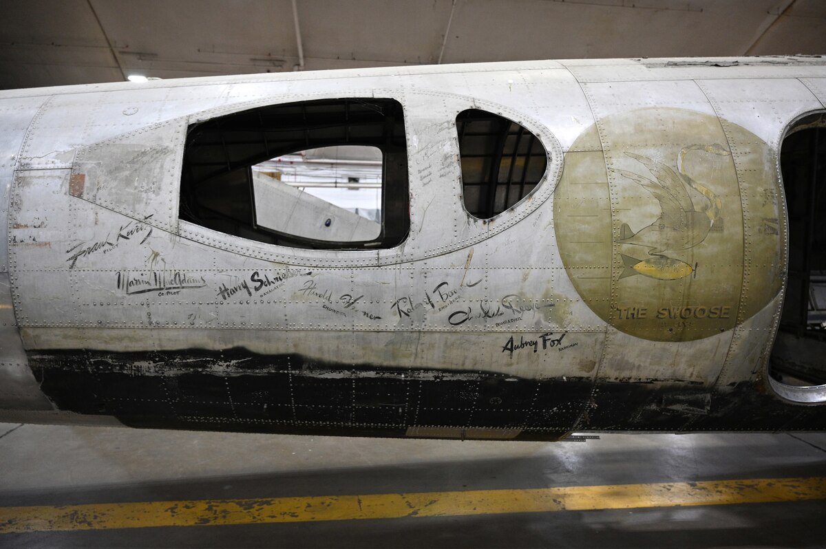 “This is both a restoration and conservation project. Some airframe areas need repair and restoration for structural integrity and exhibit-worthiness, while others will be conserved as-is to maintain originality. The overall aim is to present the artifact in the context in which it was received, i.e., to preserve it in the configuration of its final mission. A combination of restoration and preservation will ensure its longevity, structural and historical integrity, and safe public display in a controlled environment. This means that the aircraft’s identity as ‘The Swoose’ will be maintained with as much original fabric in situ as possible. The minimally invasive preservation approach is one option in the spectrum of possible restoration / preservation / conservation practice, and as in all NMUSAF restoration work assures the artifact’s ethical treatment as a museum object.”