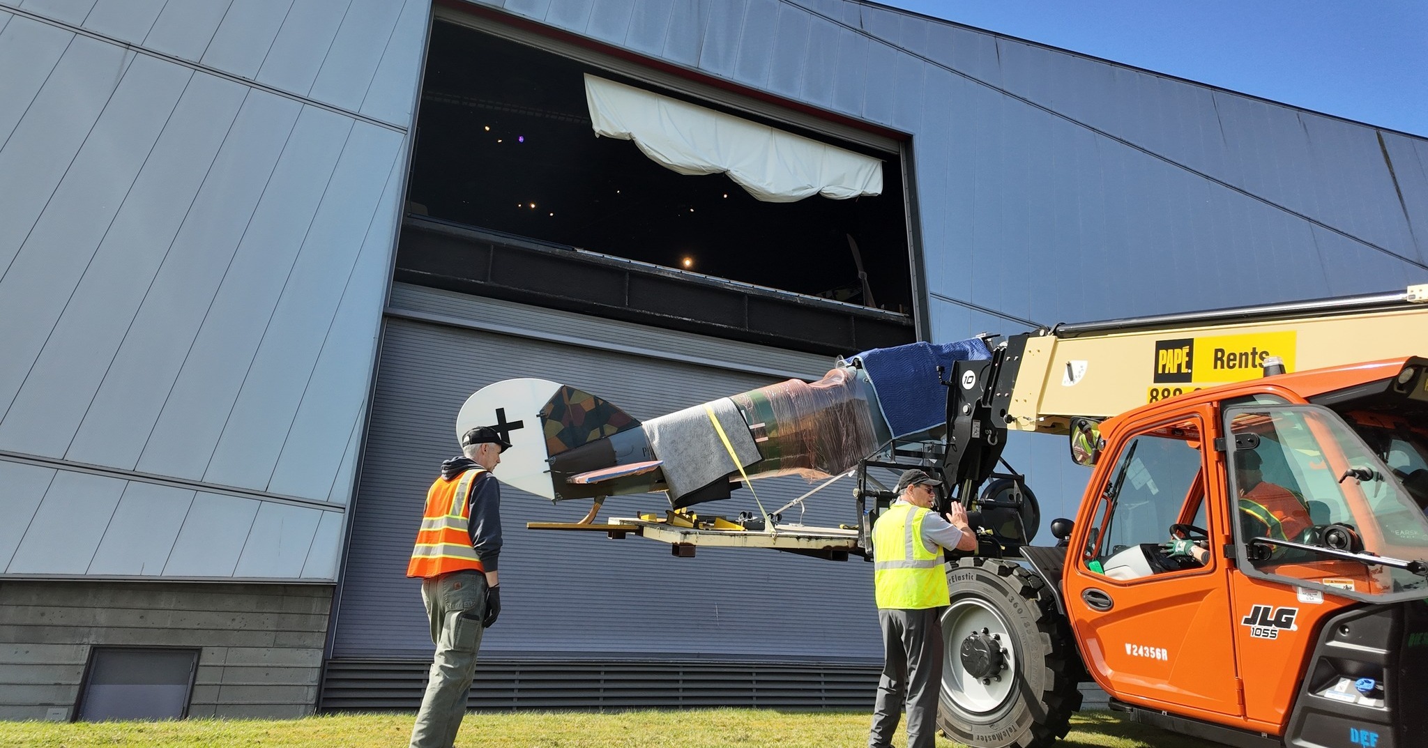 The Museum of Flight’s Pfalz D.XII at the museum’s Reserve Collection and Restoration Center at Paine Field, Everett, being prepared for the drive back to the main museum campus in Seattle. (Commemorative Air Force Rainer Squadron)