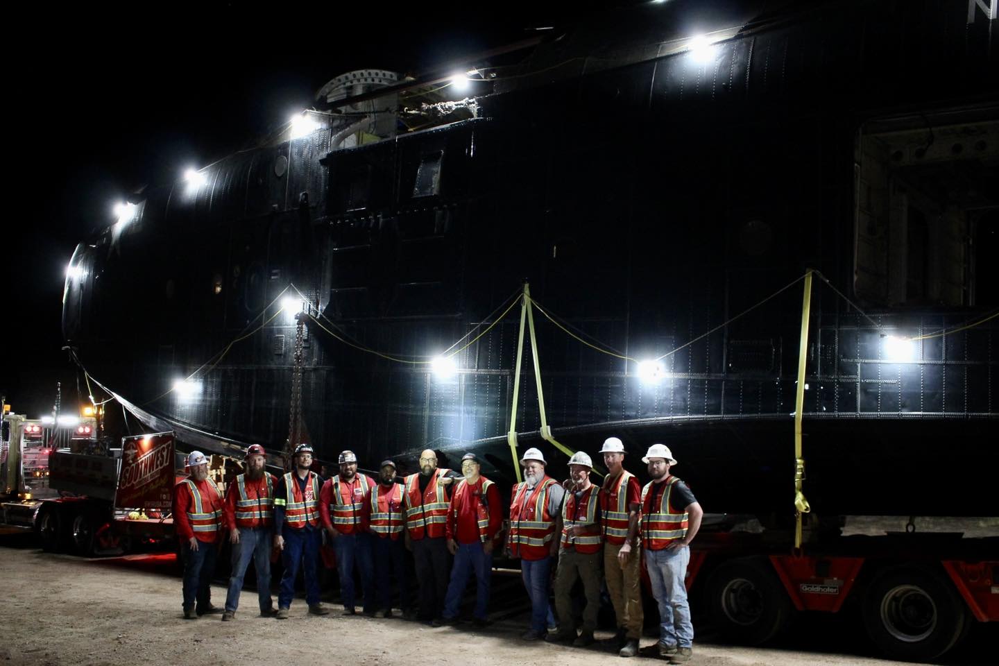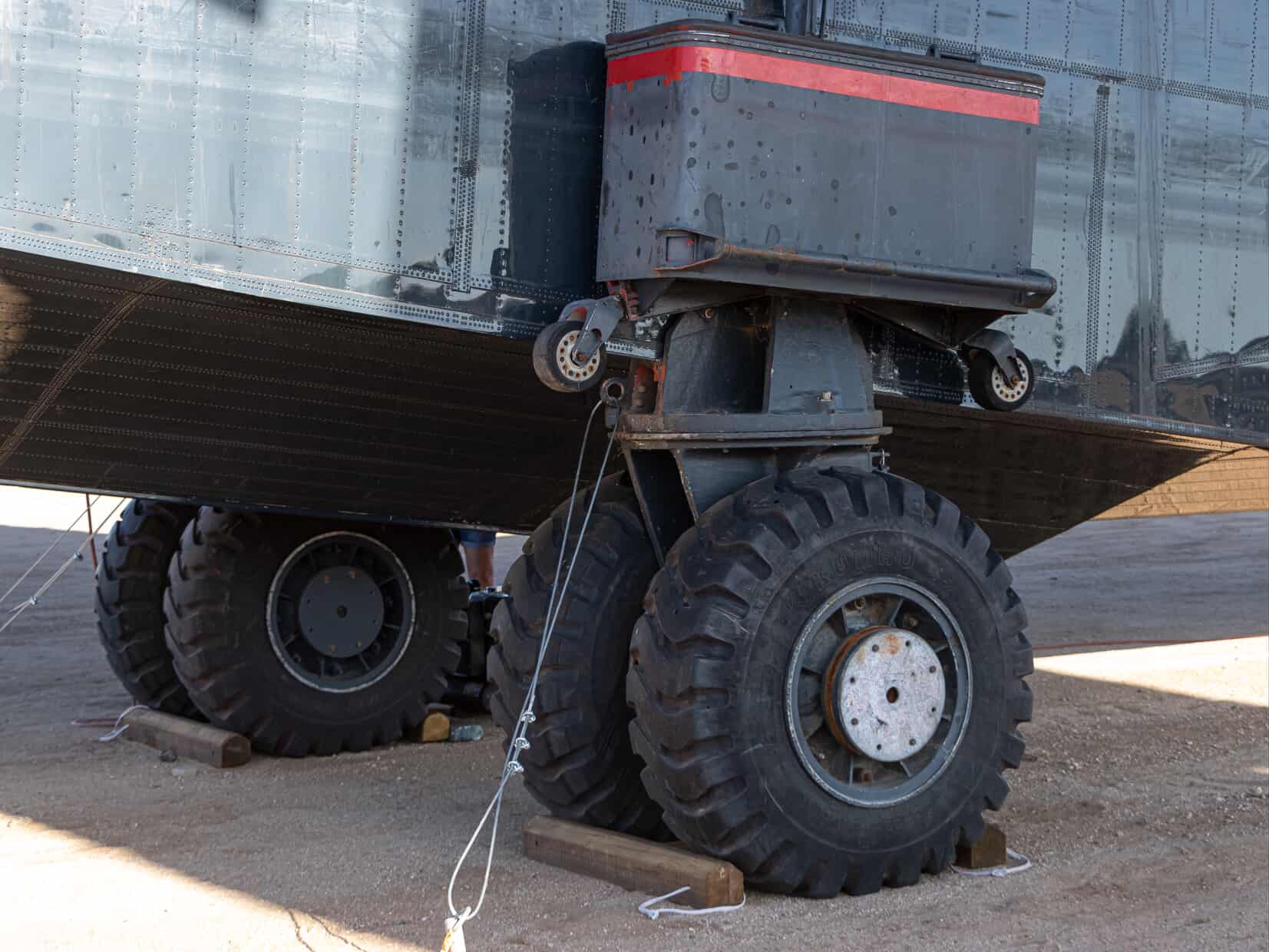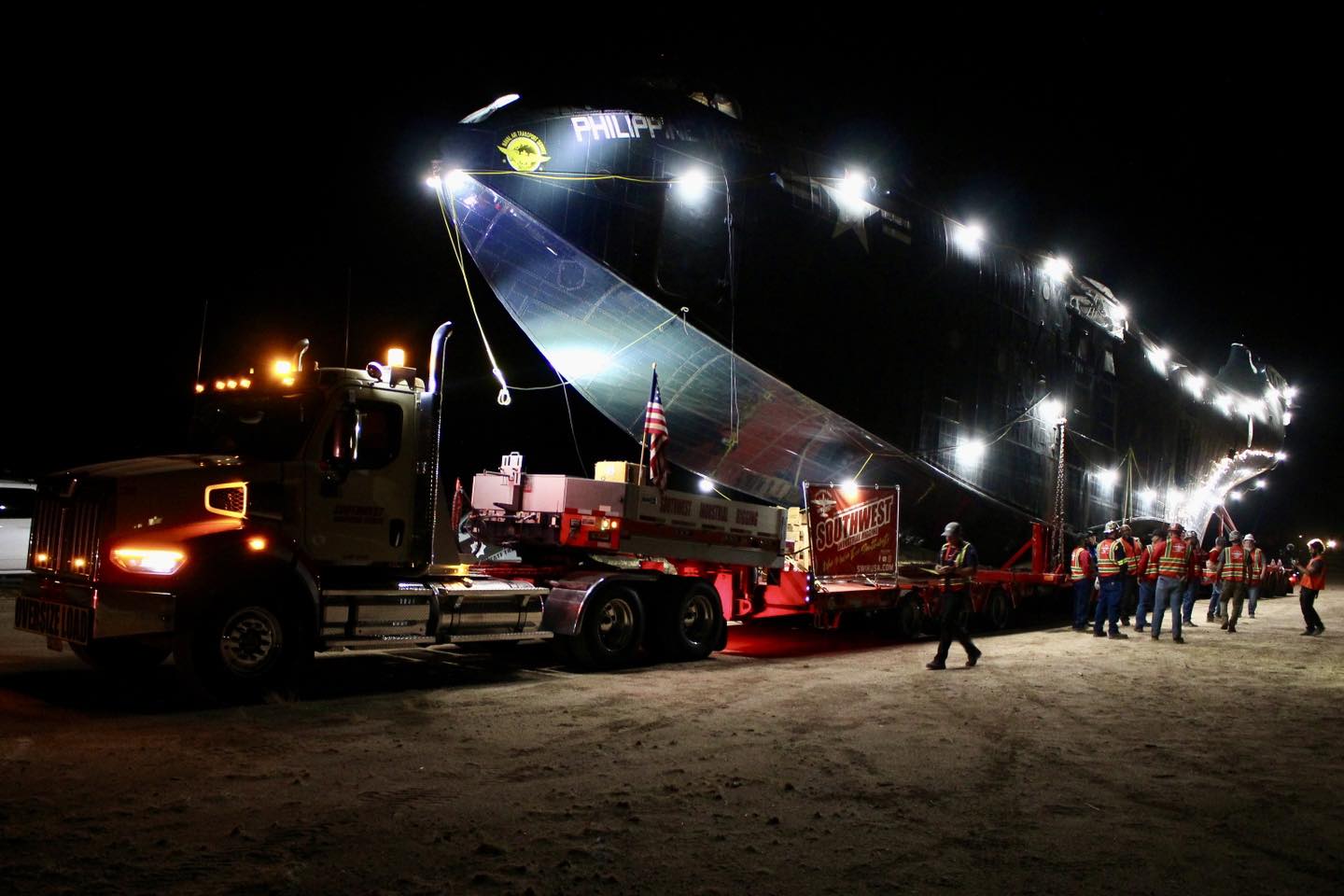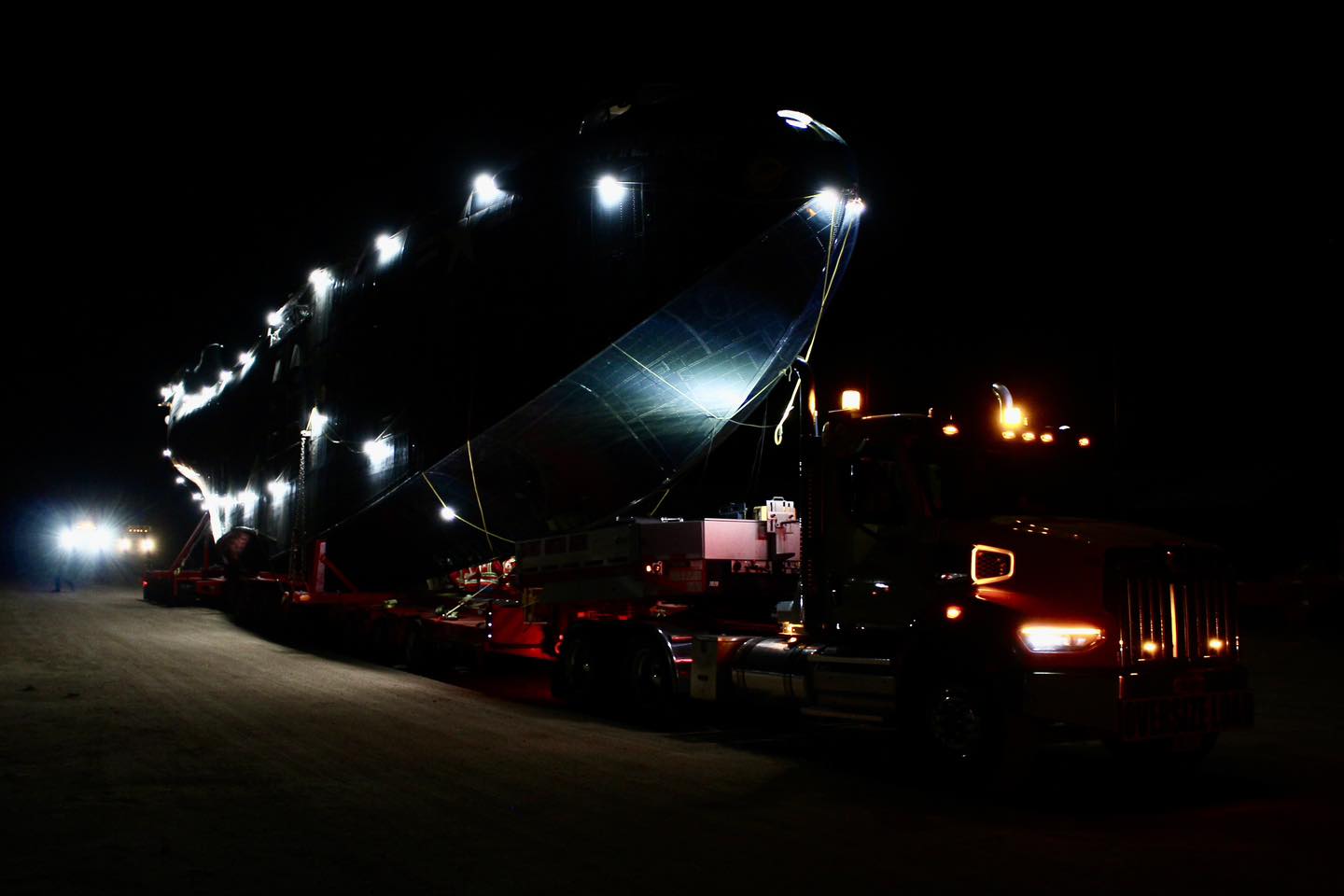 By April 2025, the engines, propellers, pontoon floats, tail surfaces, and outer wing panels had arrived at the Pima Air and Space Museum, leaving the hull and the center wing box as the largest to be shipped from Lake Pleasant. At the beginning of May, the center wing box was driven on a wide load trailer to the PASM, leaving the hull as the last item still at Lake Pleasant. The height of the Philippine Mars’ hull on the oversize trailer meant that this final component was too big to be driven under highway overpasses. Instead, the hull of Philippine Mars would embark on an epic nocturnal journey through central and southern Arizona to arrive in Tucson under police escort.