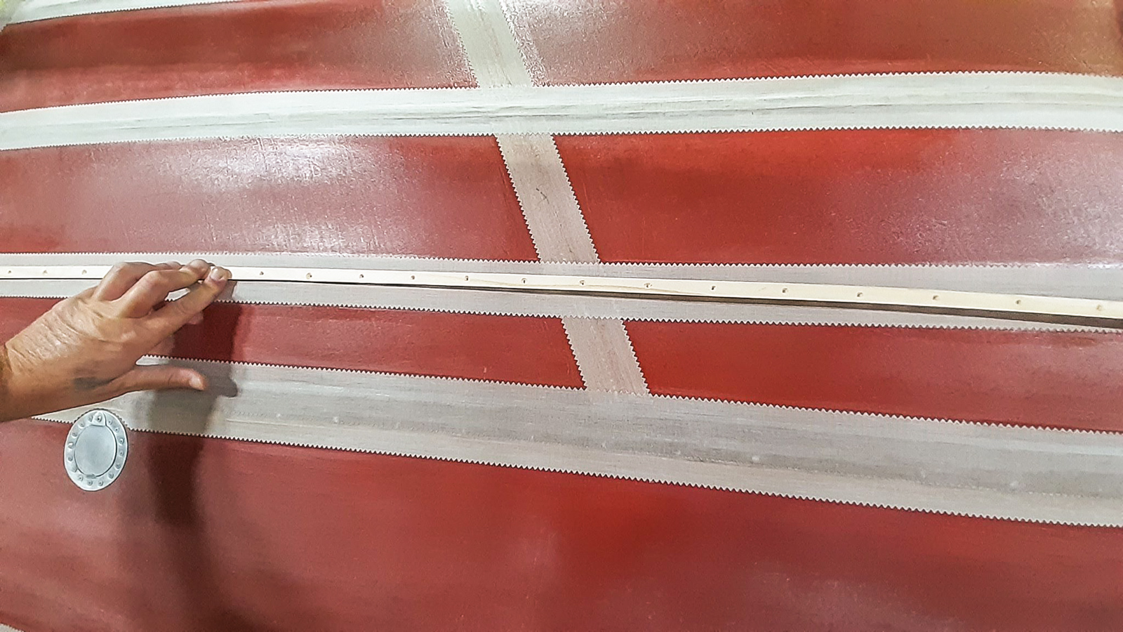 If you’ve ever wondered what the serrated edge strips are for, these are placed over the wooden clamp strips to add an extra layer of protection where the linen is sewn onto the aircraft frame. The light sanding between dope coats helps to smooth these edges giving a better finish.