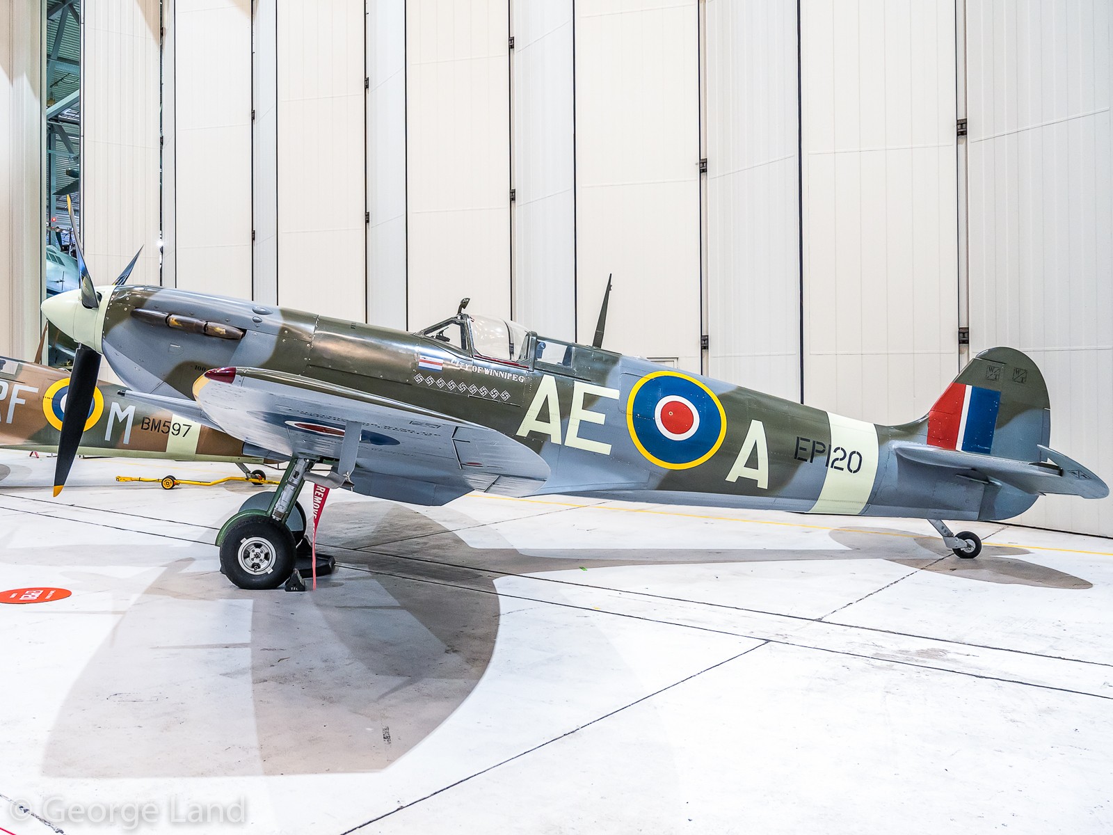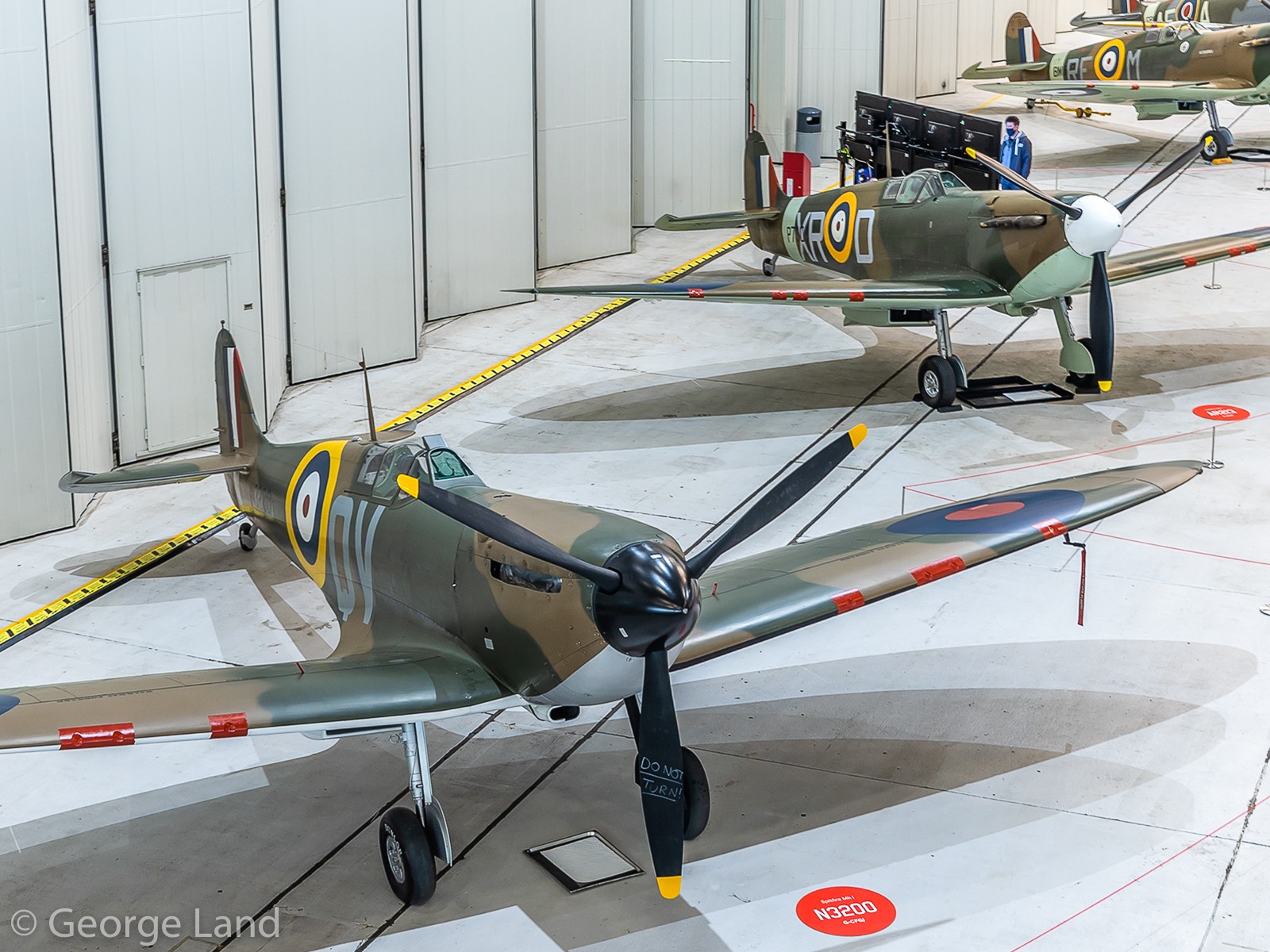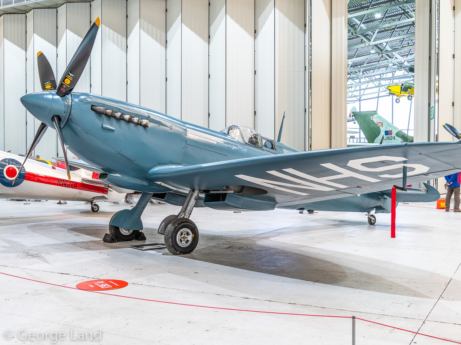 Organized by Imperial War Museum (IWM) Duxford and staged in the museum’s AirSpace Hangar, Spitfire: Evolution of an Icon was initially supposed to take place during 2020, but of course the pandemic intervened, and forced a delay until the end of 2021. The exhibit will now run from December 27th, 2021 through February 20th, 2022. Arranged in the front hall within the AirSpace hangar, the twelve Spitfires on show ranged from the IWM’s own airworthy Spitfire F.Mk.Ia (N3200) through to The Fighter Collection’s Spitfire F.Mk.22 (PK624). Interestingly, the latter airframe, presently unrestored, is normally tucked away out of public view in Duxford’s Hangar 2, so it was a nice opportunity to see this reclusive and rare variant up close for a change. Museum staff were on hand in the hall to provide further information about the aircraft in the exhibit while small activity displays demonstrated different aspects of the Spitfire. Furthermore, a retail area nearby offered various Spitfire-related products.