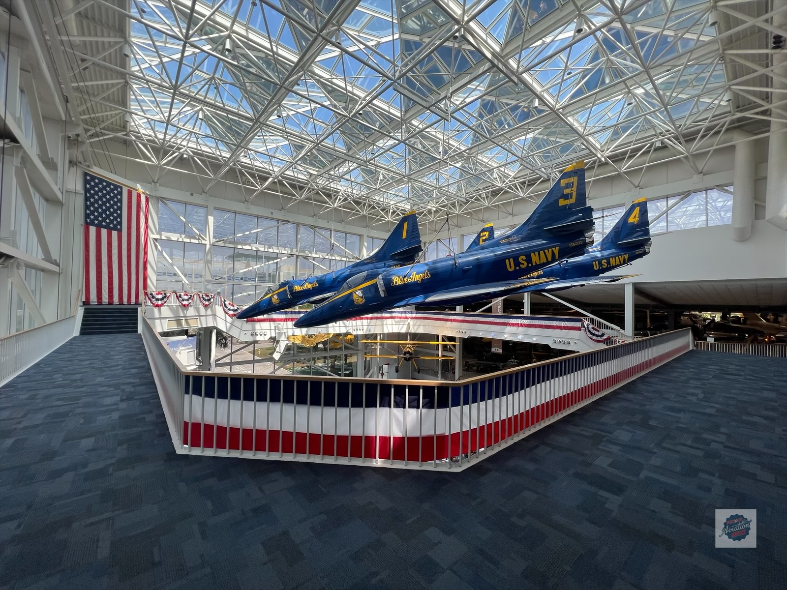 The museum saw its first major expansion in 1975, when a 68,000-square-foot, column-free structure was built, vastly improving display capacity. In 1980, additional sections were added to the original structure, increasing the total space to 110,000 square feet. Another major addition came in 1990, when a second octagonal module was constructed and connected by the 75-foot-high Blue Angel Atrium, bringing the total exhibit space to 250,000 square feet at a cost of $10.5 million. Further expansions followed in 1994, when a new entrance hall, the Naval Aviation Memorial Giant Screen Theatre, and the Spirit of Naval Aviation Monument were introduced. In 2011, the museum opened Hangar Bay One, adding 55,000 square feet of exhibit space dedicated to aircraft from the post-World War II era. This addition allowed for the display of historically significant aircraft, including the R4D-5L Skytrain (Que Sera Sera), the first aircraft to land at the South Pole, and the P2V-1 Neptune (Truculent Turtle), famous for setting a long-distance flight record.