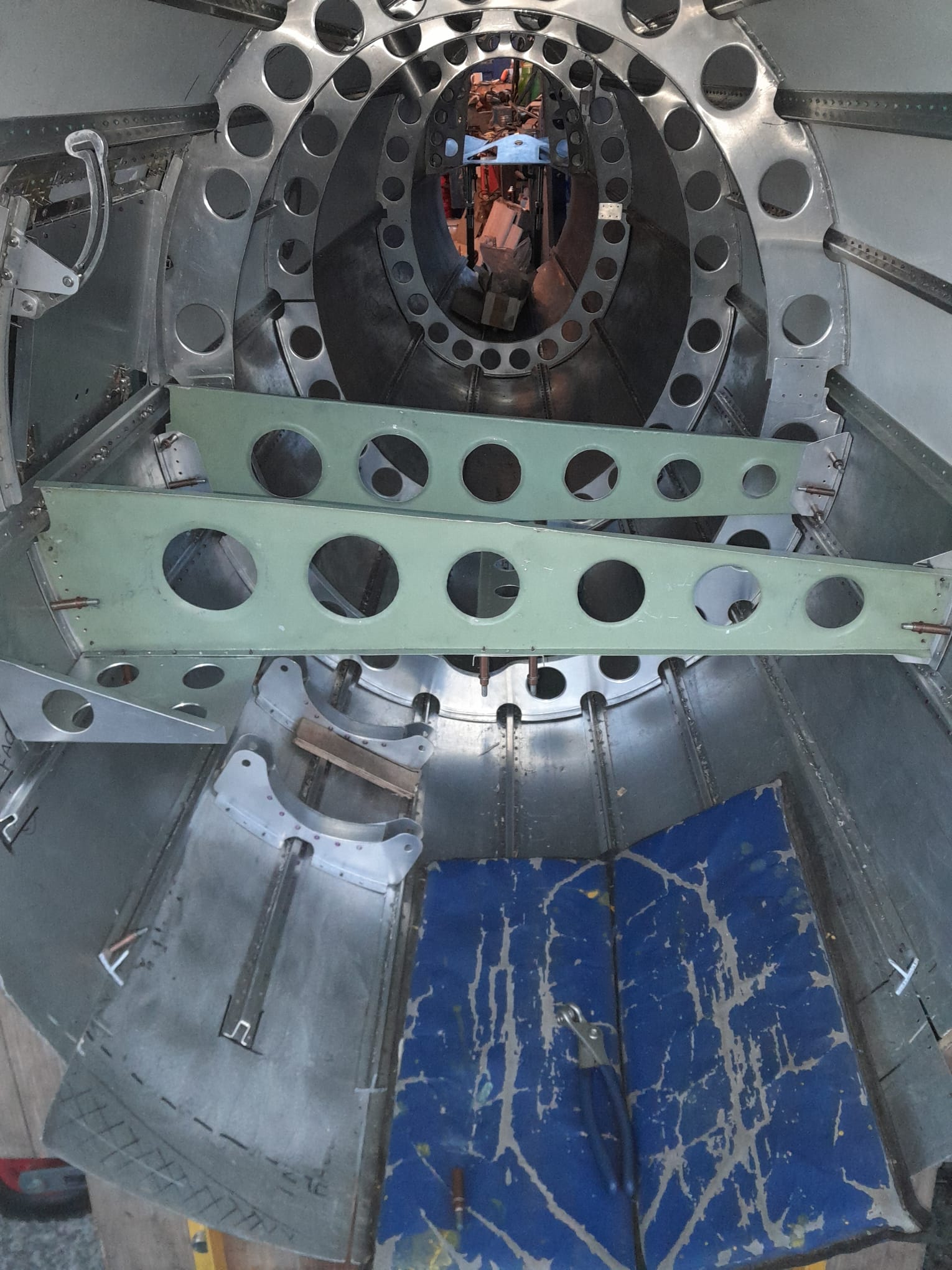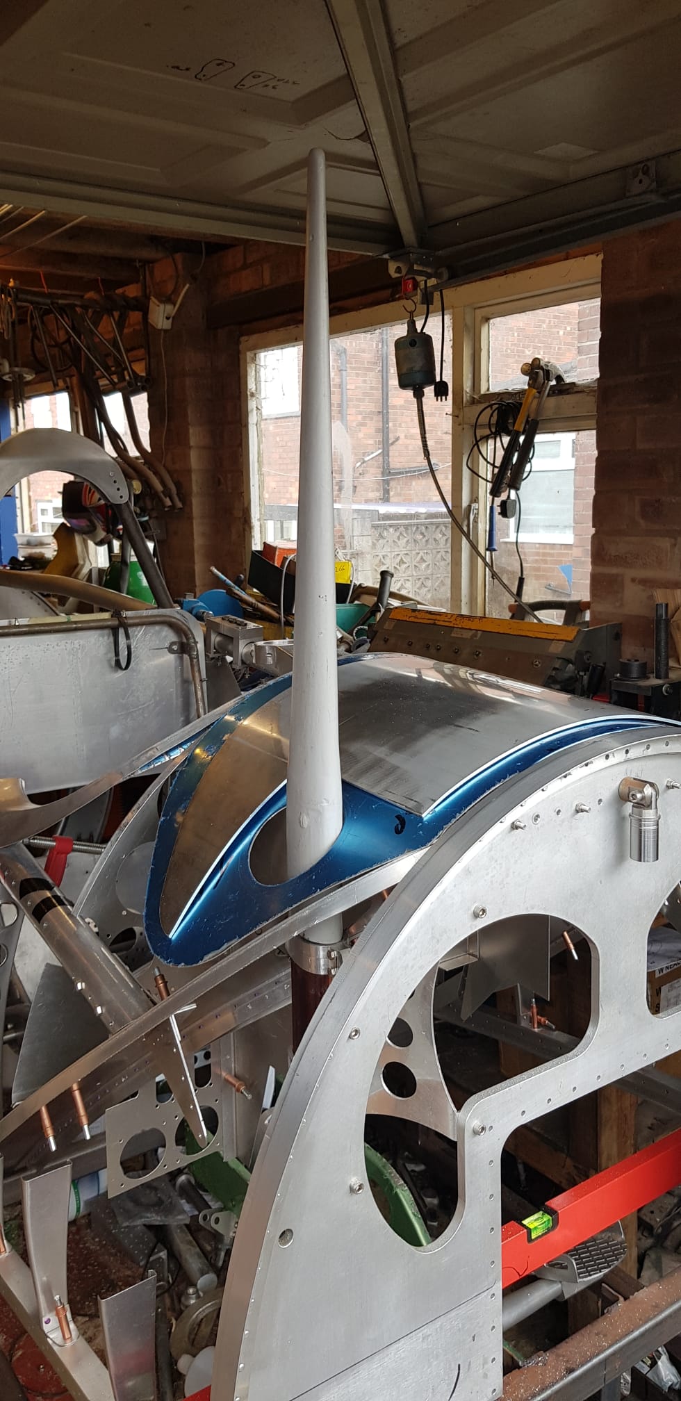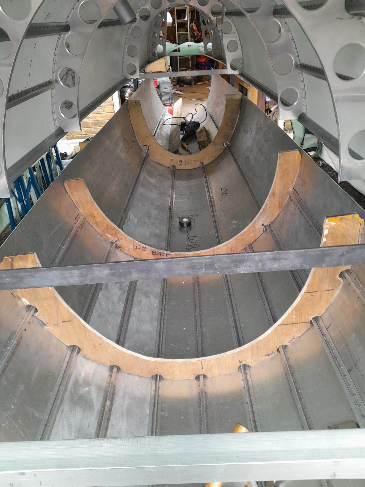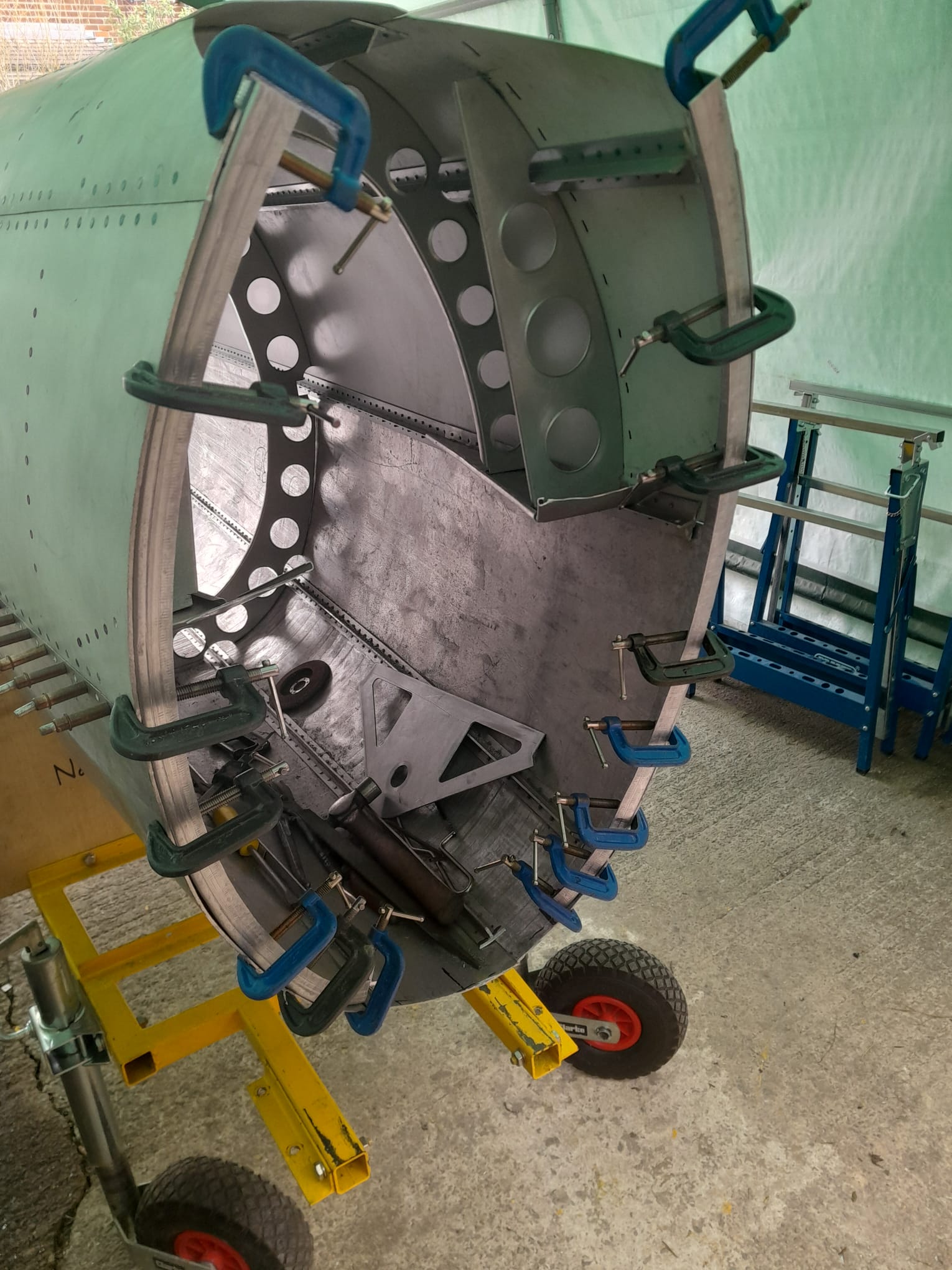 A major milestone was reached in May 2023 when the completed cockpit, fully equipped with functioning controls and instrumentation, was delivered to the Kent Battle of Britain Museum. Work then focused on the rear fuselage, a 13-foot structure of considerable complexity. Rather than forming a simple tapered tube, the fuselage is constructed from ten individually shaped alloy panels, each with its own compound curvature requiring extensive hand-forming. The structure was assembled in upper and lower sections before being joined on a custom-built frame, and in 2024, the fuselage was successfully transported and mated with the cockpit, marking a significant step forward.