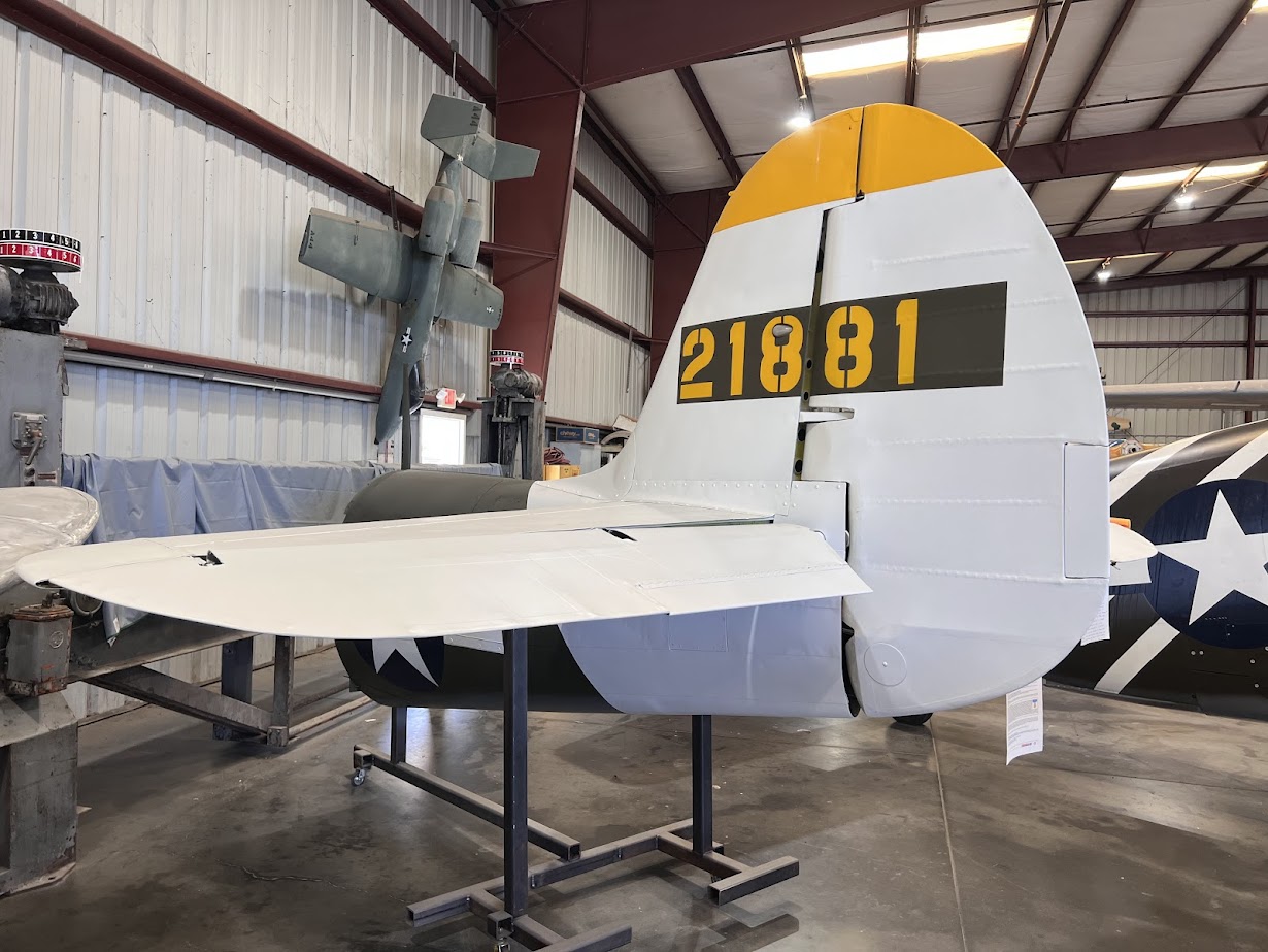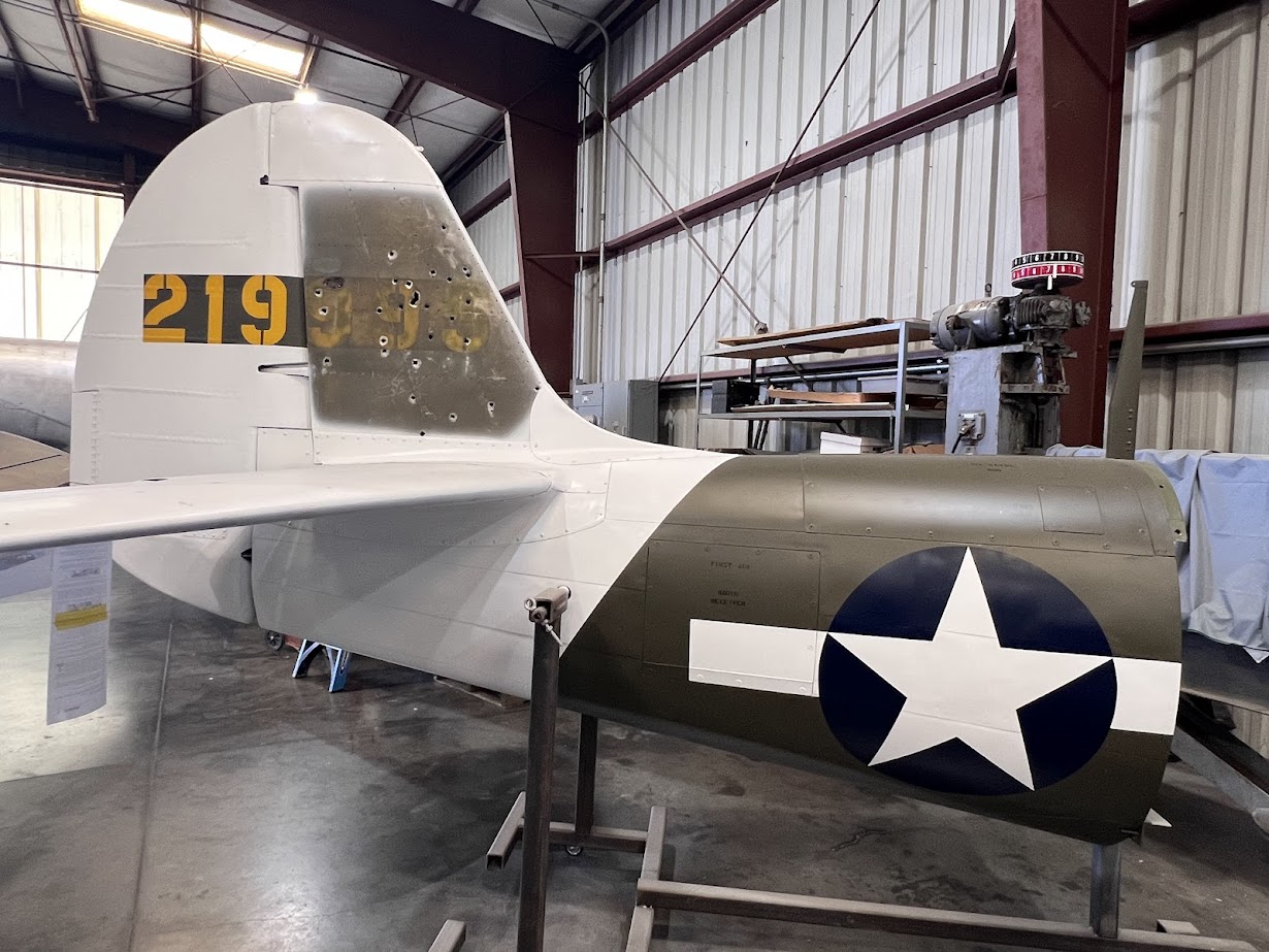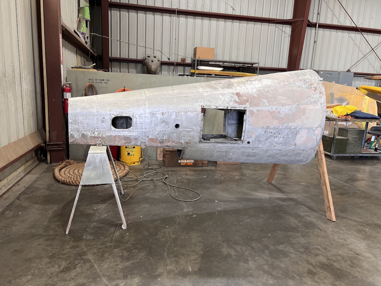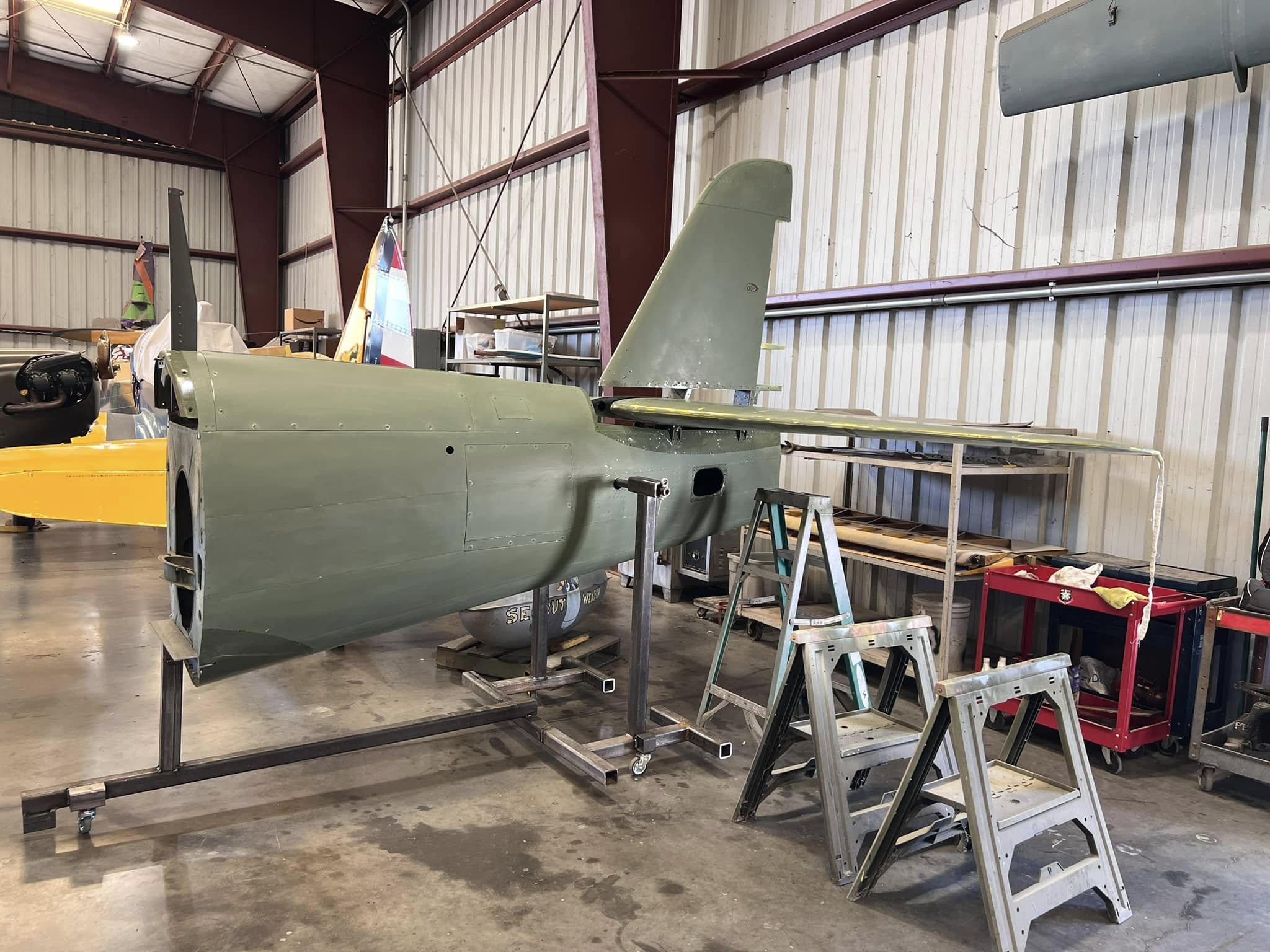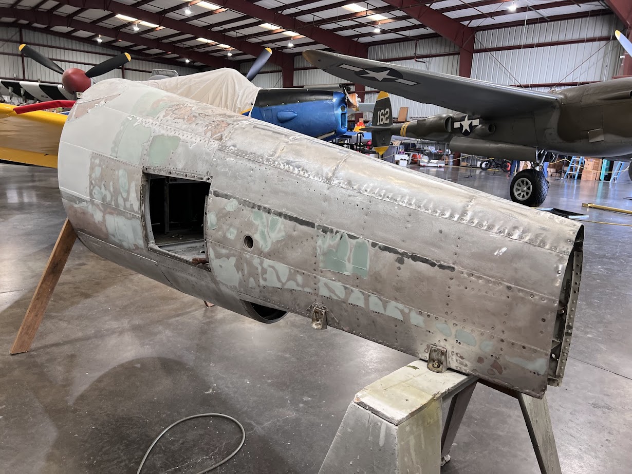Regardless, the P-39N Airacobra painted as “Little Sir Echo”/”Small Fry” was a static display at the Planes of Fame, but in 2019 the Planes of Fame began on a new restoration of the aircraft. Layers of Bondo were stripped from the airplane, especially from the upper and lower surfaces of the wings. Work progressed slowly but steadily, in spite of events such as the COVID-19 pandemic, which put a temporary halt to the project. The recent stages of the project have seen the Airacobra’s restoration become the domain of Planes of Fame mechanic and researcher Cory O’Bryan, who also works on projects for Steve Hinton’s workshop Fighter Rebuilders. Though the projects at Fighter Rebuilders have sometimes taken priority, O’Bryan has been working extensively on adding new sheet metal, replacing corroded panels with holes that were masked by layers of Bondo.