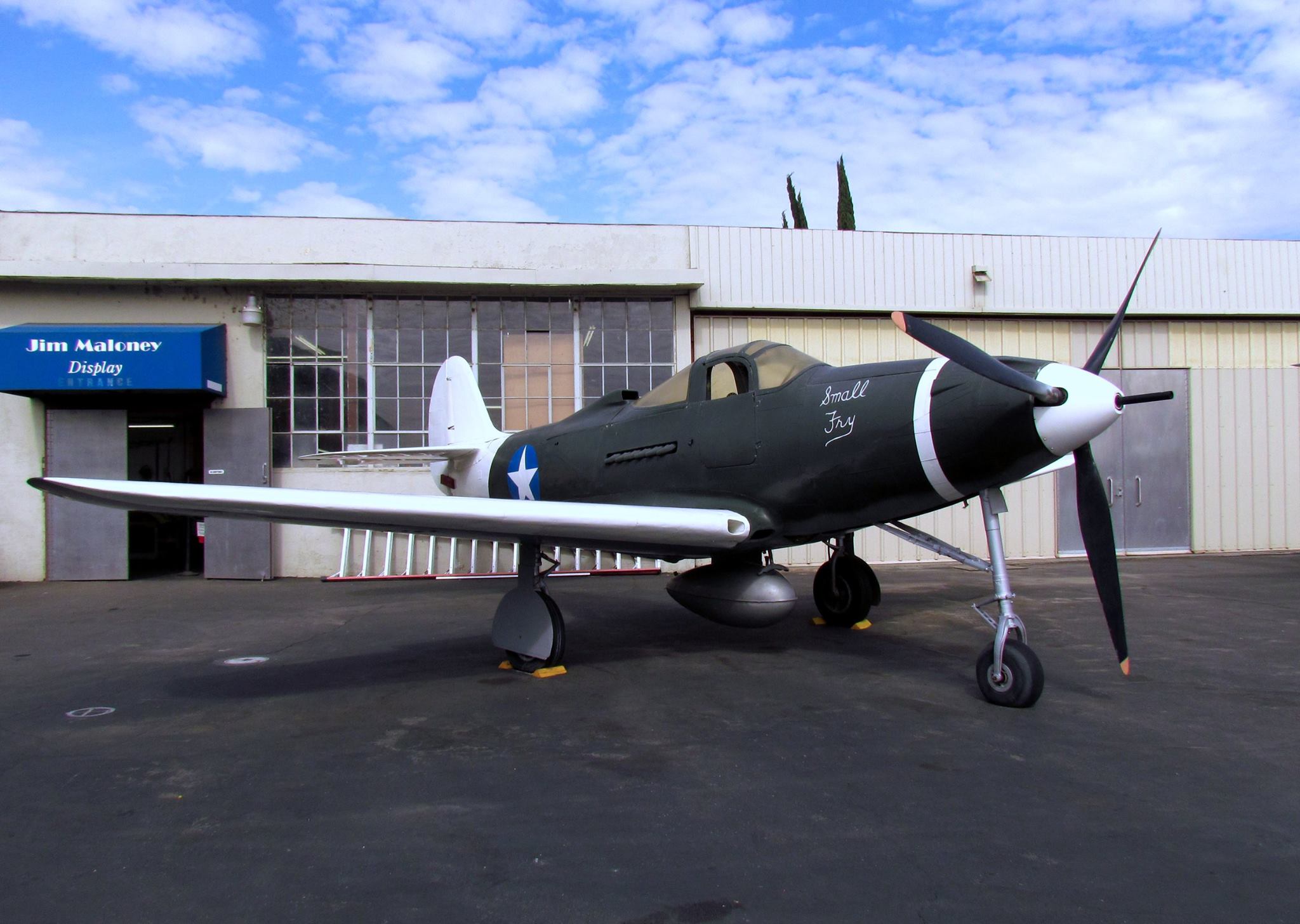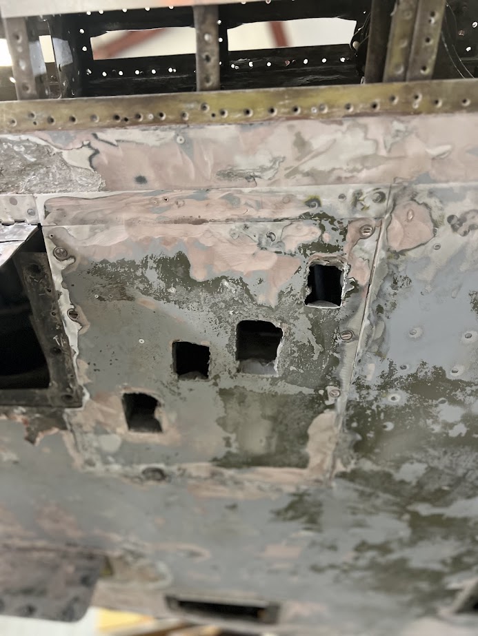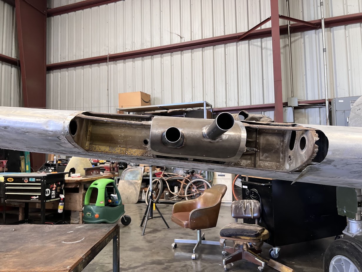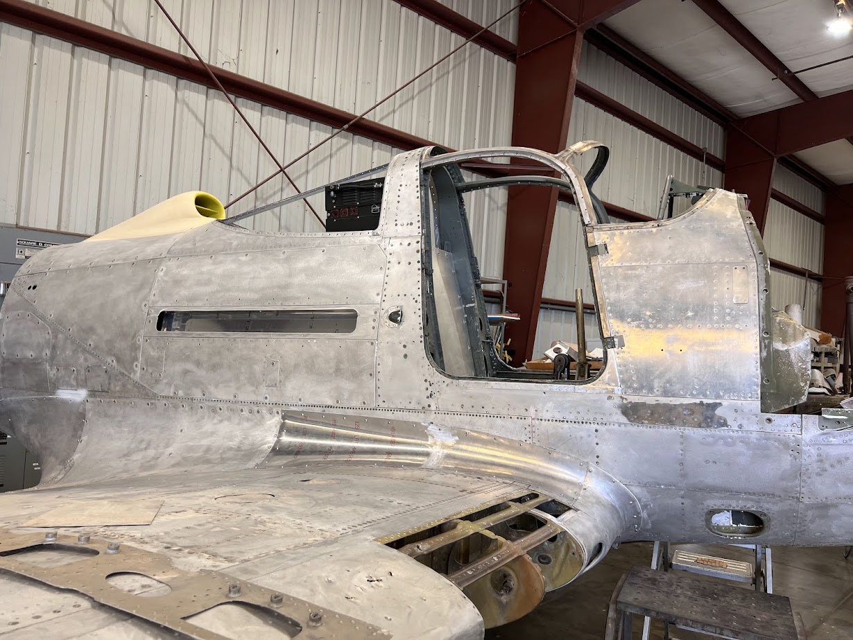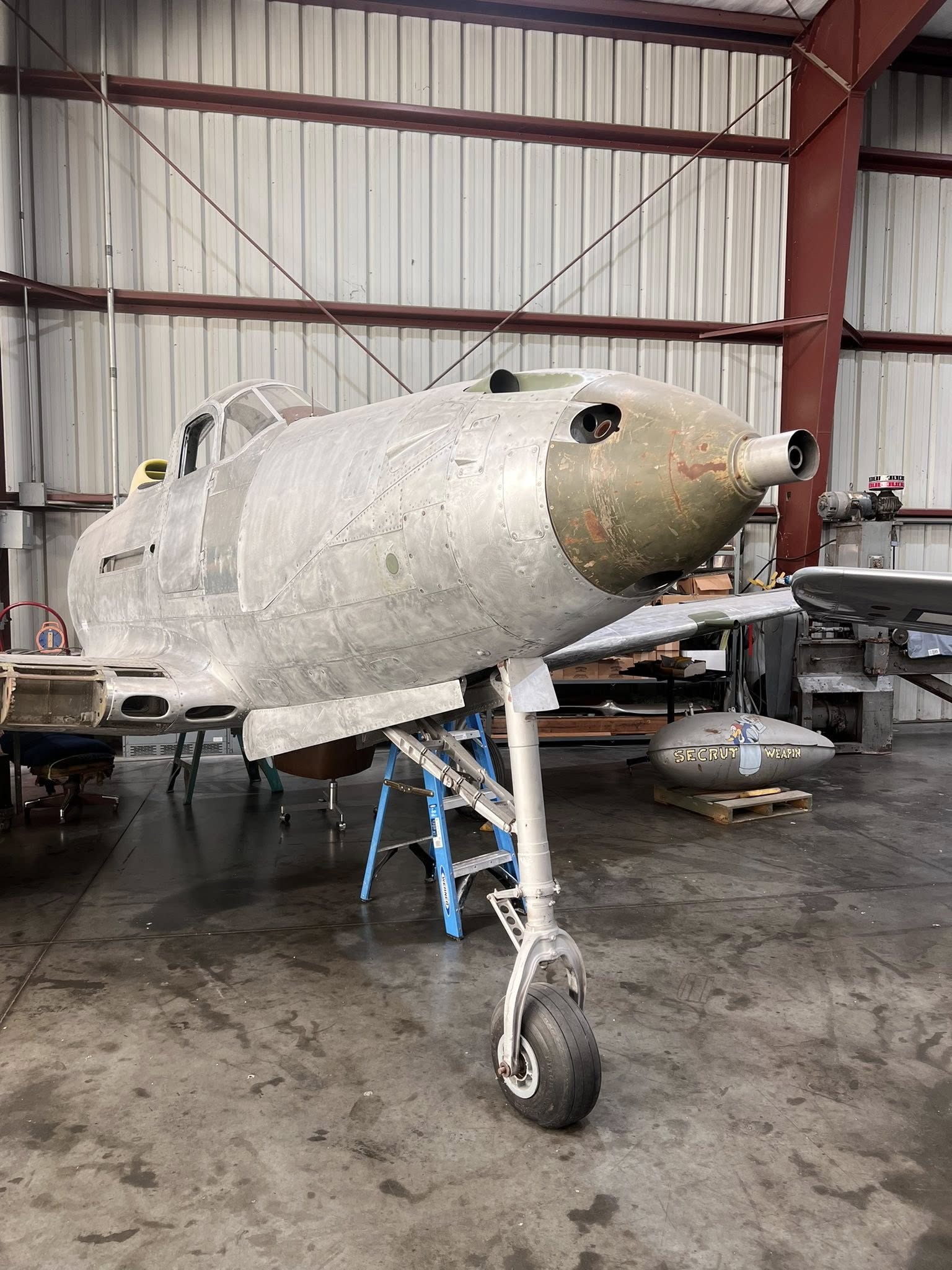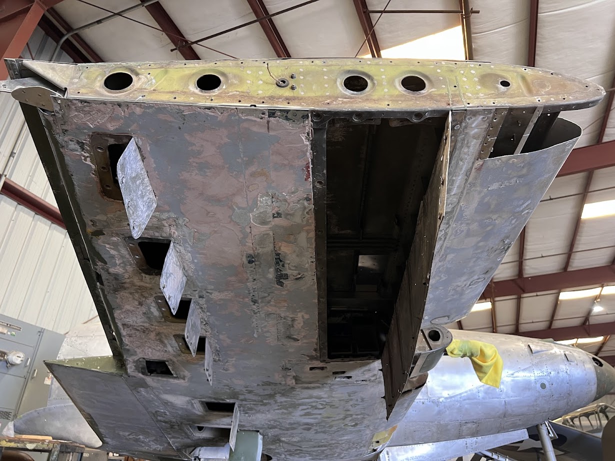 Regardless, the P-39N Airacobra painted as “Little Sir Echo”/”Small Fry” was a static display at the Planes of Fame, but in 2019 the Planes of Fame began on a new restoration of the aircraft. Layers of Bondo were stripped from the airplane, especially from the upper and lower surfaces of the wings. Work progressed slowly but steadily, in spite of events such as the COVID-19 pandemic, which put a temporary halt to the project. The recent stages of the project have seen the Airacobra’s restoration become the domain of Planes of Fame mechanic and researcher Cory O’Bryan, who also works on projects for Steve Hinton’s workshop Fighter Rebuilders. Though the projects at Fighter Rebuilders have sometimes taken priority, O’Bryan has been working extensively on adding new sheet metal, replacing corroded panels with holes that were masked by layers of Bondo.