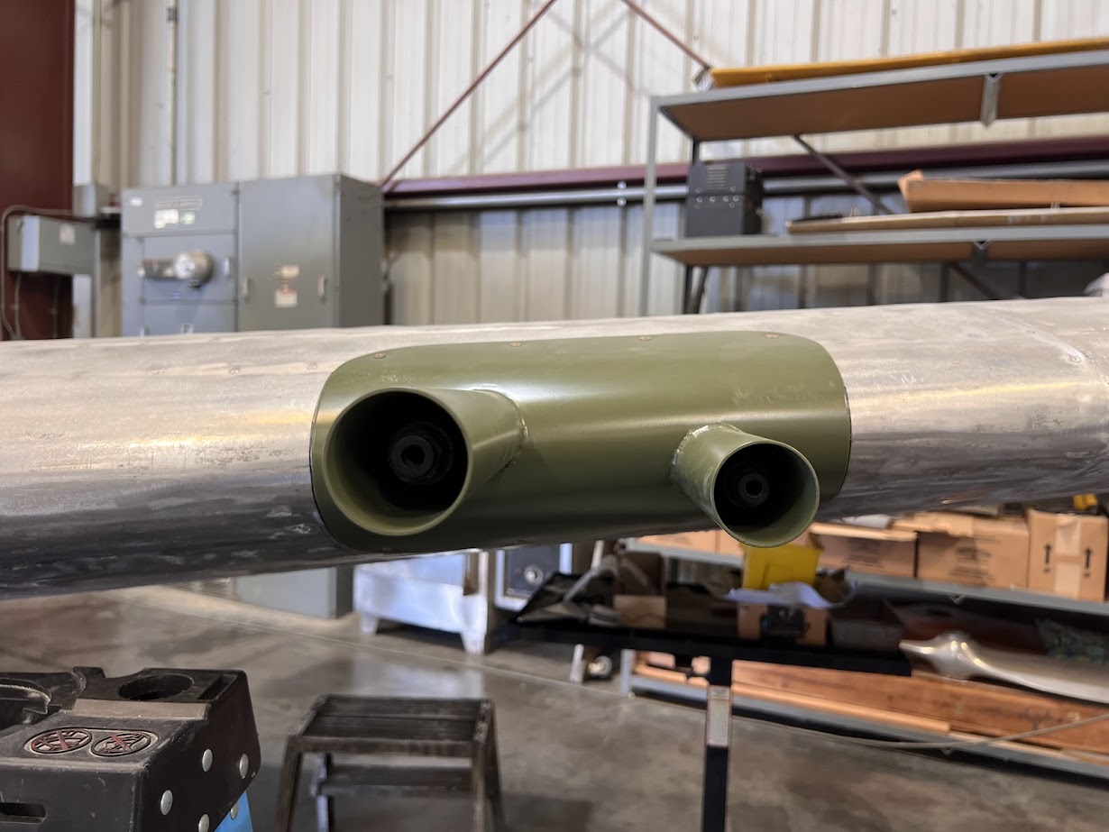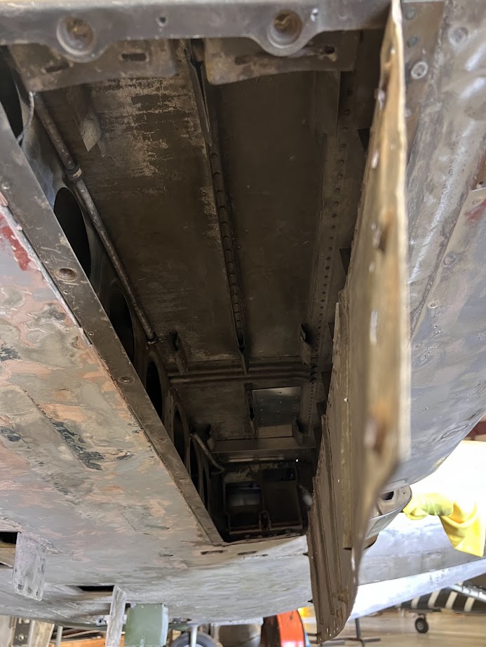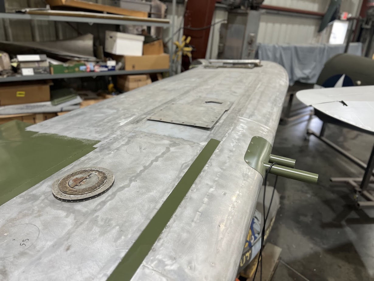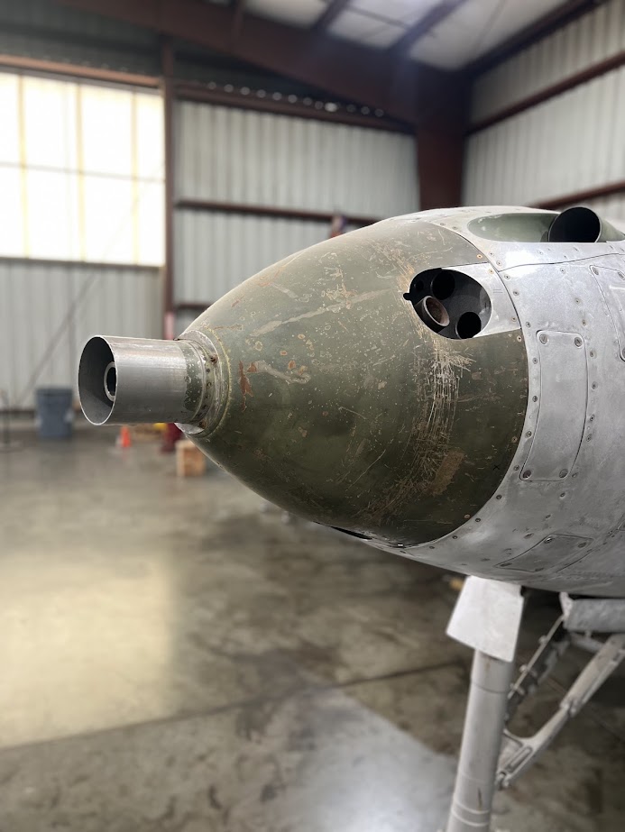 In order to facilitate the restoration, the museum removed the tail section of the P-39, which has now had its sheet metal panels repaired and repainted, with the left side and the right side painted to represent two separate P-39s of the 71st Tactical Reconnaissance Group based on traces of recovered aircraft found on the airframe. Meanwhile, wing access panels to the P-39’s wing tanks and ammunition stowage compartments previously fared over or covered by layers of Bondo have been restored. One difference that will be more evident on the leading edges of the wings will be the newly refabricated gun barrels for the Airacobra’s wing-mounted machine guns, as these gun ports, which had steel barrels over the muzzles of the four .30 caliber machine guns, were previously fared over. Using a damaged original panel with two barrels as reference, O’Bryan has added two refabricated steel gun ports to the wings of the Airacobra. Additionally, the Bondo that had covered the ejection chutes from which spent cartridges would fall from the aircraft has largely been removed, showing the more attentive visitors another aspect of the aircraft’s design.
