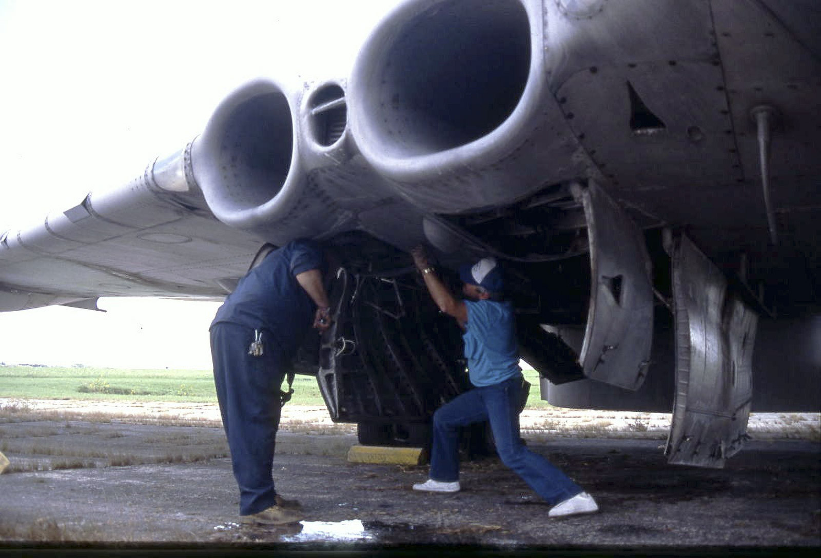 The volunteer disassembly team working to dismantle the former Mexicana Comet 4C at O’Hare Airport in the late 1980s. (photo via Steve McNeilly)