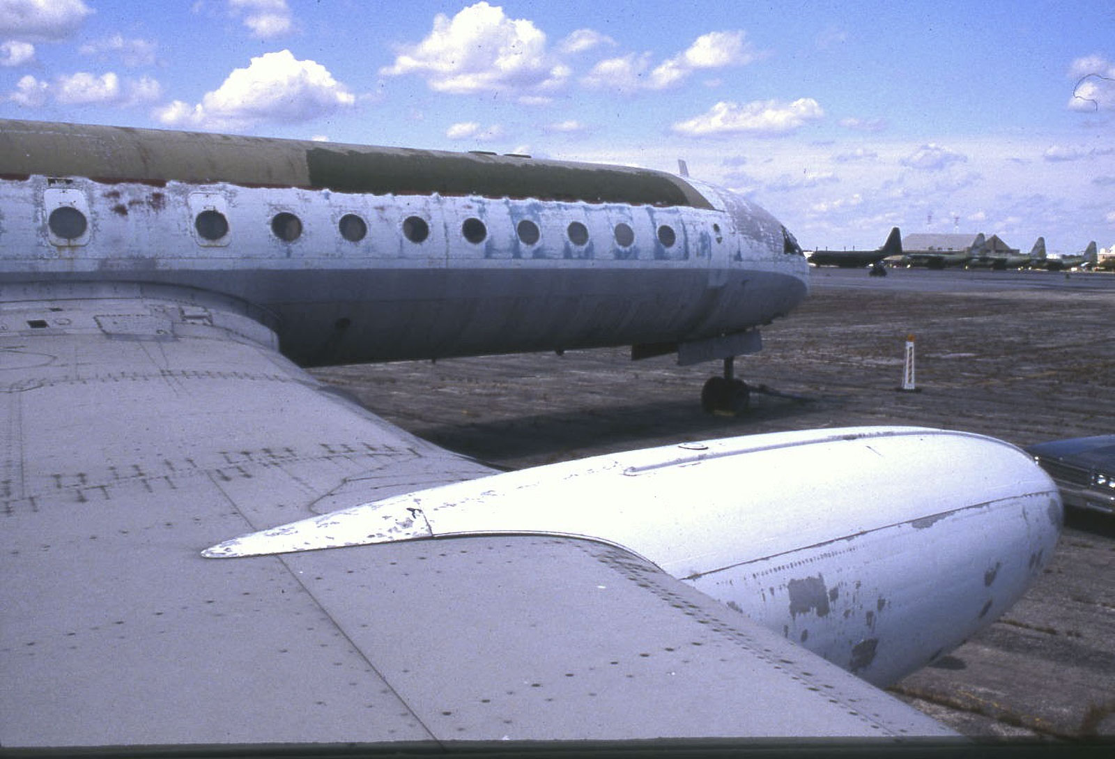 The former Mexicana Comet 4C XA-NAS sitting at O’Hare Airport before the dismantling effort began circa 1987. Note the Illinois Air Guard C-130s in the background. (photo via Steve McNeilly)