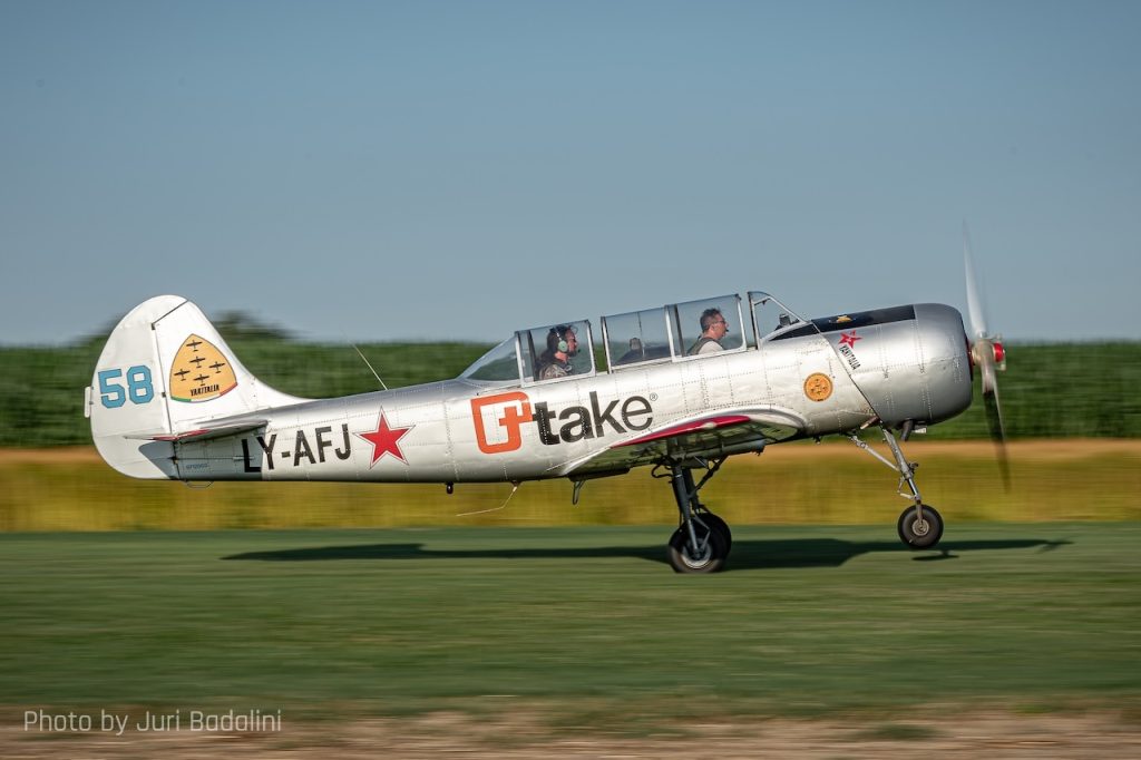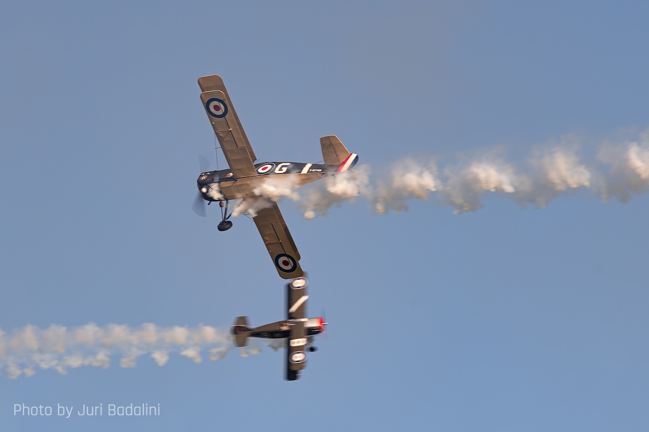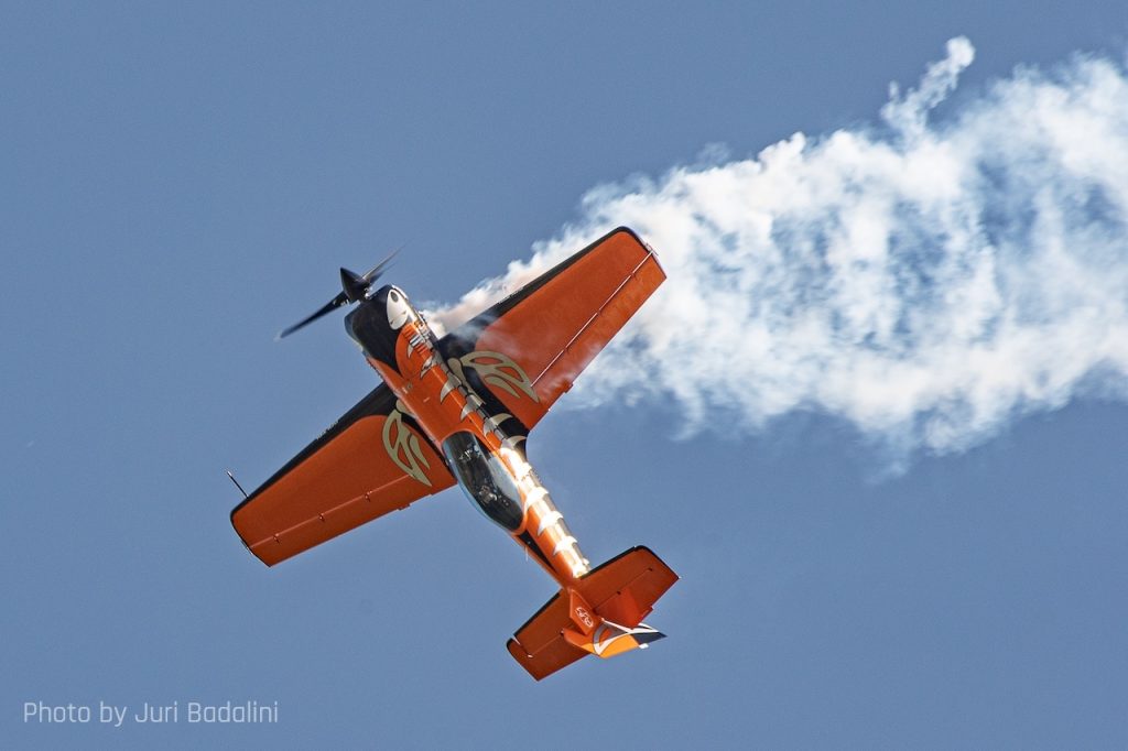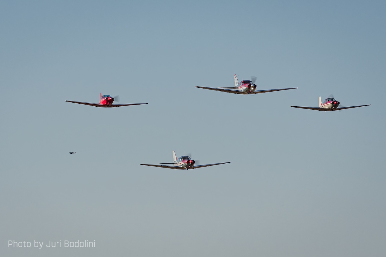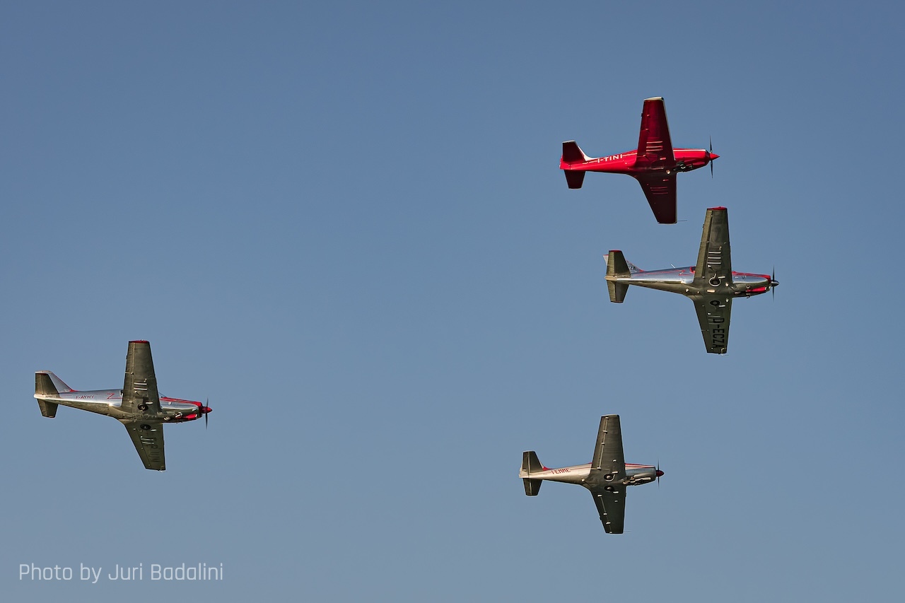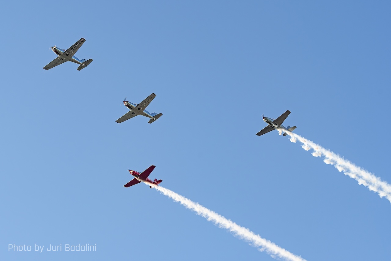 Other highlights included the colorful Sukhoi Su-31M of Guido Racioppoli, its thundering Vedeneyev M14 engine and triple-blade prop making for a jaw-dropping performance. The ever-reliable Maurizio Costa flew his Pitts S2 in support of Acronadia, which raises funds for pancreatic cancer research—a now-beloved FLYPARTY tradition. We also welcomed the elegant Stearman of Giovanni Carugno and an exciting joint display from our own Yak-52 pilots, Davide Guida and Umberto Bertolotti, along with the T-Take Team from Jesolo.