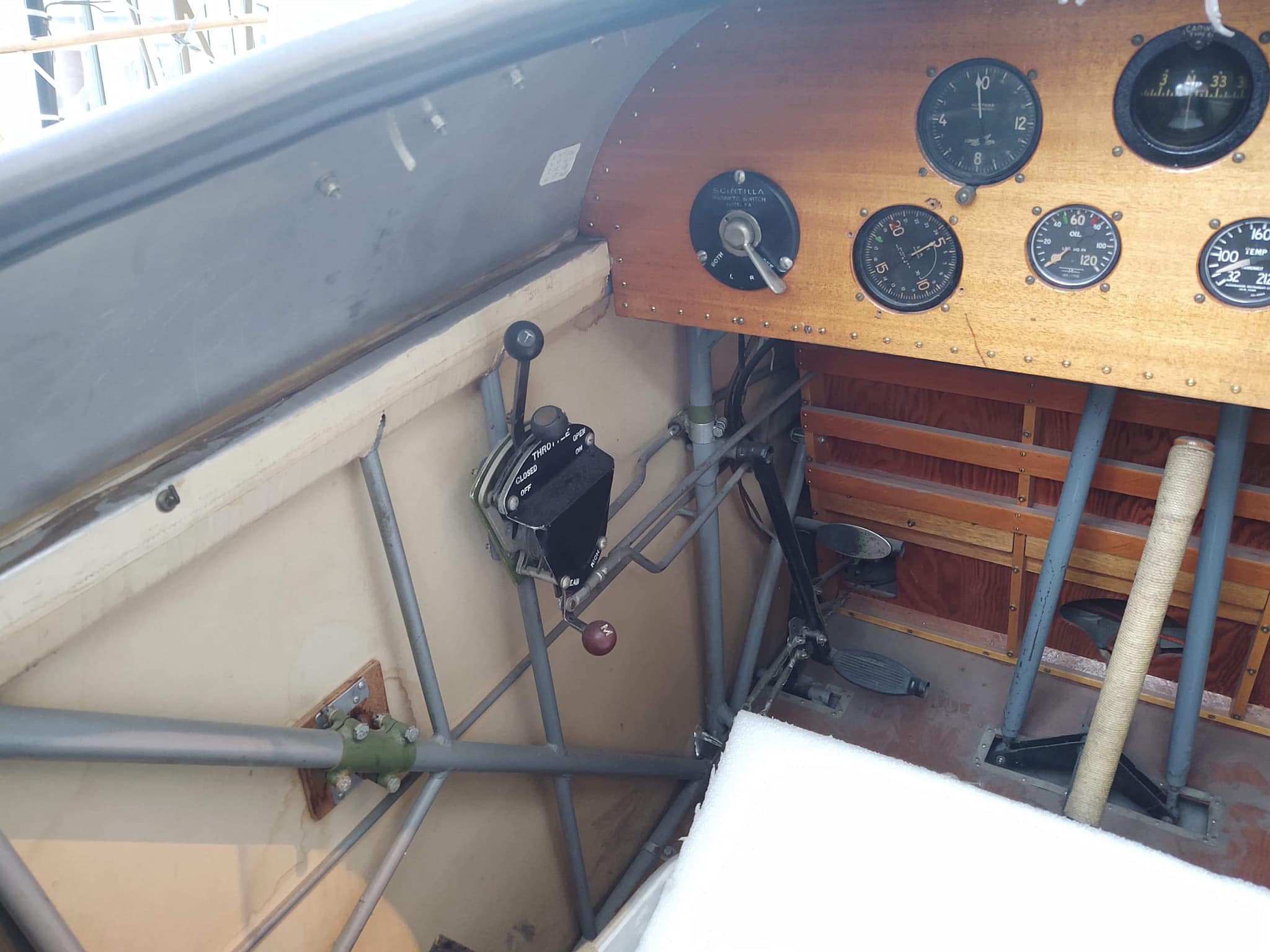Throttle qudrant in the cockpit of Stearman C-3B N7550 on display at the Museum of Flight, Seattle, Washington. (Don England)