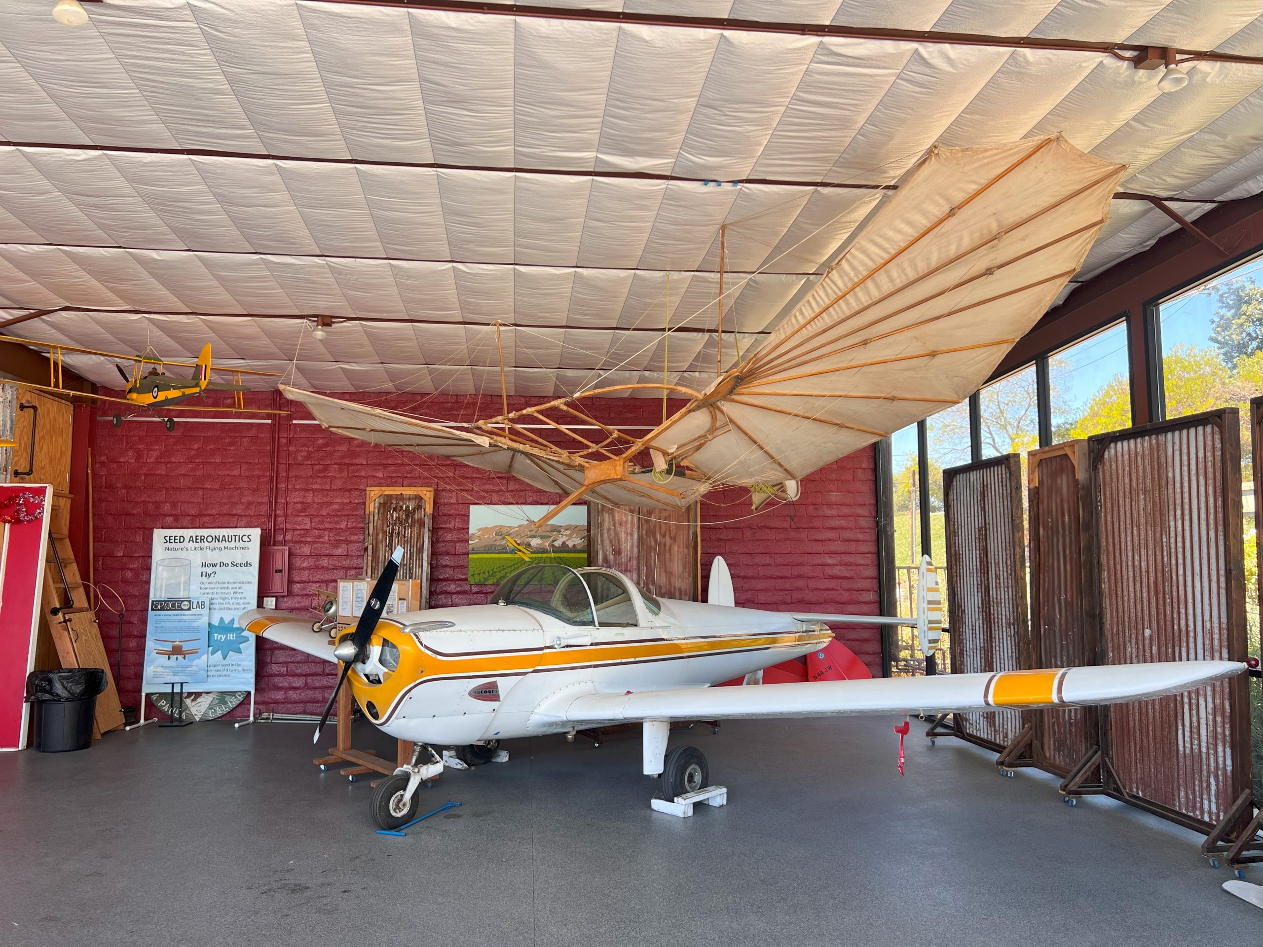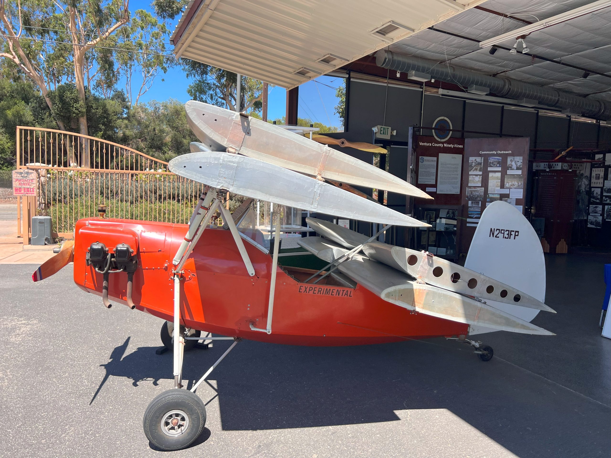 Across the tarmac, the museum maintains another hangar, which includes a replica of Otto Lilienthal’s glider from the 1890s suspended above an Erco Ercoupe, N99853. On the opposite end of the hangar from the Lilienthal glider is a biplane hang glider wearing markings inspired by the all-red scheme of the Red Baron’s fighter aircraft of WWI, complete with red paint and Iron Crosses. Besides the airplanes of the Aviation Museum of Santa Paula, the museum is also rich in the history of the Santa Paula Airport. There is the horizontal stabilizer of an International OX-5, similar to the one flown by Ralph Dickenson back in the 1920s, while the exhaust collector ring from the Wright J-6-7 Whirlwind engine on Dickenson’s Stinson Detroiter is also on display next to the International’s stabilizer.