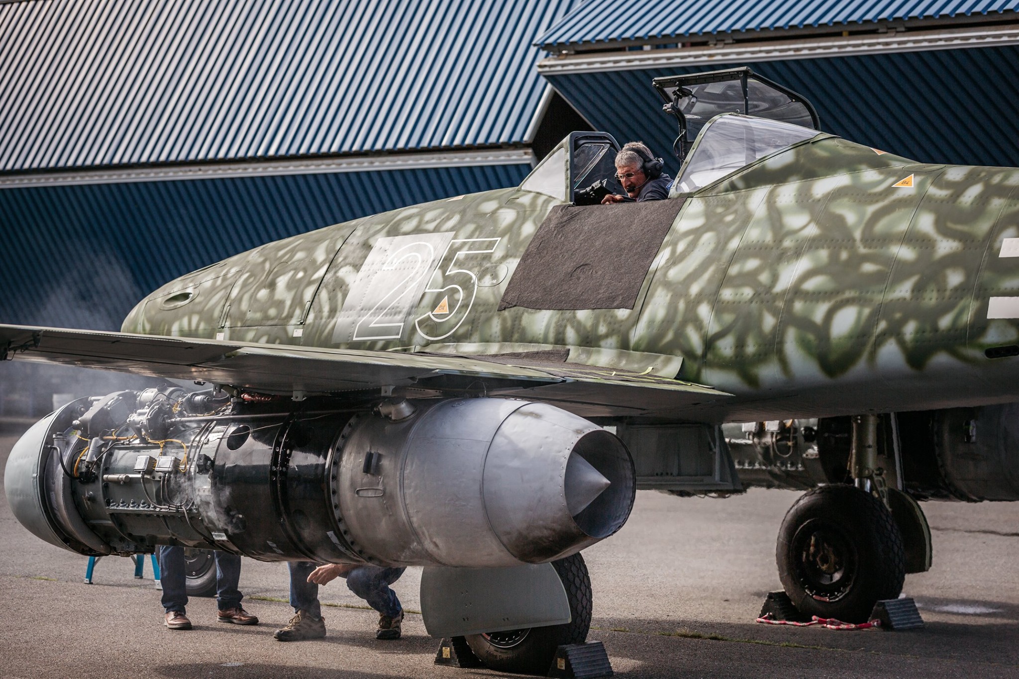 One of the biggest challenges in the restoration of the aircraft was in restoring the engines to be operational but yet safer than those built during the war. The original Junkers Jumo 004s were built in desperate conditions with fragmented supply chains producing often sub-standard materials. As a result, German WWII jet engines had an exceedingly low life expectancy, with some engines only being able to run for just 10 hours before requiring a complete overhaul. Many warbird enthusiasts doubted that the original engines could be restored to working order, but Paul Allen persisted. He hired Aero Turbine Inc. of Stockton, California, to overhaul the two Jumo 004B turbojet engines, and by 2015, the first test runs of the engines proved successful, marking the first time that any version of the Junkers Jumo 004 had run since 1951, when the Czechoslovakian Air Force retired the last of their locally-built Me 262s, the Avia S-92s, which were powered locally-built 004s designated as the Avia M-04.