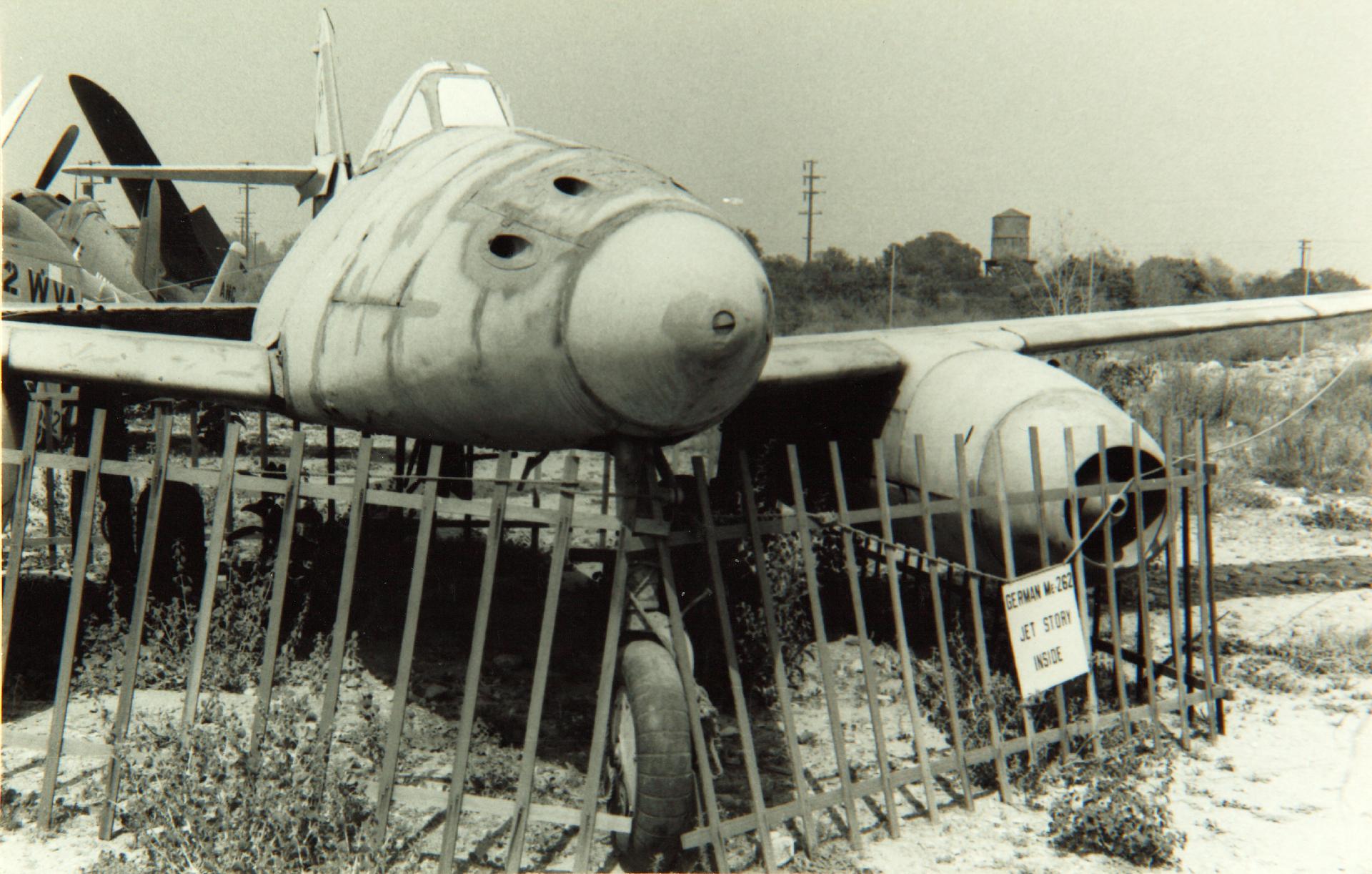 But luckily for the former Luftwaffe fighter, it would be saved from the scrapper’s torch by a young aircraft collector named Edward T. Maloney. Having grown up during the 1930s with a passion for aviation and filled with a drive to save as many historic aircraft as possible from the scrappers, Maloney would acquire Me 262 WkNr 500453 from Glendale and have it shipped to his home in Pomona as he worked to find a property to display this and other aircraft he saved. Among these were three more WWII fighters he had saved from Grand Central Airport (Bell P-63A Kingcobra 42-69080 (later acquired by the Yanks Air Museum in Chino, California and flown as “Fatal Fang”), Curtiss-built P-47G Thunderbolt 42-25254, and North American P-51A Mustang 43-6251, with the latter two being maintained today in airworthy condition. In 1957, Maloney opened his first air museum at a former lumberyard in nearby Claremont under the name The Air Museum. While some aircraft were displayed inside the sheet metal building, others, including the Me 262, still wearing its T2 number, remained on outdoor display until the Air Museum moved to Ontario Airport in 1963.