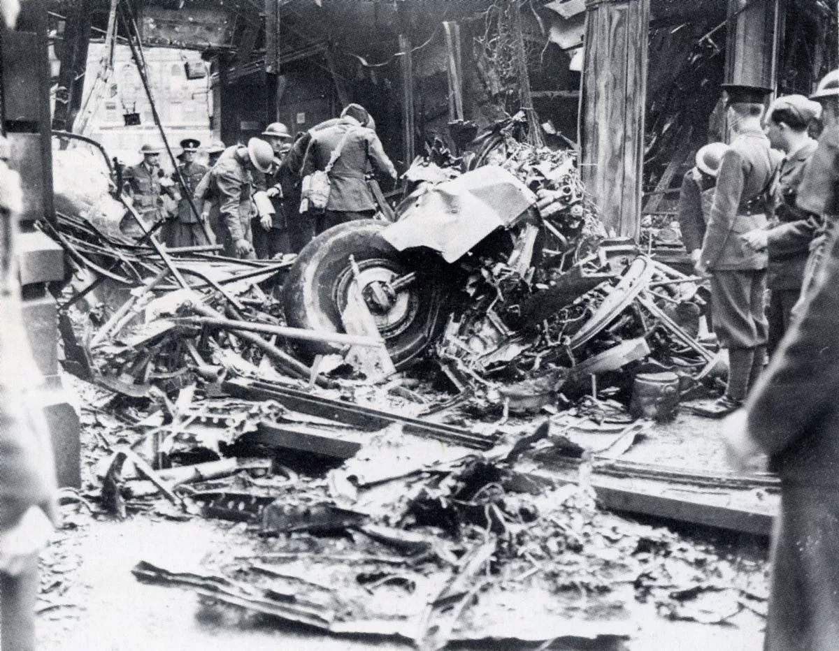 The Dornier went out of control, lost its wing tips, fell rapidly and crashed onto a tobacconist and jewellery shop at 142 Wilton Road, opposite the New Victoria Cinema and close to the forecourt of Victoria Railway Station. Its pilot had previously baled out and landed near Vauxhall Bridge in Kennington. Before he was arrested, the German pilot was set upon by a group of locals. He died of his injuries in Queen Alexandra’s Military Hospital, Millbank, the following day. The falling Dornier was filmed by a cameraman from the rooftops below. British Movietone News later took newsreel footage of firemen hosing the smouldering wreckage at the Wilton Road crash site. Holmes’s Hurricane TM-B was also severely damaged, and he, too, was forced to bale out. Watching his Hurricane crash at Ebury Bridge, on Buckingham Palace Road, Pimlico, Sgt Holmes floated down by parachute. He landed on the slanting slate roof of a house in Hugh Street, adjacent to the main electrified rail lines approaching Victoria Station, and slid down over the guttering into a garden below. His parachute caught on a drainpipe, and Holmes ended up dangling just above a dustbin. Two young girls watching from the neighbouring garden recalled witnessing Holmes’s descent. Unfastening his parachute harness and revealing his blue RAF uniform jacket and pilot’s wings, he was given a cheery reception by local residents. After brandies in the Orange Brewery on Pimlico Road, Holmes was taken to Chelsea Barracks and then back to his squadron in Hendon by taxi.