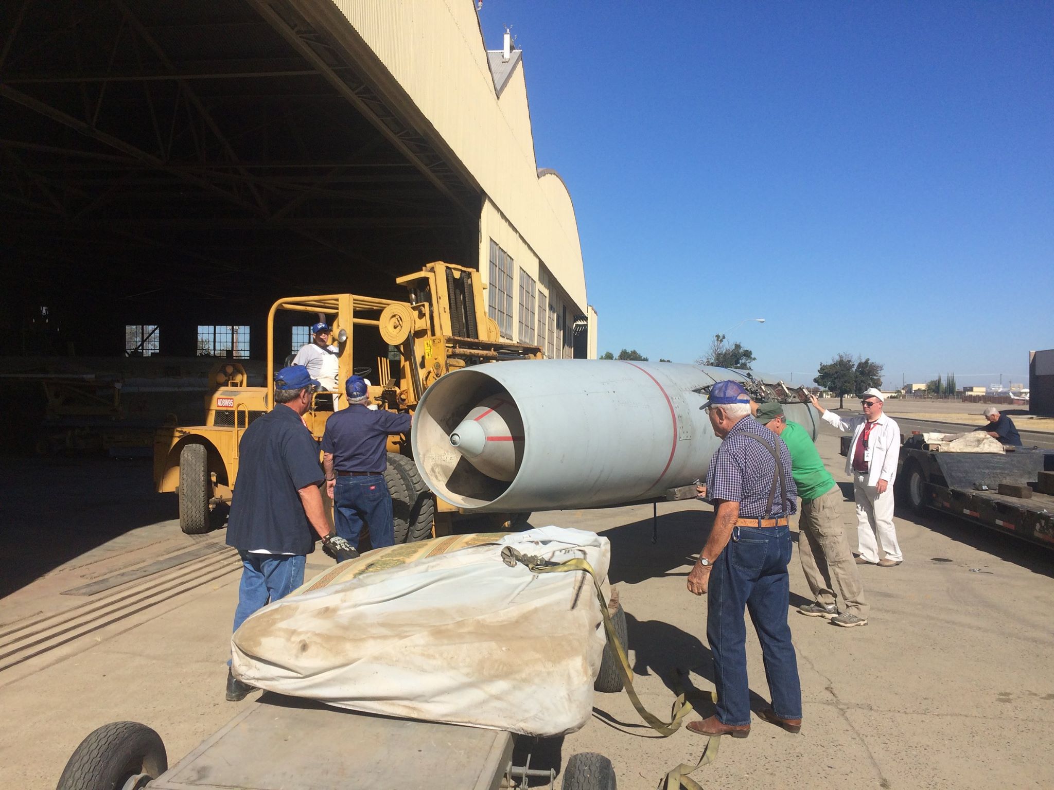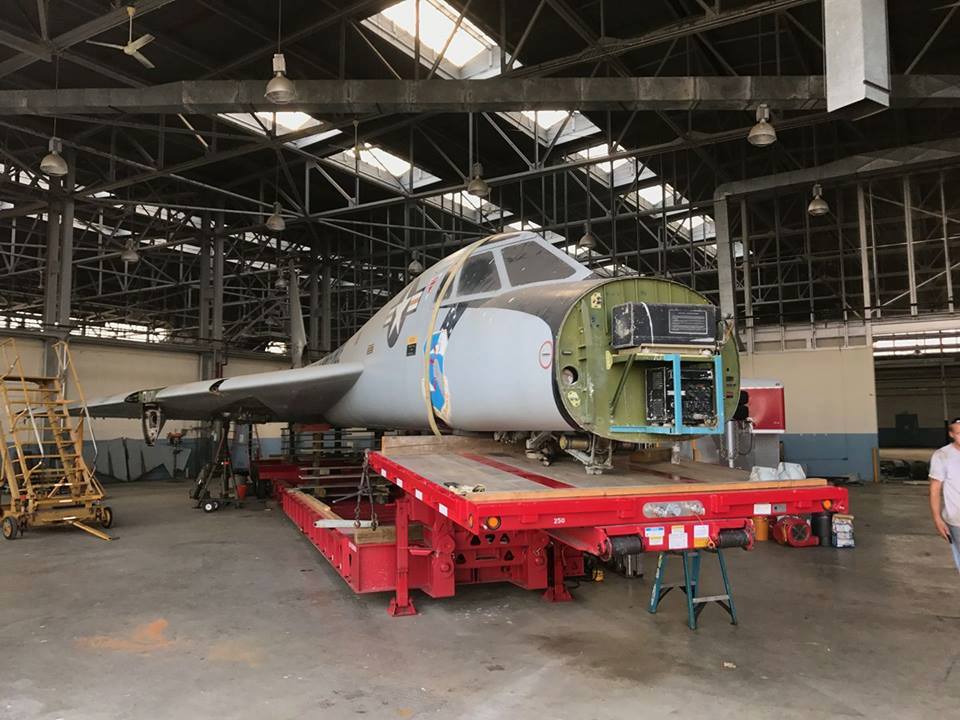 For more than 20 years, YB-58A Hustler 55-0666 was displayed inside Grissom Hall without engines, where the airframe regained her correct serial number on the tail, but retained its Greased Lightning nose art. Unfortunately, 55-0666 received damage when staff attempted to move the bomber with its main landing wheels locked, fracturing the nose gear. The aircraft would be held up by a wooden frame to keep the nose secure. Sadly for the staff at the Chanute Air Museum, the Village of Rantoul announced in 2015 that it could afford to pay the museum’s utilities, and since the museum did not generate enough revenue from visitors to come up with additional funds, the museum made the difficult decision to permanently close, with the final day for the museum being November 1, 2015. Since most of the aircraft, including B-58 Hustler 55-0666, were on long-term loan from the National Museum of the United States Air Force, several affiliate museums across the country were able to work with the NMUSAF to bring individual aircraft from Chanute to their museums, though several aircraft displayed outdoors were unfortunately scrapped onsite. Given the rarity of the Convair B-58 Hustler among surviving airframes, 55-0666 became highly sought after, and in 2016, it was announced that YB-58A Hustler 55-0666 would find a new home at the Castle Air Museum in Atwater, California, where another aircraft formerly displayed at Chanute, Convair RB-36H Peacemaker 51-13730, was already on display after it was transported in sections by rail from Chanute to Castle for reassembly between 1992 and 1994 (more on that story in these articles HERE and HERE).