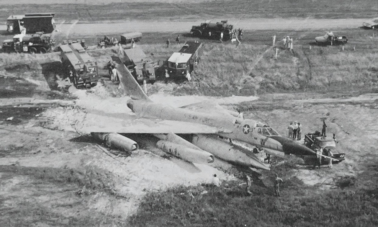 Much of 59-2437’s service life was routine, but on July 16, 1968, the aircraft was landing at Little Rock when the right main landing gear collapsed after the gear’s outer cylinder had failed prior to brake-release at takeoff. While the three-man crew consisting of Major George R. Tate, navigator/bombardier Captain Ray G. Walters, and defensive systems operator Captain Francis Mosson all survived without injury, B-58A 59-2437 was deemed to be a write-off. The aircraft was stripped of all useful components to keep the other B-58s at Little Rock operational for the last two years of service before 1970, and the aircraft was relegated to use as a ground trainer. During this time, the aircraft also earned the name Rigley’s Baby but was eventually towed to a remote corner of the base near a grove of trees and occasionally used for firefighter training.
