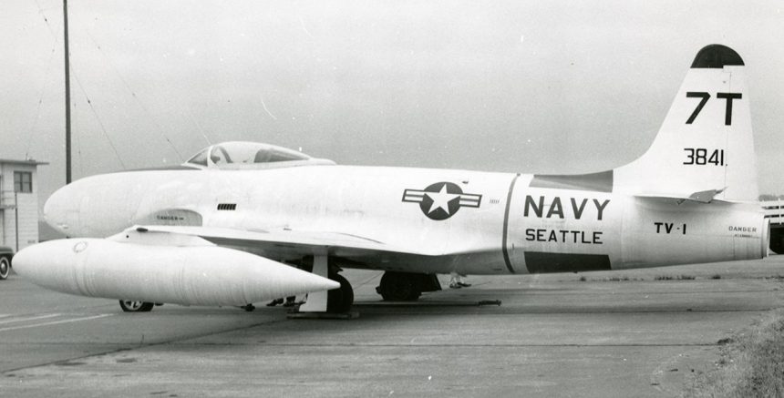 This Shooting Star had originally been manufactured in Lockheed’s Burbank, CA plant as construction number 080-2074 to be delivered to the US Army Air Force as a P-80C with the serial number 47-1388. In September 1947, the US Air Force became an independent branch of the US Armed forces, and subsequently, all Pursuit aircraft were redesignated as Fighters, with the P-80 becoming the F-80. But while the Air Force was receiving plenty of jets, and the US Navy was accepting its first dedicated carrier-based jets such as the Grumman F9F Panther and the McDonnell F2H Banshee, the Navy had experimented with the P-80 in 1946, and with the delay in the delivery of Banshees and Panthers to the fleet, combined with the Navy’s sense of urgency in transitioning its aviators from piston-engine propeller fighters to jet-powered fighters, the Navy ordered 50 F-80s to be transferred for use with land-based Navy and Marine units for training purposes in order to get the Navy aviators of Fighter Squadron 52 (VF-52) and Marine aviators of Marine Fighter Squadron 311 (VMF-311) acquainted with jet aircraft. In 1950, the TO-1s were redesignated at TV-1s, but as just as the Korean War started, the sought-after Banshees and Panthers began going into operational service in large numbers, with the TV-1s being reassigned to reserve units, and becoming the forerunners to a Navy variant of the Air Force’s T-33 trainer, the TV-2, along with a further navalised development of the TV-2, the T2V SeaStar.