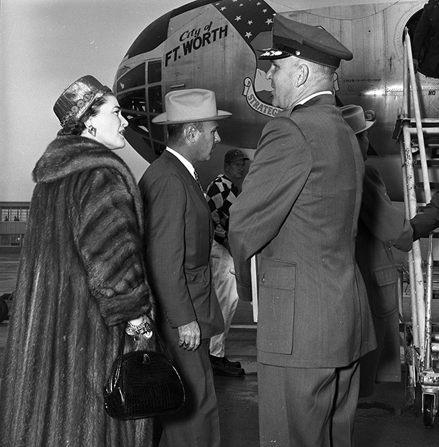 When the aircraft approached Fort Worth, the scheduled touch-and-go was cancelled due to local fog, and when it made a flyover over downtown Fort Worth, residents could not see the Peacemaker through the low-lying clouds, but the drone of its six Pratt & Whitney R-4360 Wasp Majors echoed through the fog, causing many to cheer at the sound of the massive bomber overhead. Meanwhile, residents of Arlington, Texas, could see the B-36 descending through the fog and clouds on approach to Amon Carter Field. B-36J 52-2827 touched down at 2:55 pm and arrived in front of the reviewing stand at precisely 3:00 pm.