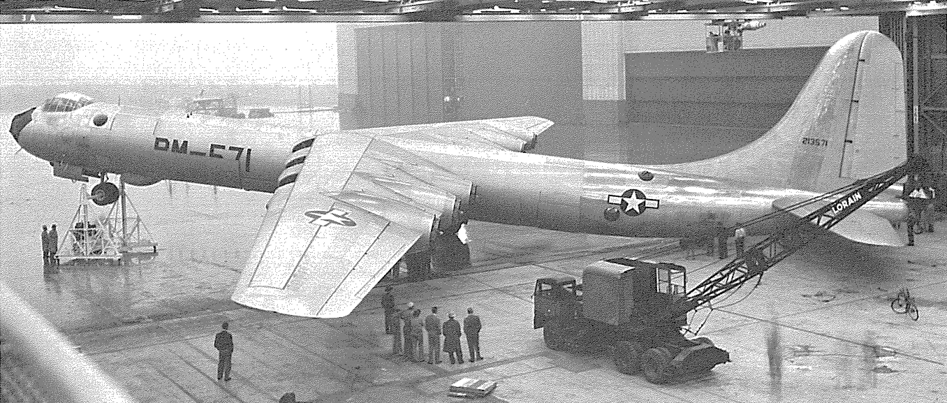 Built as construction number 383, it was already a significant aircraft even before its first flight, as it was the final Convair B-36 Peacemaker ever produced over the bomber’s production run at Fort Worth. On August 14, 1954, it was accepted by the United States Air Force as serial number 52-2827 and assigned to the 92nd Bombardment Wing of Strategic Air Command at Fairchild AFB near Spokane, Washington. Since it was the last B-36 off the production line, a public ceremony was held at Carswell Air Force Base that day, with retired General Joseph T. McNarney, president of Convair, delivering the aircraft to Major General Francis H. Griswold, vice commander of Strategic Air Command. The aircraft and its 13-man crew under the command of Major Laurence M. Nickerson of Thorndike, Maine, then took off, buzzed the crowd, and then turned northwest for Spokane.