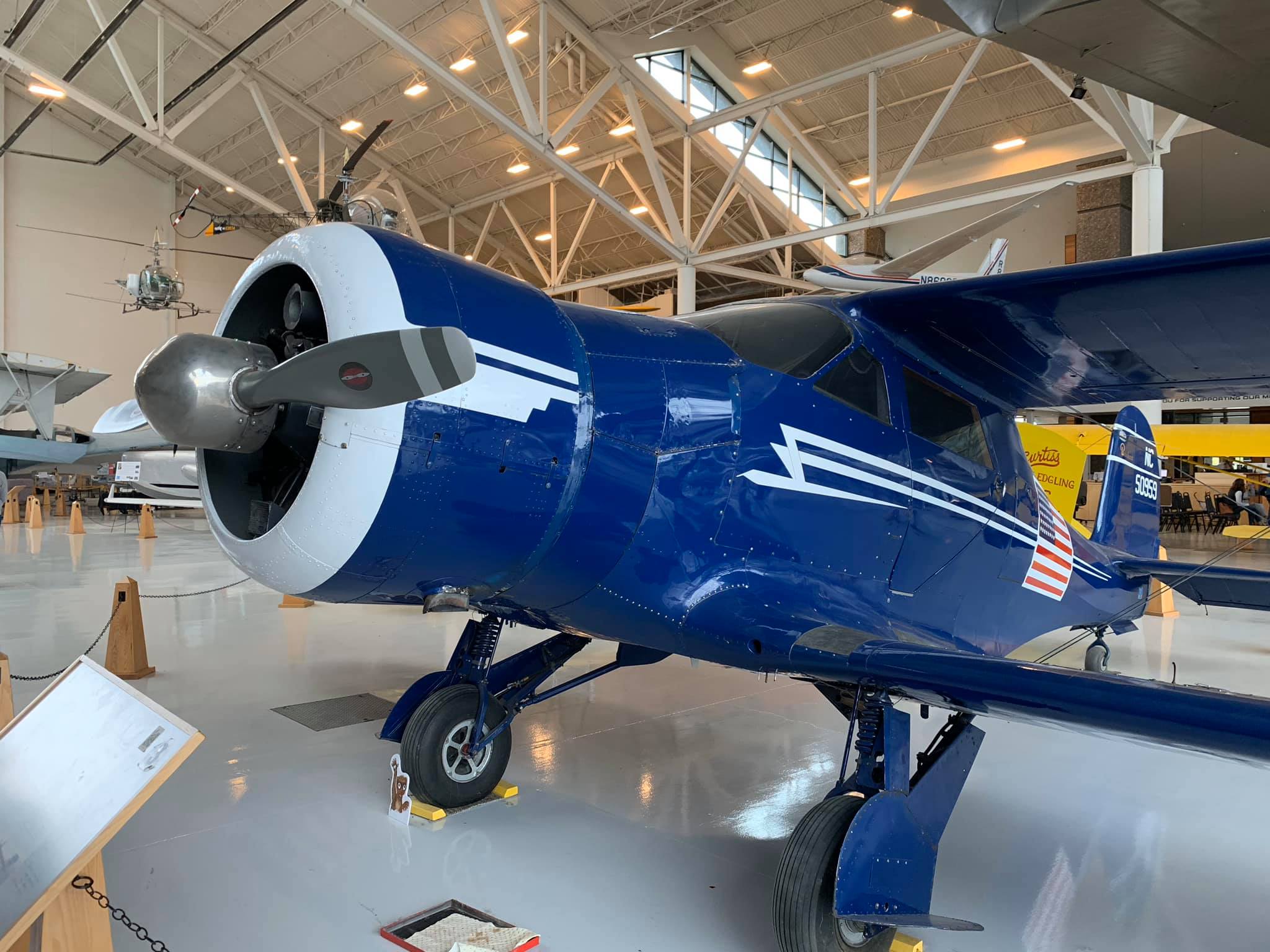 Editor’s notes: The Staggerwing on display at the Evergreen Aviation and Space Museum was originally constructed as manufacturer’s number 305 at the Beech Aircraft Corporation plant in Wichita, Kansas, in 1939 as a Model D17A, powered by a Wright R-760-E2 Whirlwind radial engine. The aircraft was registered as NC19453 and was later equipped with a Wright R-975 Whirlwind. In May 1942, NC19453 was impressed into the United States Army Air Force as the only UC-43F and was issued the USAAF serial number 42-49071. In July 1943, UC-43F 42-49071 was transferred to the US Civil Aeronautics Administration (CAA), the precursor to the FAA. In 1946, the aircraft was sold by the Reconstruction Finance Corporation to Alamo Airline Service, where it was re-registered as N50959. By 1990, it was owned by John L. Harbor of Central Point, Oregon, and was later donated to the Evergreen Aviation and Space Museum.