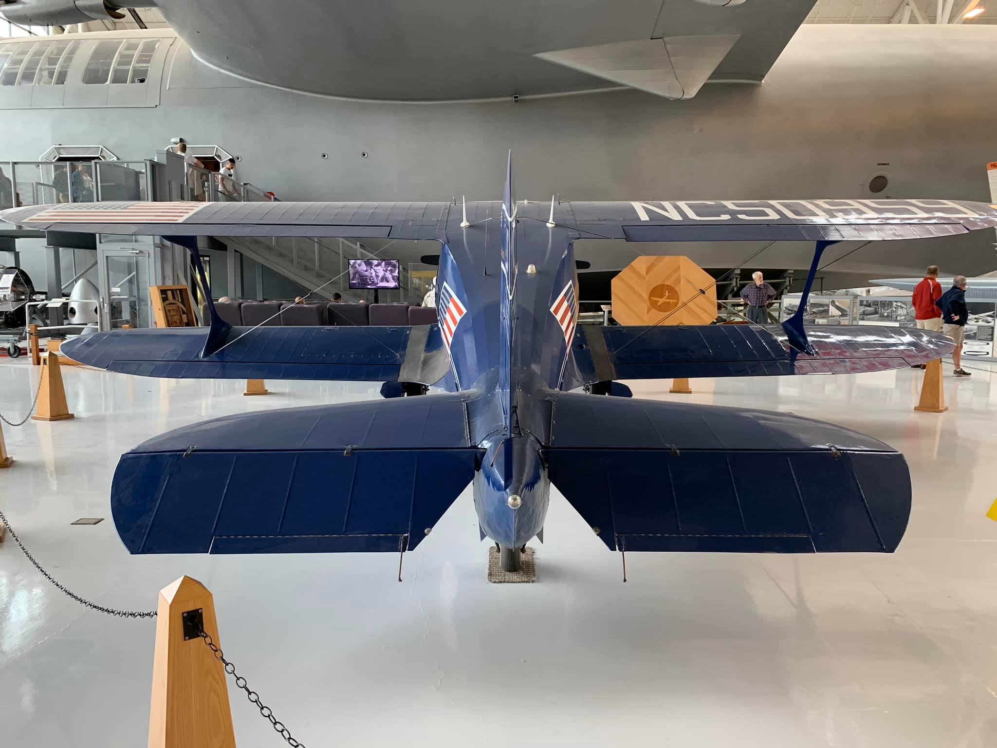 Tail end view of Beech Model 17 Staggerwing NC50959 facing the hull of the Spruce Goose. (Randy Malmstrom)