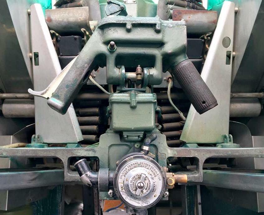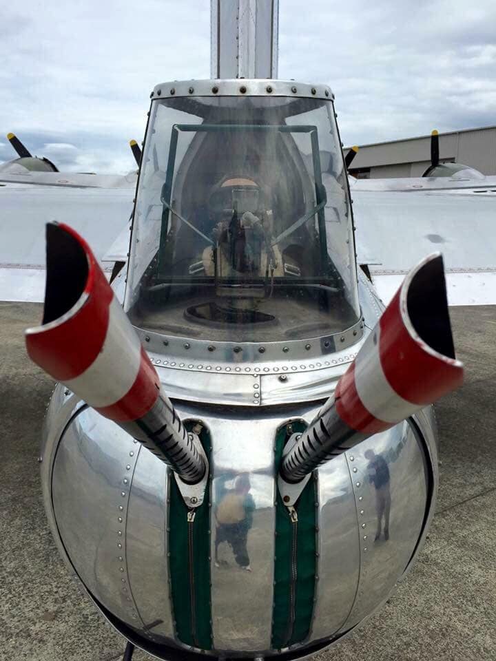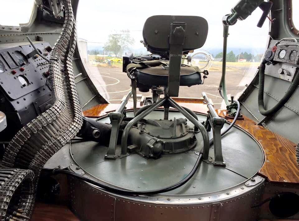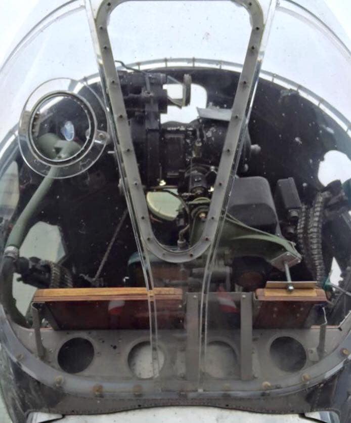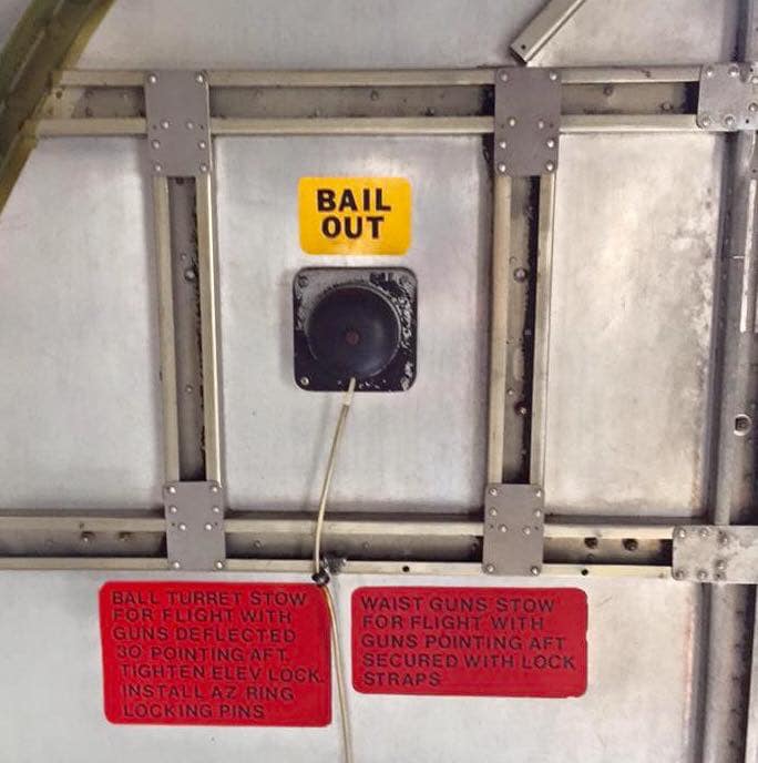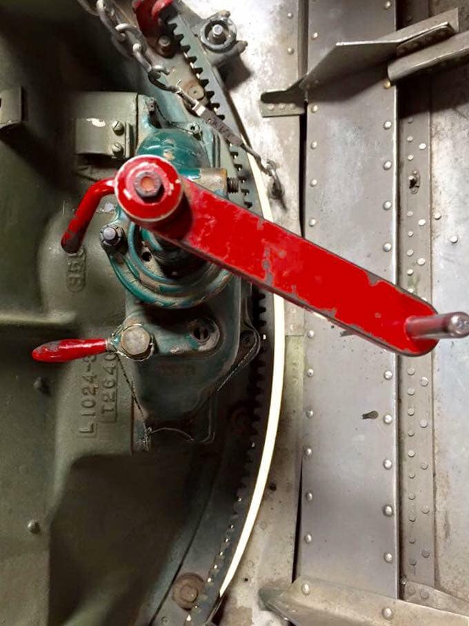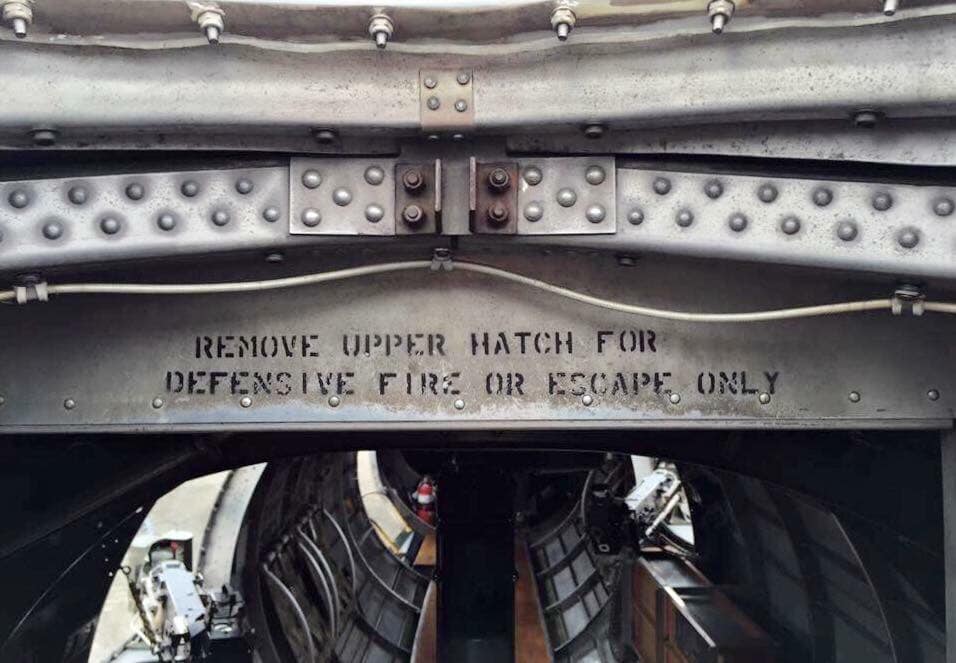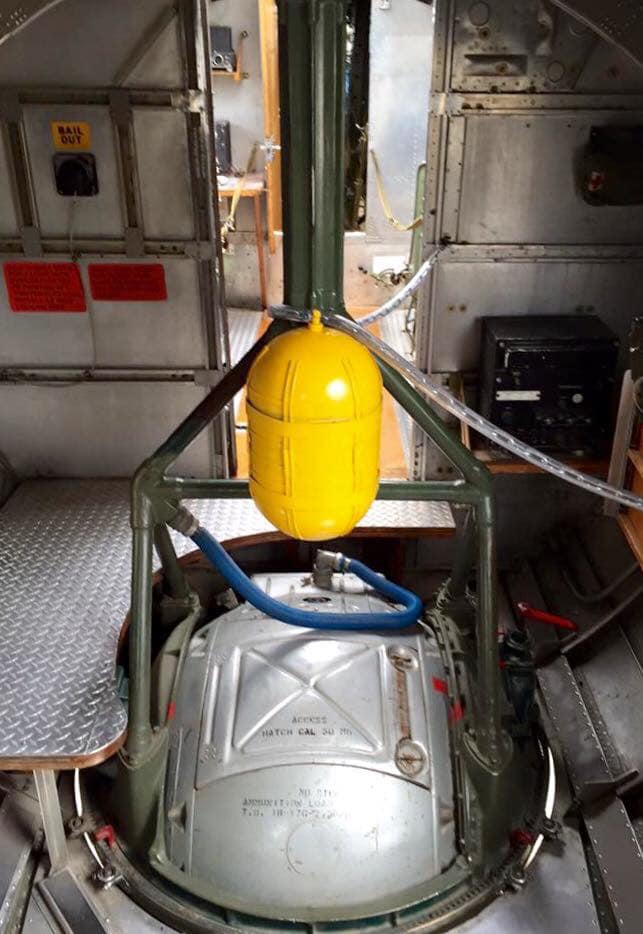 The radio room .50 cal. (either fixed mount or on a roller under the sliding radio room window) were largely done away with in the G models, but this restoration clearly has one. The ball turret gunner has gun charging handles on each side of his head, connecting joysticks with thumb buttons for controlling the turret and firing the guns, an intercom button by his left foot, foot pedals to electrically rotate the turret and adjust the azimuth, a hose to connect to his oxygen tank on the turret gimbal, and an emergency hand crank to rotate the turret in the event of a power failure. Statistically, this was not the most deadly position despite some common notions, and not all ball turret gunners were 5’4″.