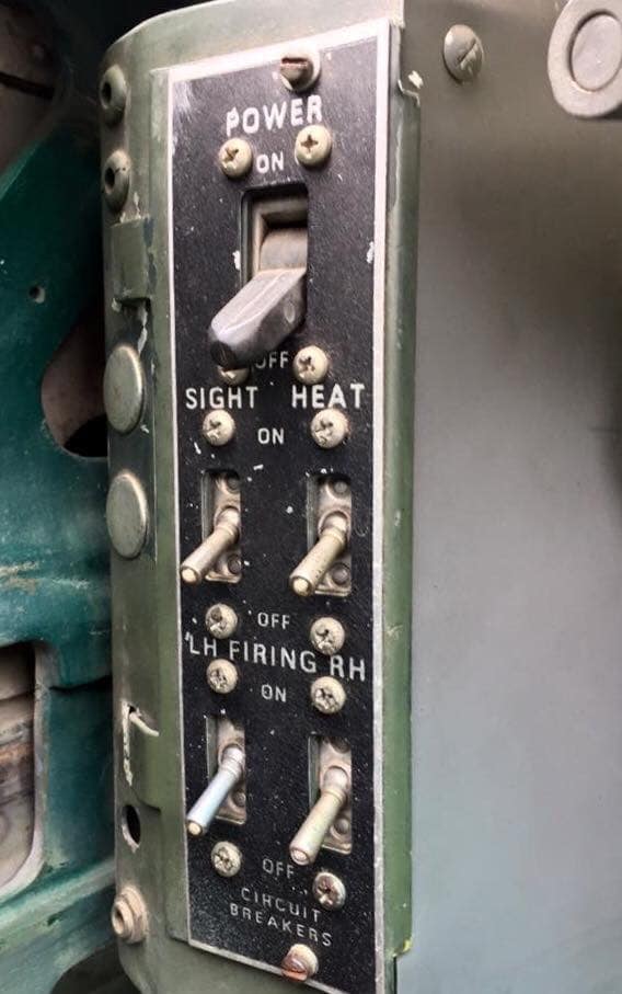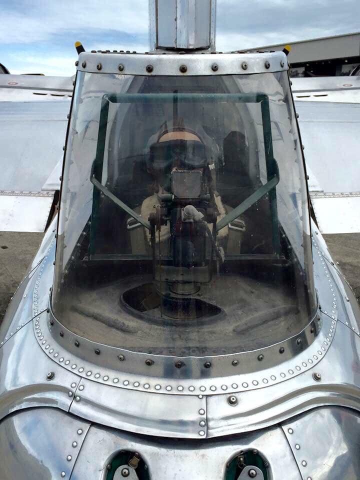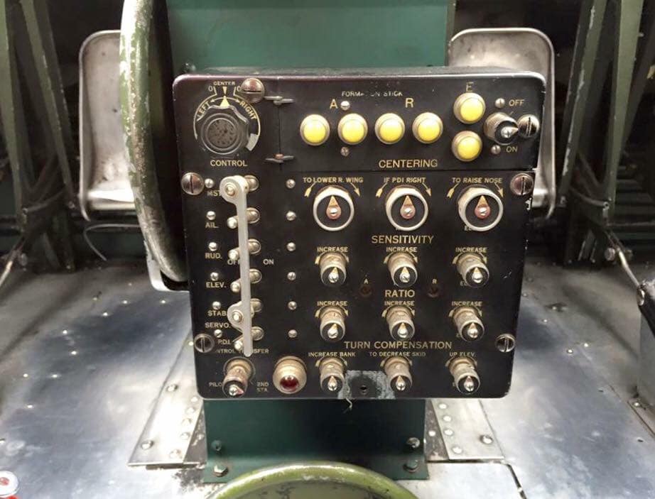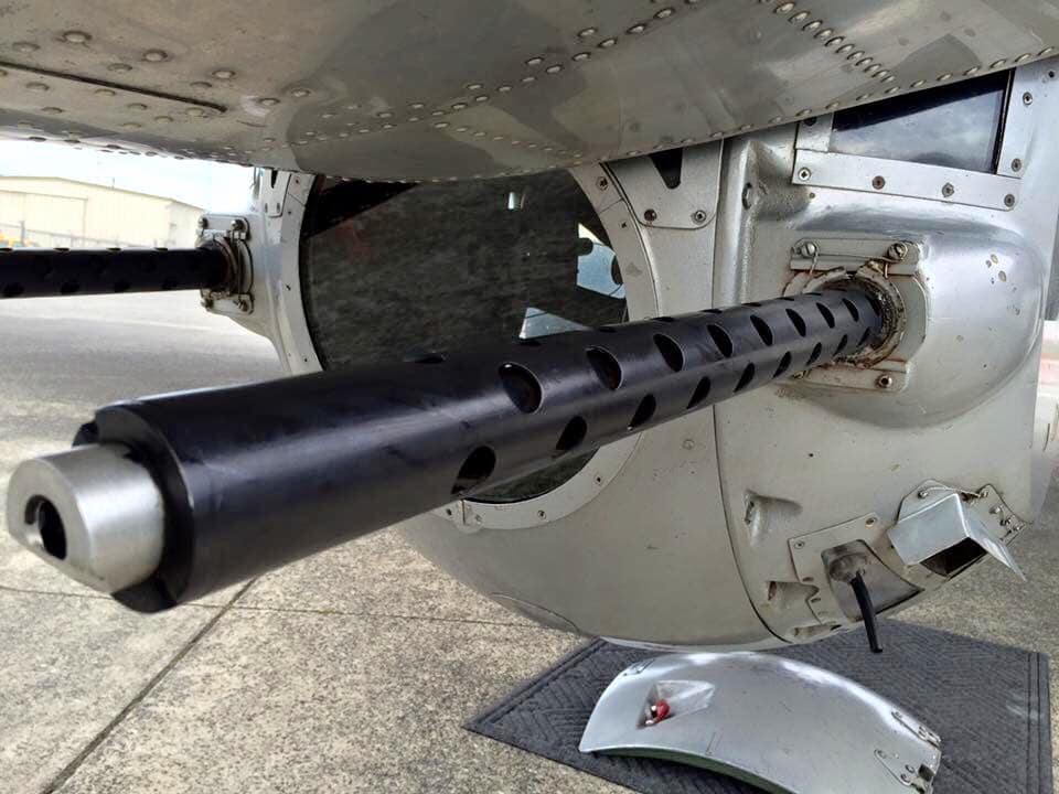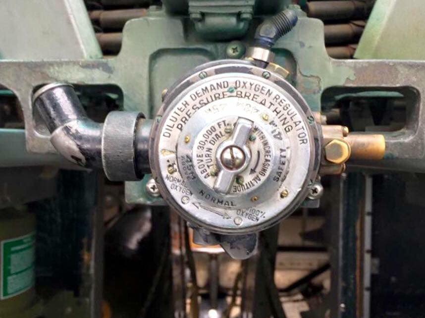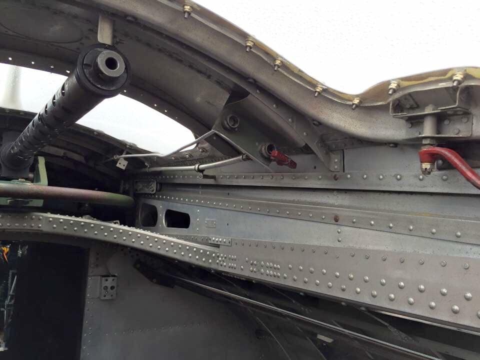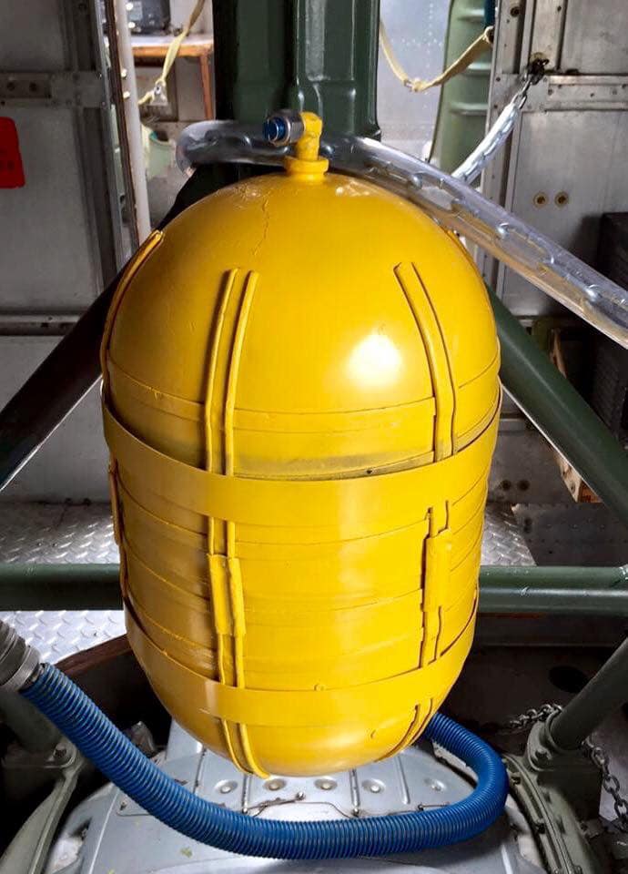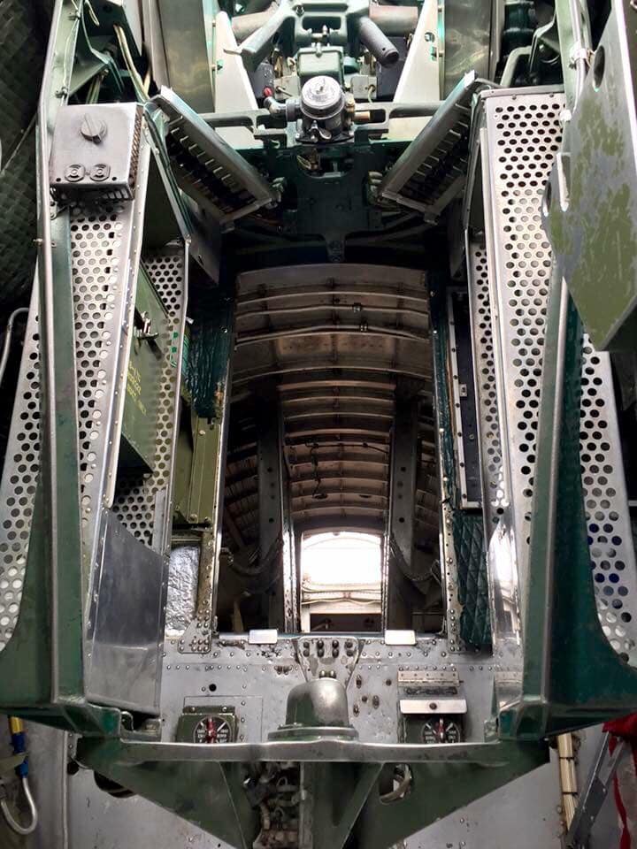 The radio room .50 cal. (either fixed mount or on a roller under the sliding radio room window) were largely done away with in the G models, but this restoration clearly has one. The ball turret gunner has gun charging handles on each side of his head, connecting joysticks with thumb buttons for controlling the turret and firing the guns, an intercom button by his left foot, foot pedals to electrically rotate the turret and adjust the azimuth, a hose to connect to his oxygen tank on the turret gimbal, and an emergency hand crank to rotate the turret in the event of a power failure. Statistically, this was not the most deadly position despite some common notions, and not all ball turret gunners were 5’4″.