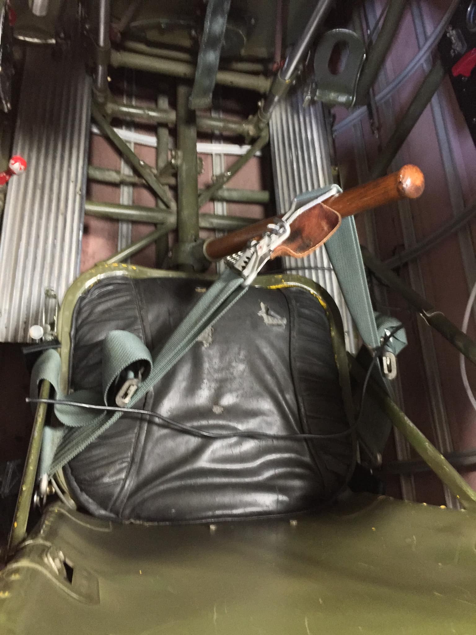 Pilot’s seat in the cockpit of the Heritage Flight Museum’s Boeing-Stearman PT-13D with the control stick secured by the seat strap. (Randy Malmstrom)