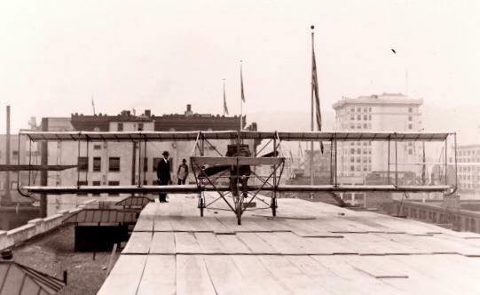 Silas Christofferson’s Curtiss Model D Pusher on a specially built deck on the roof of the Multnomah Hotel. (Portland History)
